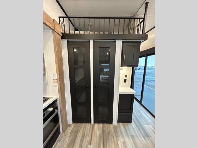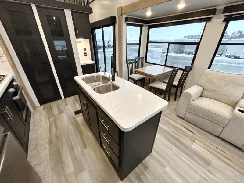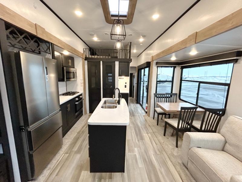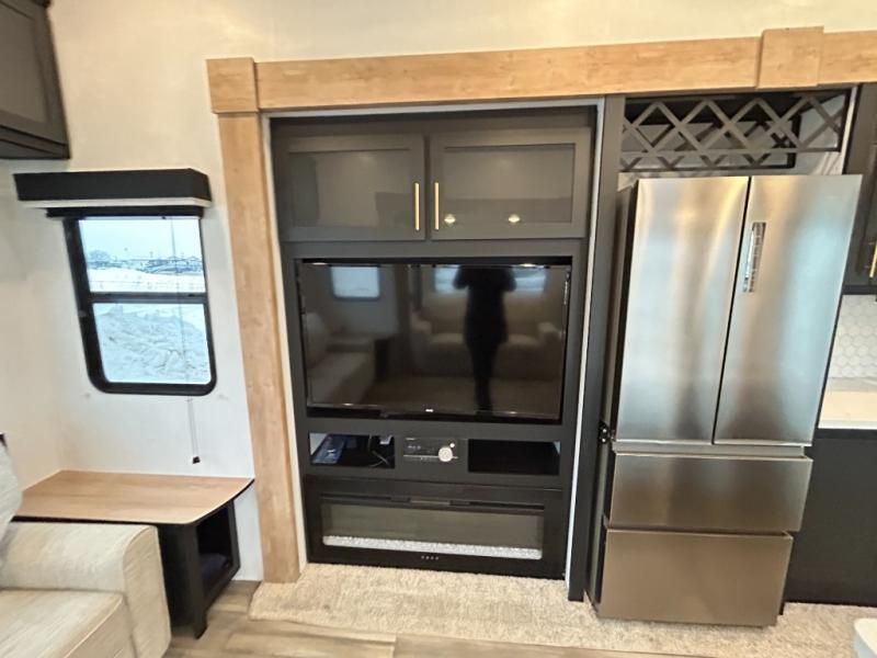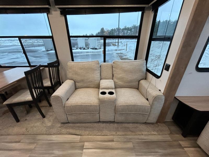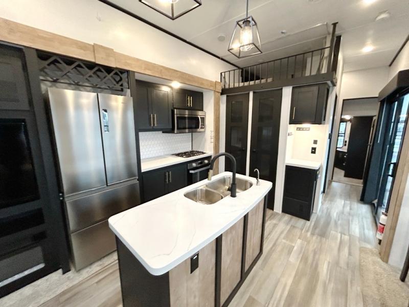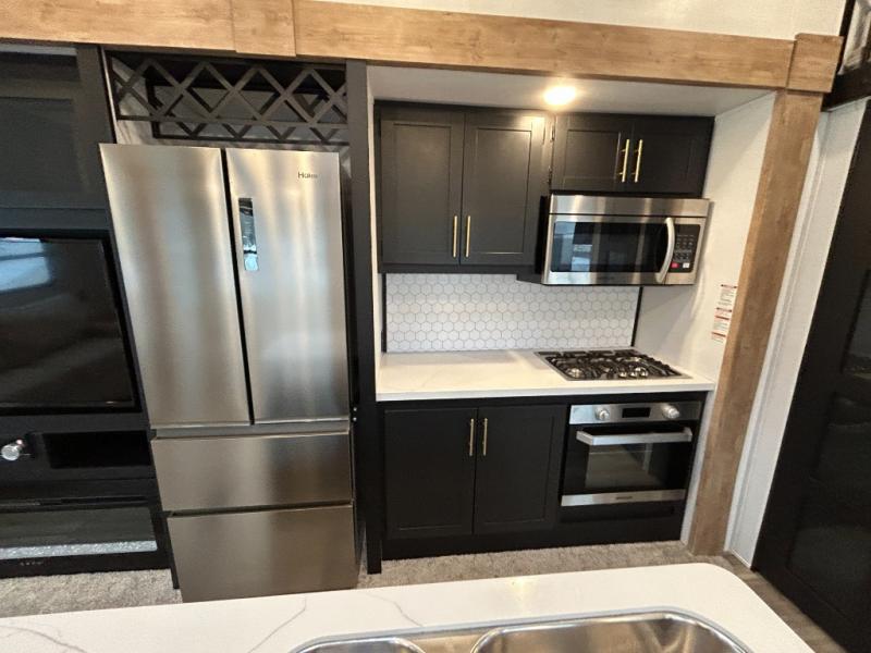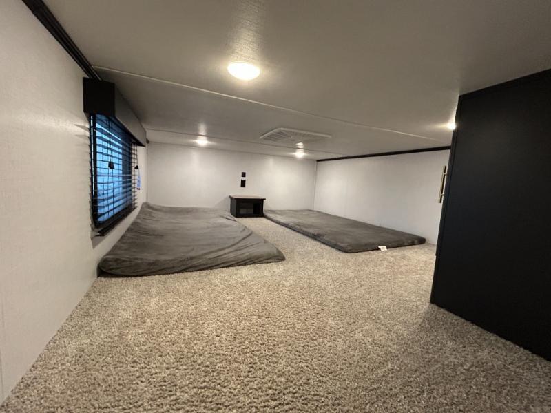 When you decide you have a favorite place to visit, park this Residence in that spot and enjoy your own comfortable accommodations during any season! This triple slide, double loft trailer gives you lots of interior floor space as well as storage and sleeping space for family and friends. There is a loft area above the full bathroom and another loft area above the front bedroom with stairs to easily access both sides, and you will find two bunk mats, a nightstand and a wardrobe. The bedroom offers a king bed slide, an armoire, and a space prepped for a washer/dryer option. The main living and kitchen area provides dual slides, a kitchen island, a double-door pantry for lots of goody storage, and a four-door refrigerator. The fireplace adds to the coziness as you relax on the sofa, the theatre seats and or at the free-standing dinette.