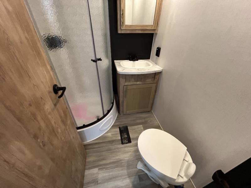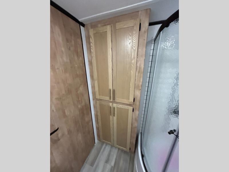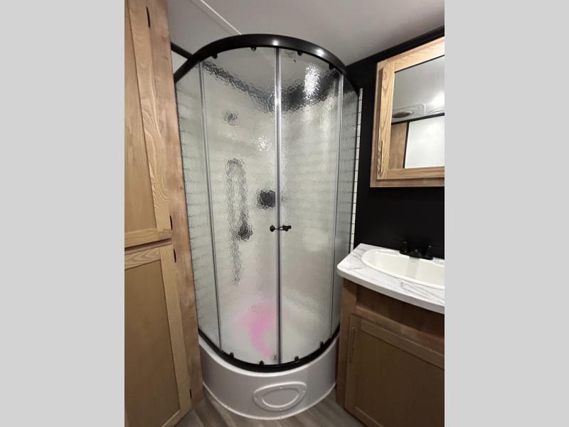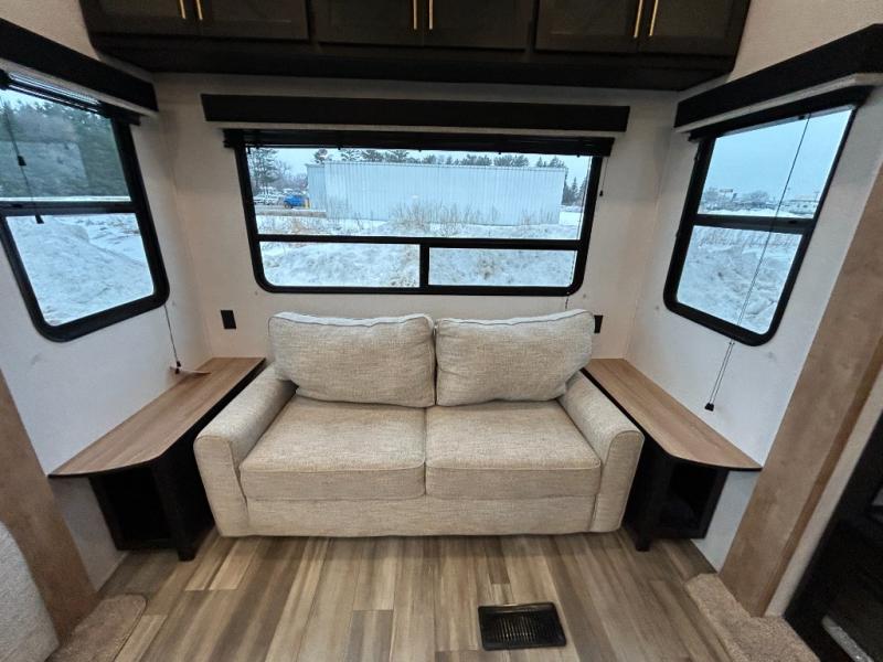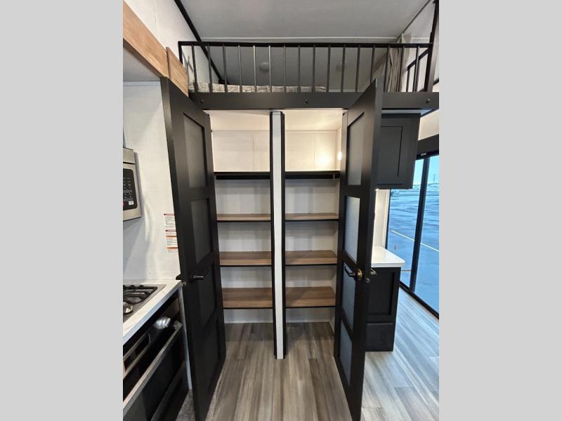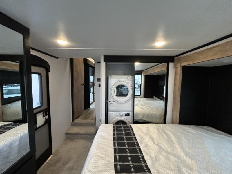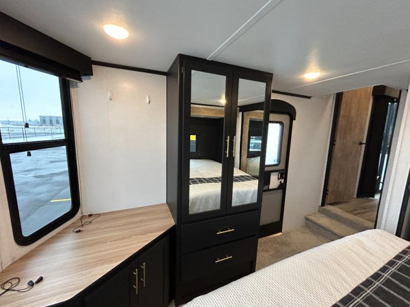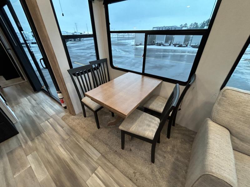 When you decide you have a favorite place to visit, park this Residence in that spot and enjoy your own comfortable accommodations during any season! This triple slide, double loft trailer gives you lots of interior floor space as well as storage and sleeping space for family and friends. There is a loft area above the full bathroom and another loft area above the front bedroom with stairs to easily access both sides, and you will find two bunk mats, a nightstand and a wardrobe. The bedroom offers a king bed slide, an armoire, and a space prepped for a washer/dryer option. The main living and kitchen area provides dual slides, a kitchen island, a double-door pantry for lots of goody storage, and a four-door refrigerator. The fireplace adds to the coziness as you relax on the sofa, the theatre seats and or at the free-standing dinette.
