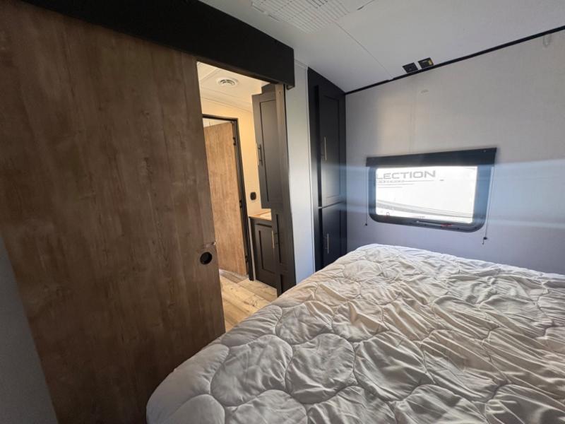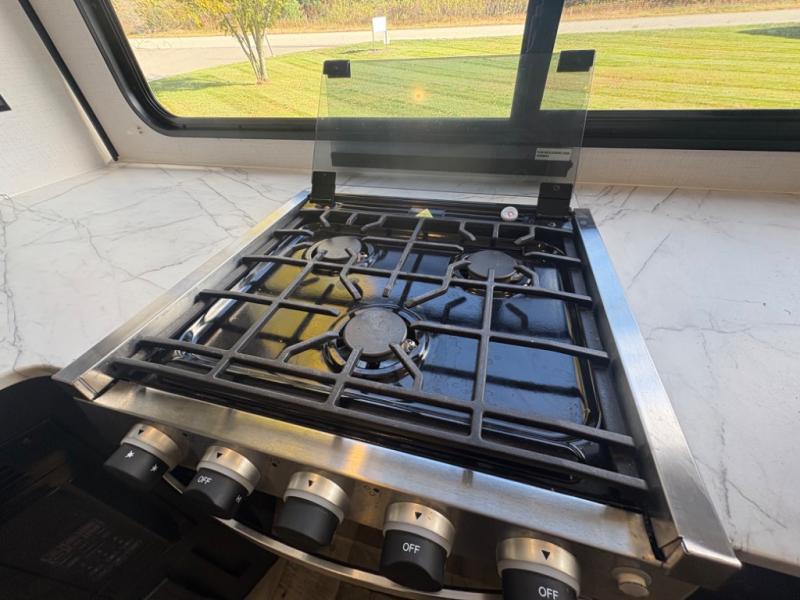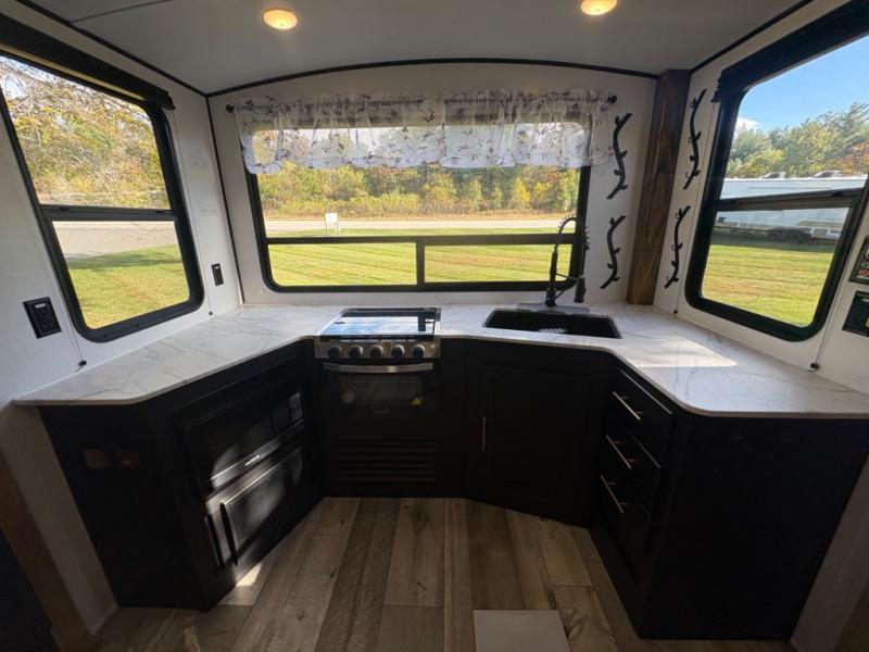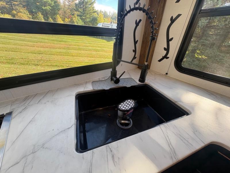 Enjoy all of your camping excursions in this rear kitchen, double slide unit that is perfect for 2-4 campers. The rear kitchen features nice countertop space, plus a great view out the panoramic window in back. Dual slides opposite each other creates an open concept feel in this combined kitchen/living area featuring comfortable theater seating, a large u-shaped dinette, plus a corner entertainment center and fireplace. There are also two pantries to hold all of your dry goods. The U-shaped dinette can easily be transformed into additional sleeping space for two. Up front, you will appreciate the private bedroom featuring a queen bed with dual closets, overhead cabinets and two shelves for your things. The walk-through bath is spacious as it is the entire width of the unit and provides a nice shower, toilet, sink and closet. Outside, enjoy the 12' awning that offers added living space and a front pass-through storage compartment will easily house all of your outdoor camping gear.