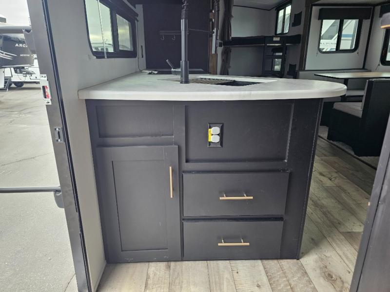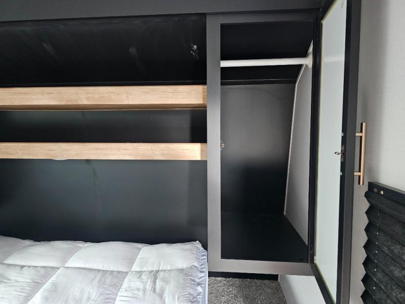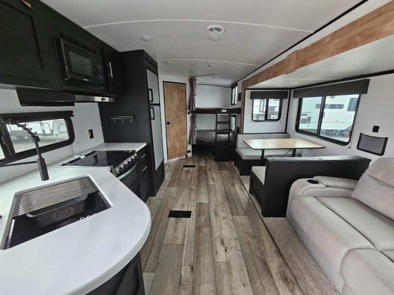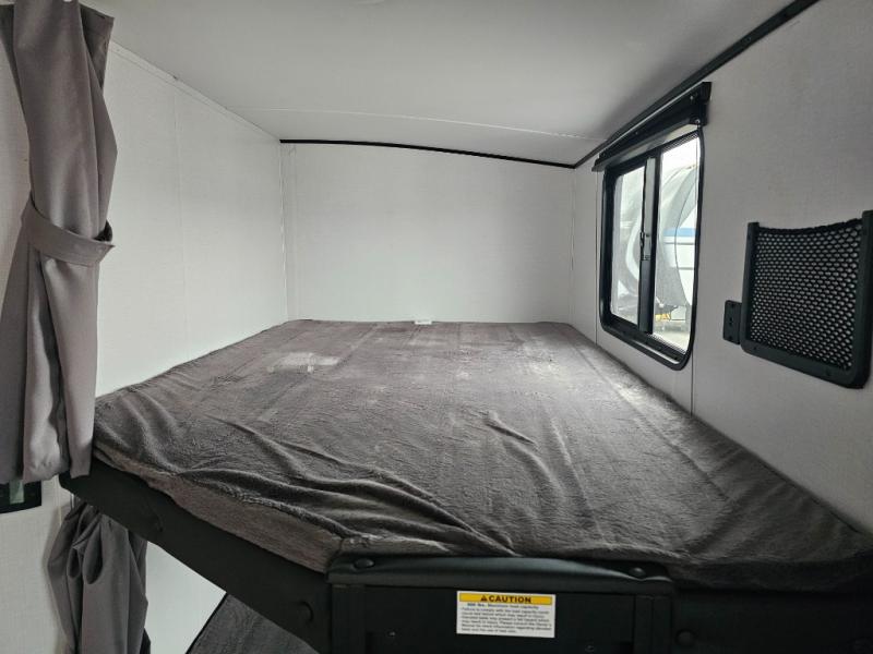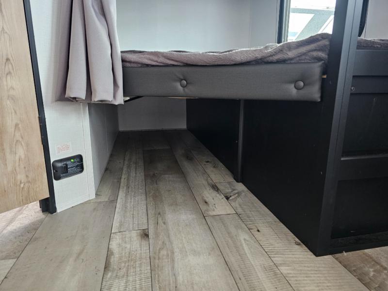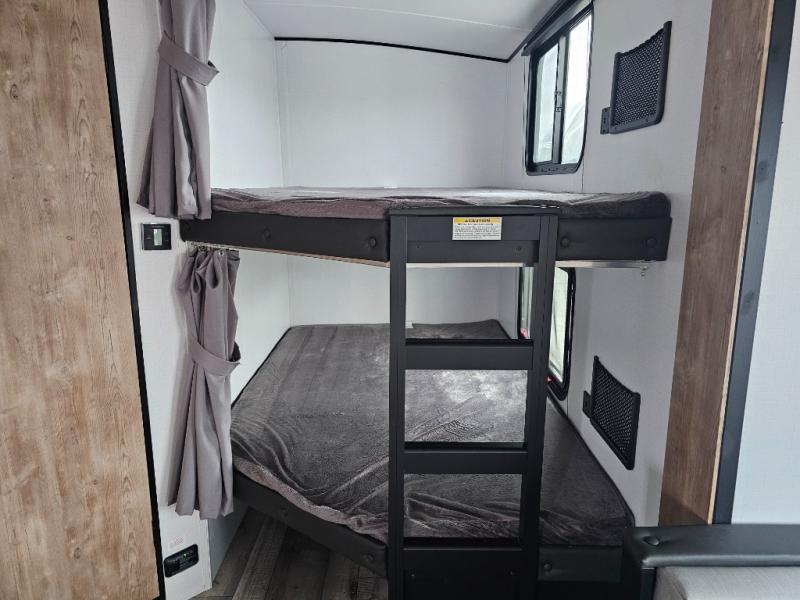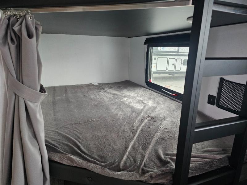 For the larger group, this Springdale is the perfect travel trailer because it features a set of double-size bunks, two entry doors, a large slide out, and sleeping for nine people. Step inside using the main entry and see just how spacious the combined kitchen and living area are. For a quiet retreat, enjoy the front bedroom where you can expect to get a great night's rest. The back of this trailer contains a set of double-size bunks that the kids or your friends will surely love. Or, you can easily take along extra guests. There is a convenient ladder to access the top bunk, and you will also enjoy the front exterior pass-through storage compartment for all of your outdoor camping gear.