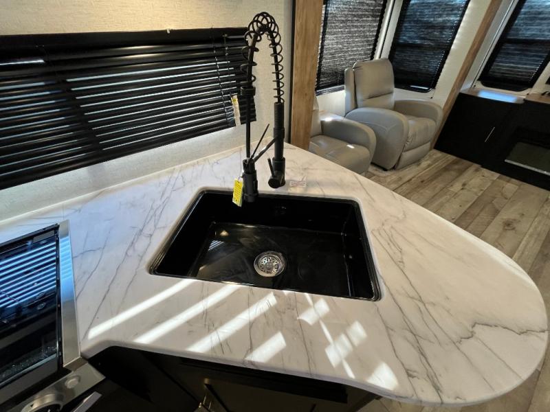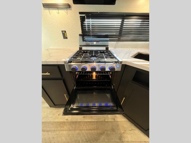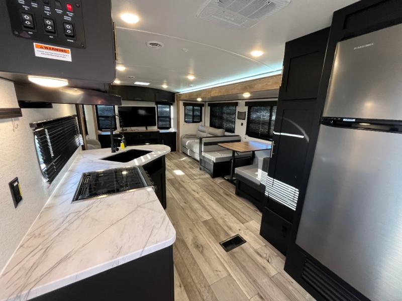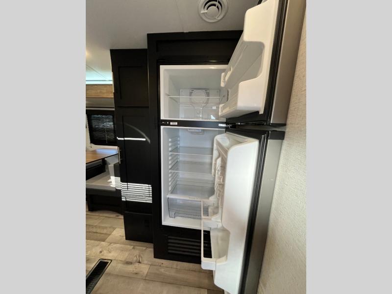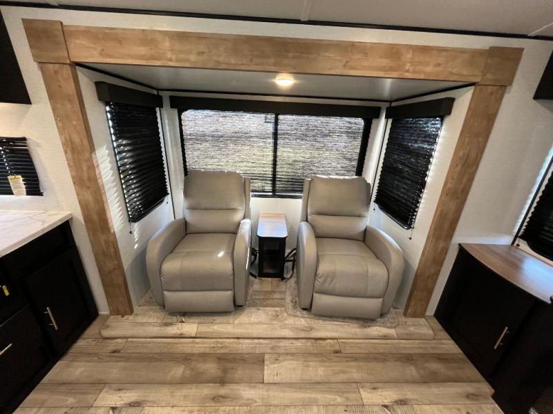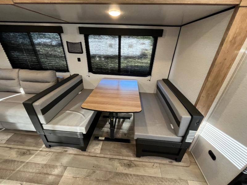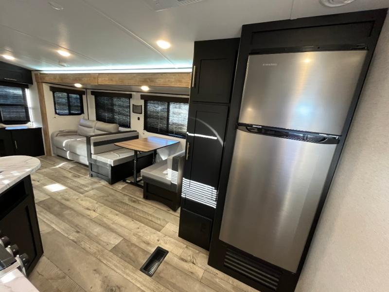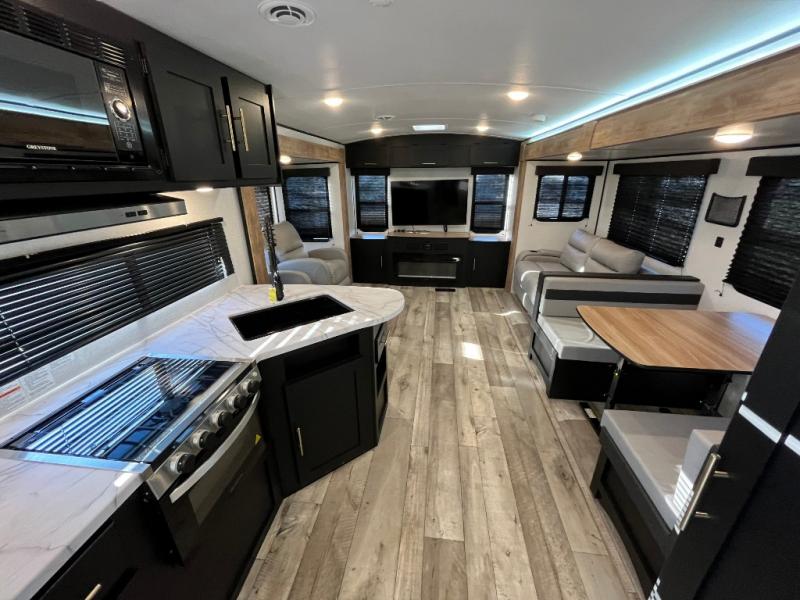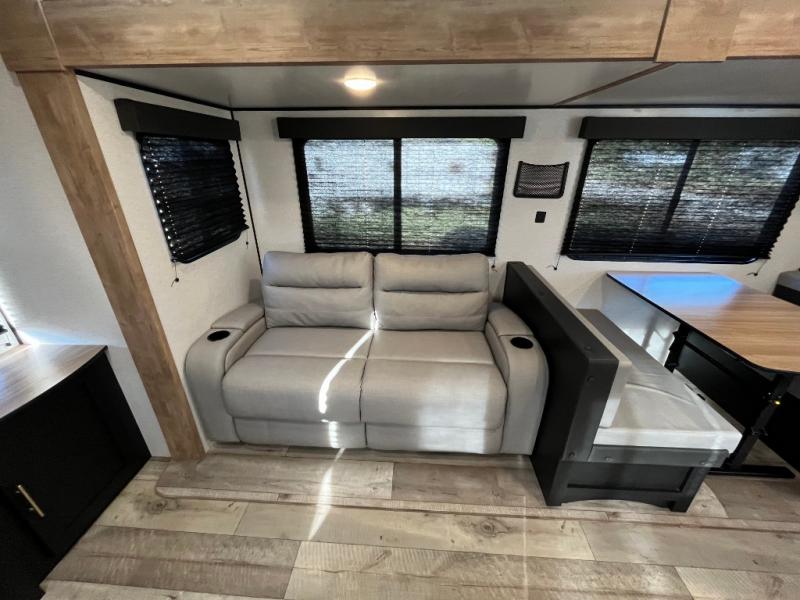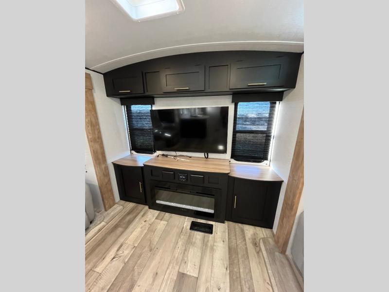 When you enjoy inside comforts as much as the outdoor scenery, you will love this trailer at any campsite! There is a full-width entertainment center and a fireplace along the rear wall for a perfect view from anywhere in the main living and kitchen area. You can choose from a few places for relaxing, eating your meals, or just enjoying one another's company with the two recliners and an end table between them, the tri-fold sleeper sofa, and the booth dinette. The chef in the kitchen will enjoy having a place to cook all of the family's favorites, and after a long day of adventuring, you will have the private front master bedroom with a queen bed for a good night's rest.