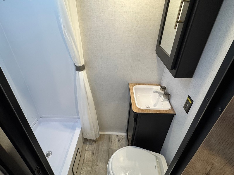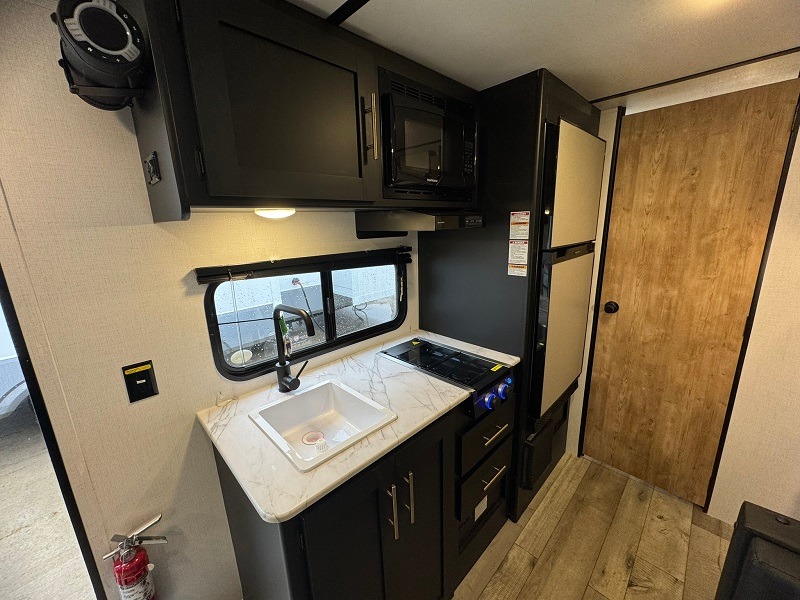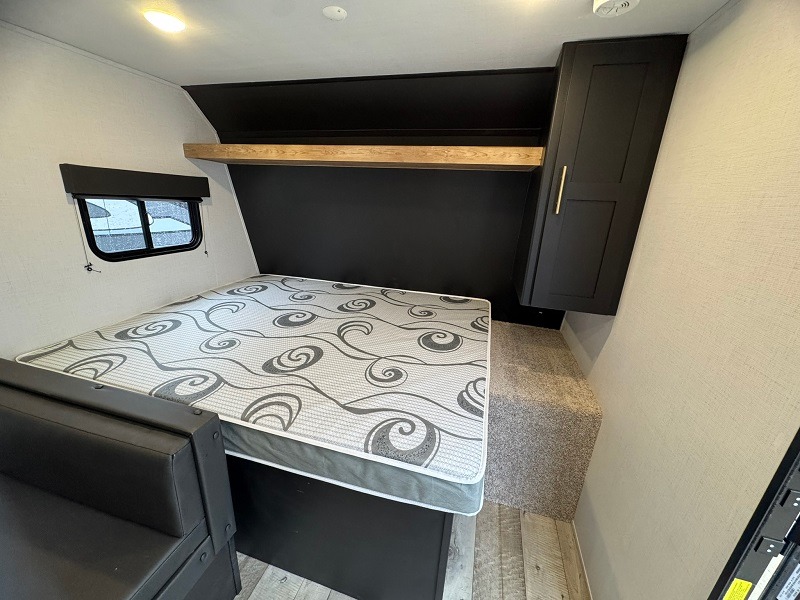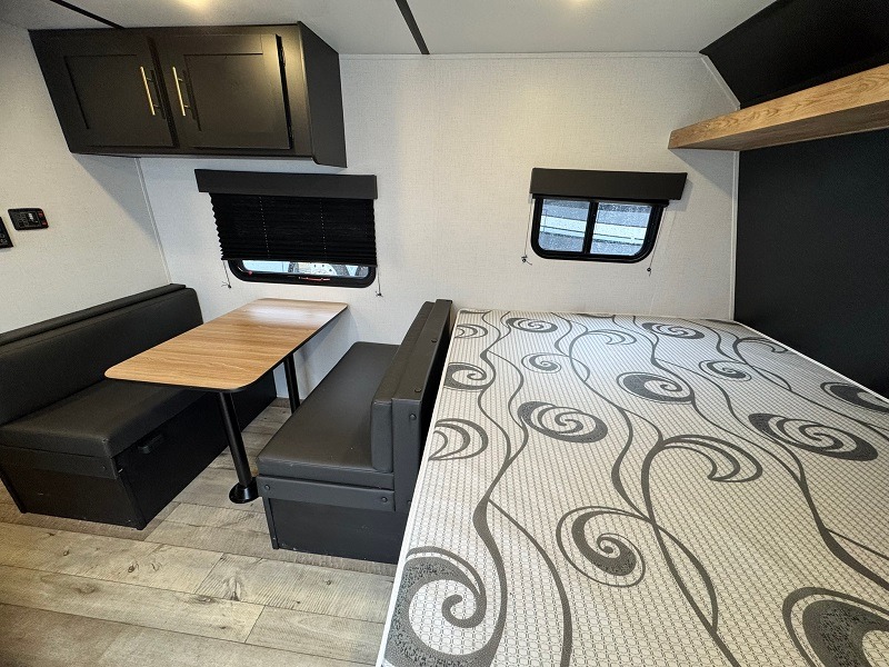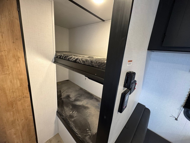 Get ready for outdoor fun with your favorite people when you have this trailer in tow! Once at your campsite, you can easily setup the 10' power awning, grab your camping chairs from the pass-through storage, and relax or start playing. The cook will love the galley kitchen with the two burner cooktop, plus the pantry and 6 cu. ft. refrigerator to stow away all the food. If you like, you can eat inside at the booth dinette which doubles as sleeping space, and of course the kids will love the bunk beds next to the full bathroom. And you will sleep like a queen up front.