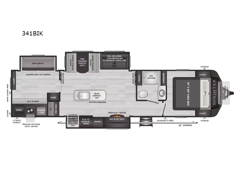 This Sprinter Limited travel trailer is a comfortable trailer that offers you a private sleeping space in the front, and it also offers your friends or your kids their own space in the back with the private bunkhouse. This bunkhouse includes a slide out, a sleeper sofa with storage below a bunk, a 36" x 74" bunk on the other side of the room, a closet, a wardrobe, and a barn door to shut it off from the rest of the trailer. The main living area has opposing slides to add more space for gathering together in the kitchen around the island, and you can rest on the full-reclining theater seating with massage, lights, and USB as you watch the pop-up 50" LED HDTV. You have a booth dinette with hinged storage access so that you can keep your board games and kitchen essentials hidden away, and the full bathroom includes a residential shower to ensure that you have enough room to get clean.