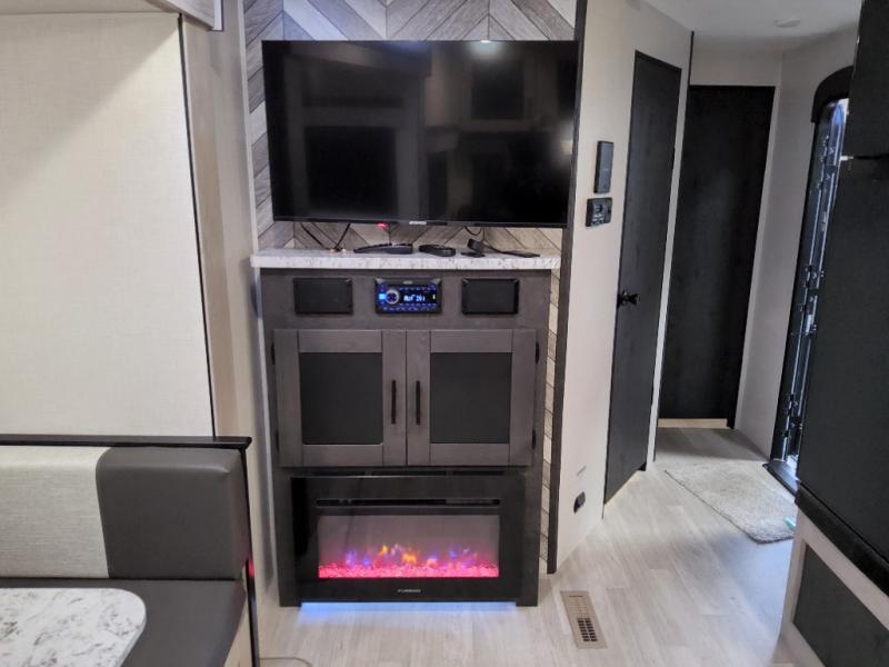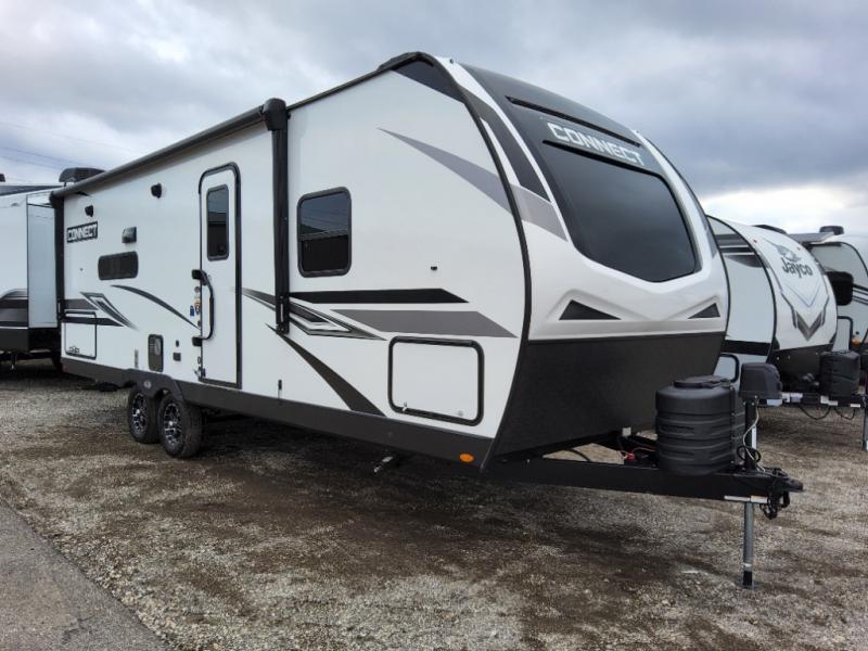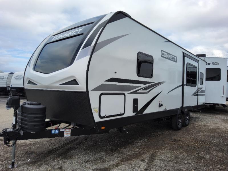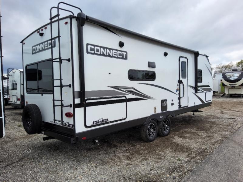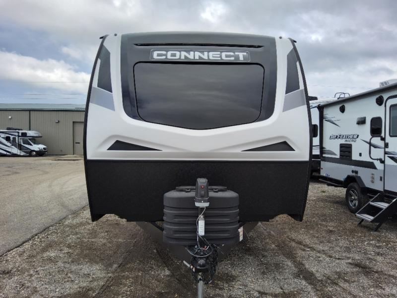Hitch up this Connect travel trailer and head out for a fabulous weekend away! You will enjoy added space in the living area because of the single slide that holds the booth dinette, and another convenient feature is the dual-entry bathroom that can be accessed from the main hallway or the bedroom. You will be quite surprised to find a king-size bed inside the bedroom, but you will be immensely happy that it's there come bedtime. A pass-through storage on the exterior allows you to bring along extra gear, and the interior is kept cozy on chilly fall evenings with the 30" fireplace.