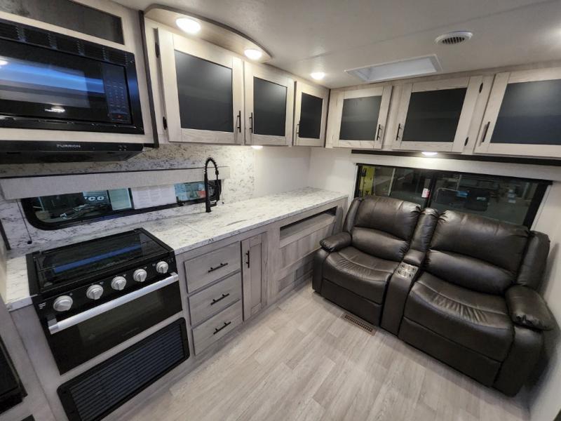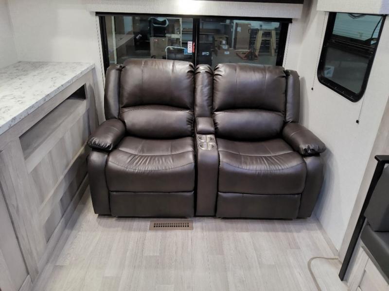 The KZ Connect travel trailer comes with an RV Airflow System which optimizes the airflow for your air conditioner by increasing the airflow by an average of 40%. This improves performance, speeds up cooling times, and reduces noise in your trailer. Some of the other helpful features found on the Connect are the heated, insulated, and enclosed underbelly, the exterior docking station, the fiberglass front cap with front windshield, the 82" interior ceiling height, and the protective front diamond plate. There are some useful technological features, like the two LED motion-sensor lights, the HDMI and USB charge, and the multi-media entertainment system with a DVD player. The KZ Engage is powered by OneControl, and it monitors battery levels and controls slide rooms, the leveling system, the awning, inside/outside lighting, and the TPMS prep.