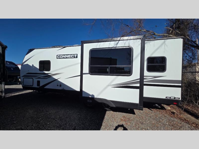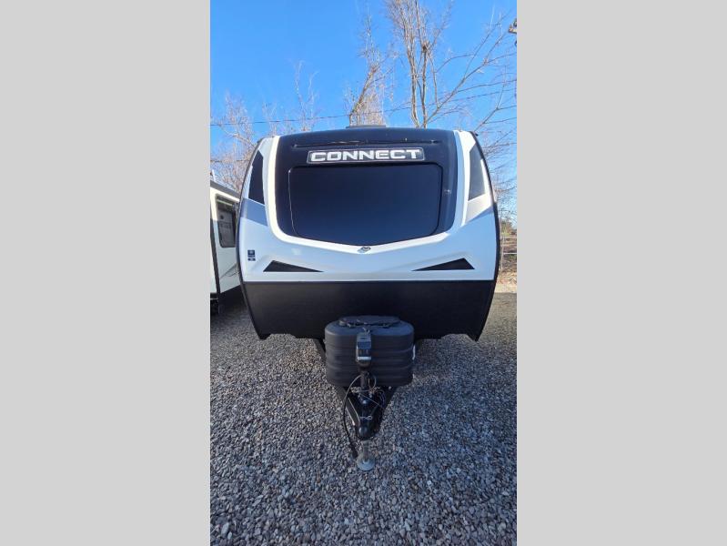 Hitch up this Connect travel trailer and head out for a fabulous weekend away! You will enjoy added space in the living area because of the single slide that holds the booth dinette, and another convenient feature is the dual-entry bathroom that can be accessed from the main hallway or the bedroom. You will be quite surprised to find a king-size bed inside the bedroom, but you will be immensely happy that it's there come bedtime. A pass-through storage on the exterior allows you to bring along extra gear, and the interior is kept cozy on chilly fall evenings with the 30" fireplace.