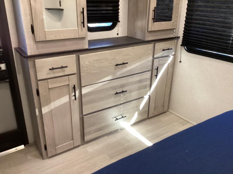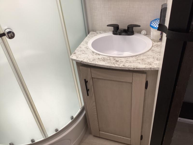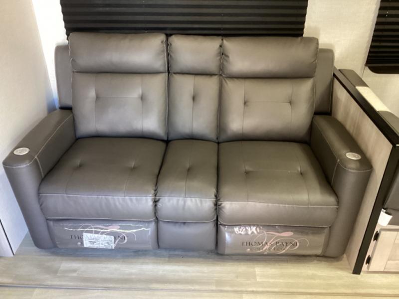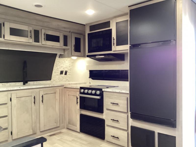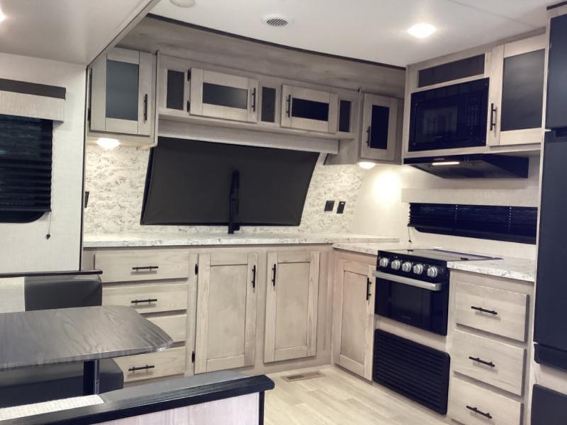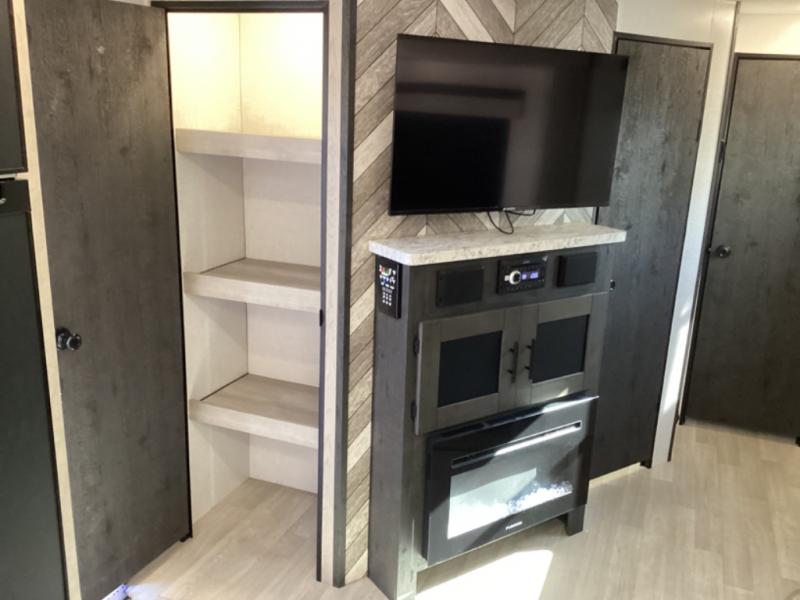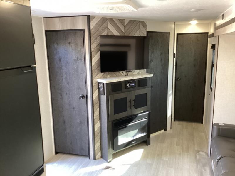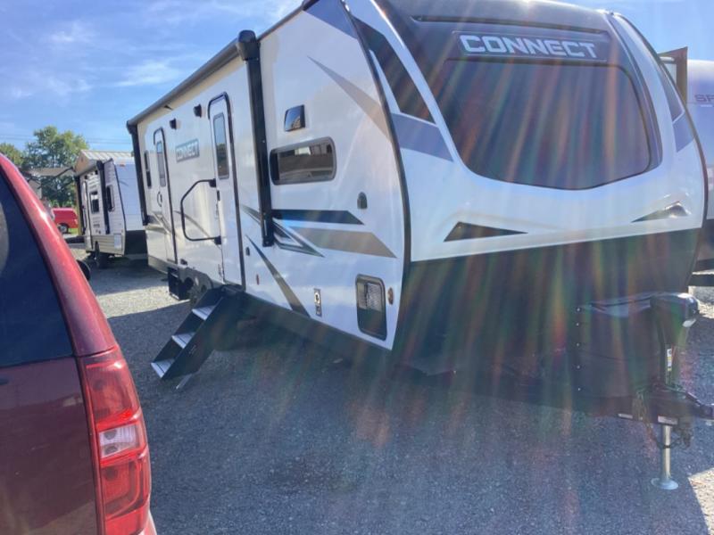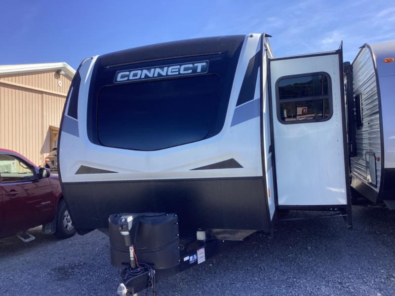 You can use this Connect travel trailer whenever you want to get away! You will remain comfortable each night sleeping in the rear master suite, and this bedroom area even has the second exterior entry door so that you can slip out for your morning run easily. The front kitchen has a full-width countertop for lots of extra space to chop veggies and prep meals, and the large slide in the main living area holds the booth dinette and 70" sofa. These pieces of furniture rest across from the fireplace for a cozy evening with a cup of coffee, and there is a walk-in pantry where you can grab snacks.