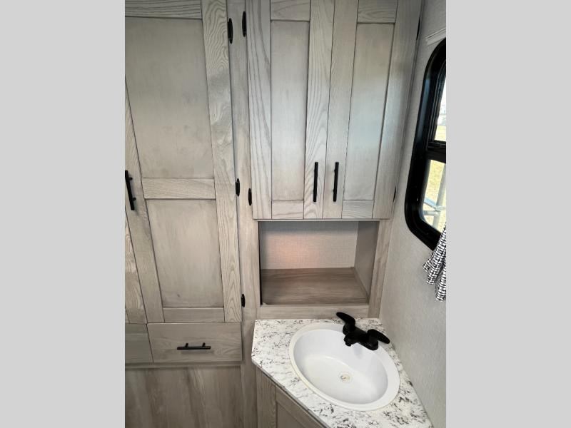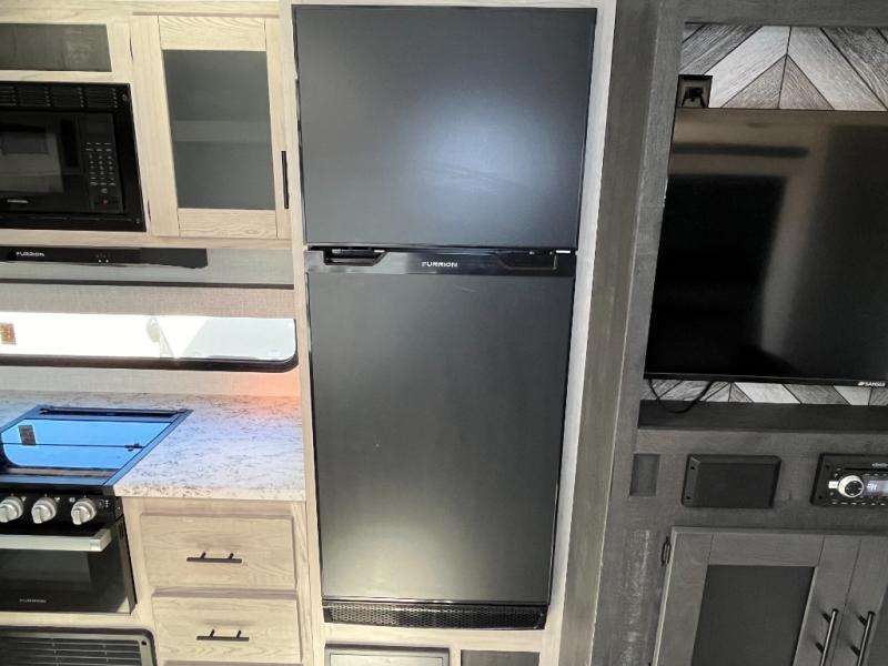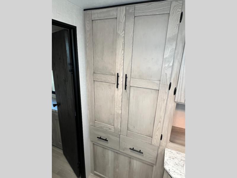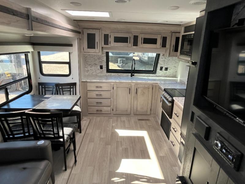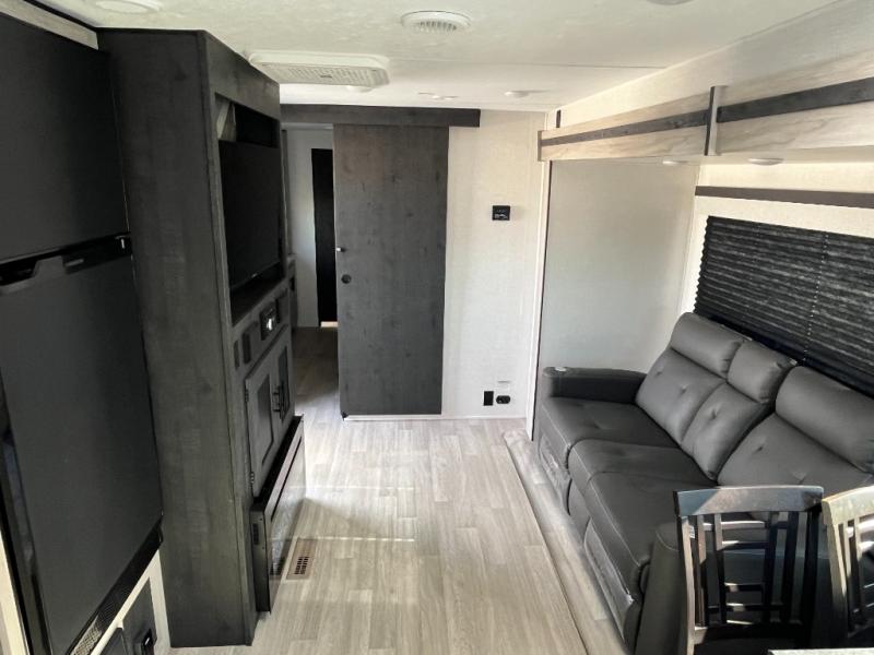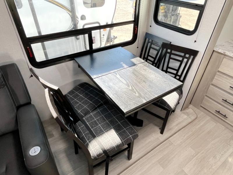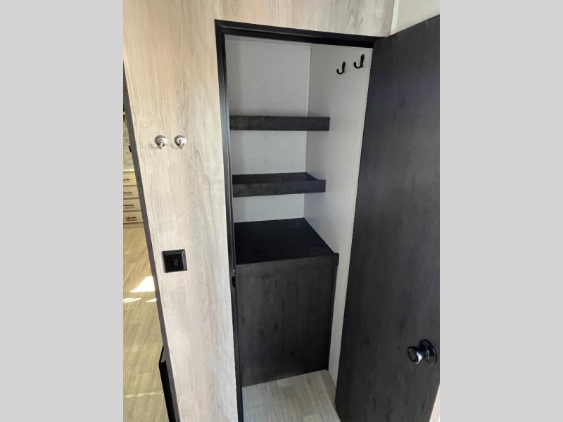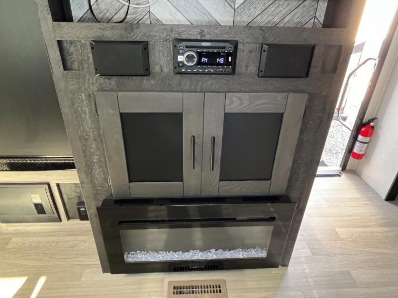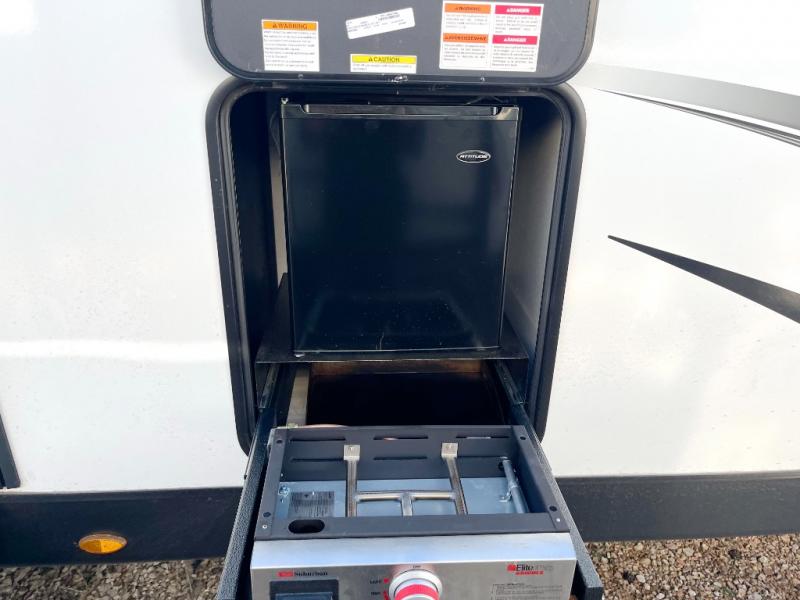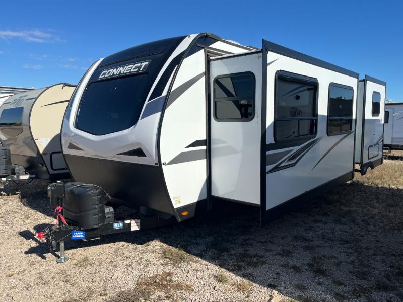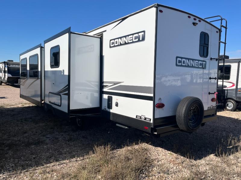 You can use this Connect travel trailer whenever you want to get away! You will remain comfortable each night sleeping in the master suite with a spacious full rear bath where you can freshen up each day. There is also a wardrobe with washer and dryer prep, plenty of counter space, and a wardrobe with outside storage for hiking gear. The front kitchen has a full-width countertop for lots of extra space to chop veggies and prep meals, and the large slide in the main living area holds the booth dinette and 70" sofa. These pieces of furniture rest across from the fireplace for a cozy evening with a cup of coffee, and there is a hidden pantry where you can grab snacks.