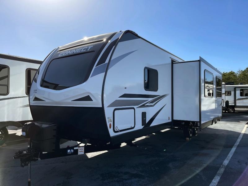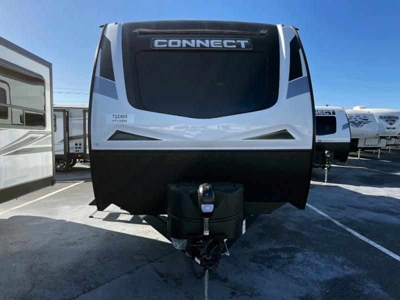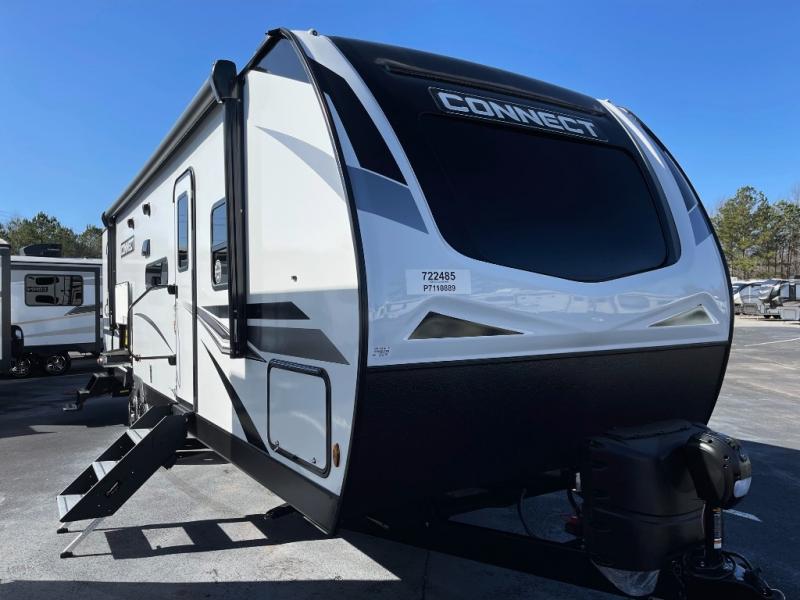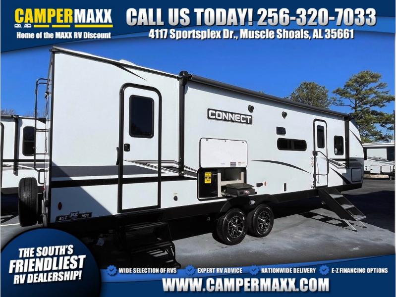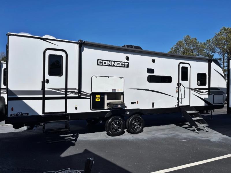 If you need lots of sleeping room for a large group of friends or a big family, this Connect travel trailer was made just for you! There is a set of double-size bunks, a 64" sofa, a U-shaped dinette, and a Serta Comfort foam king mattress. While you're outside cooking at the outdoor kitchen, you will be able to conveniently access the full bathroom directly because of the second exterior entry door that leads right into it. The exterior is also outfitted with other goodies like the two trunk doors, an 18' power awning with LED lights, exterior speakers,, and a pass-through storage compartment.