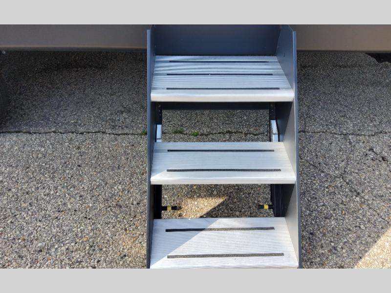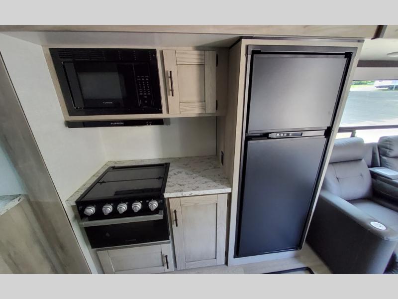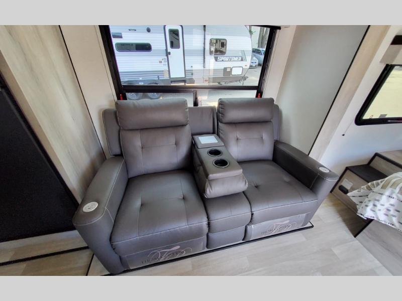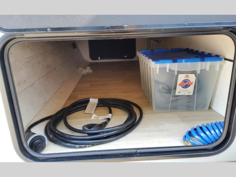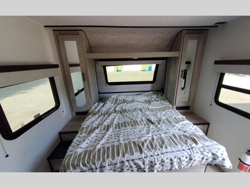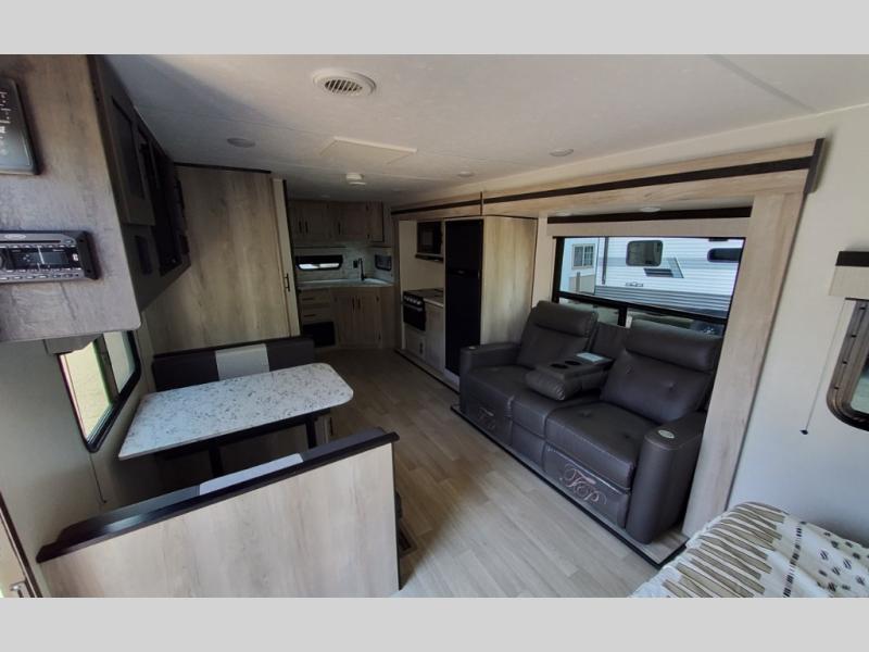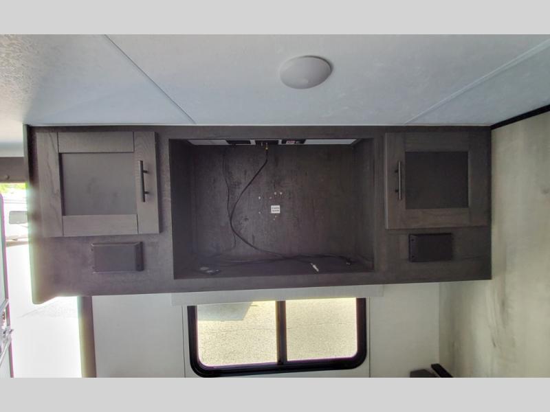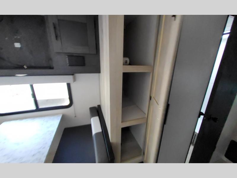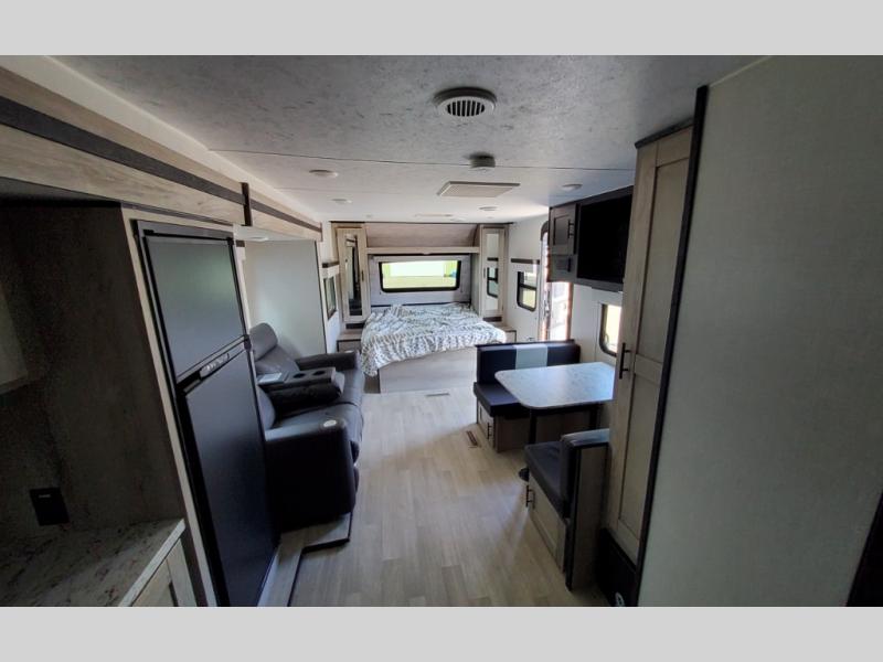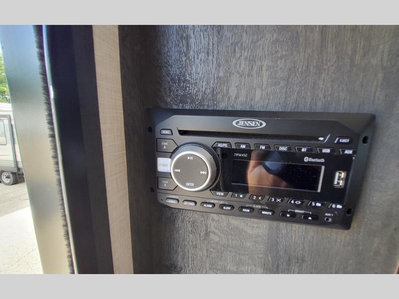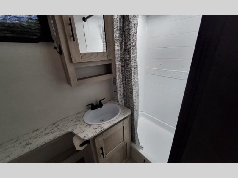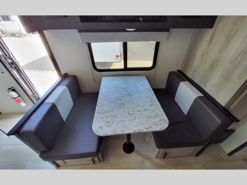 Travel on weekends, weekdays or whenever you want with this spacious trailer that has a large slide out that holds the theater seats with cupholders and USB ports, the 10 cu. ft. refrigerator, and the cooking appliances. The rear corner has the kitchen sink and more counter space, giving the cook plenty of space to whip up camping meals. You can dine at the booth dinette or outside under the 18' power awning after grabbing your camping chairs from the pass-through storage. At night, get cleaned in the full bathroom with a nice amount of counter space for your toiletries, and fall quickly to sleep on your own queen bed up front with dual wardrobes for your clothing.