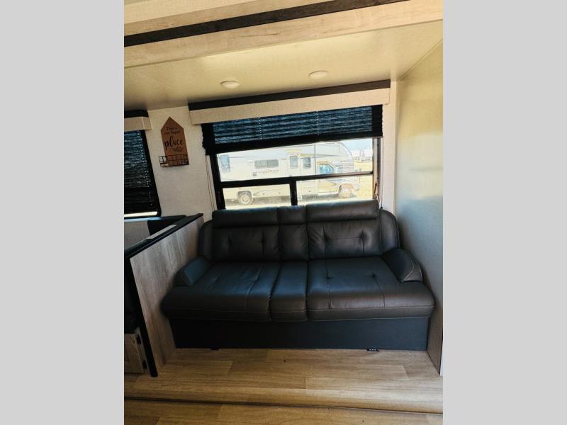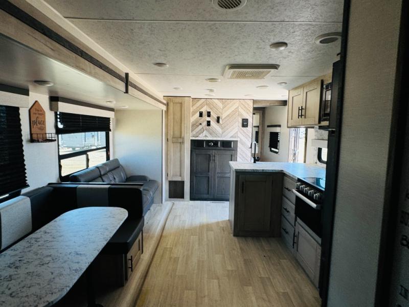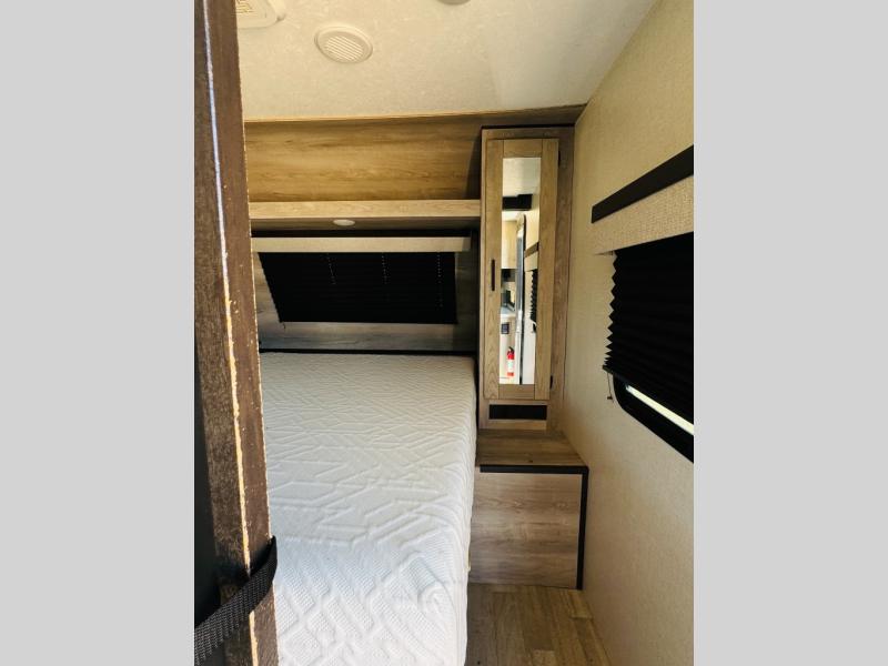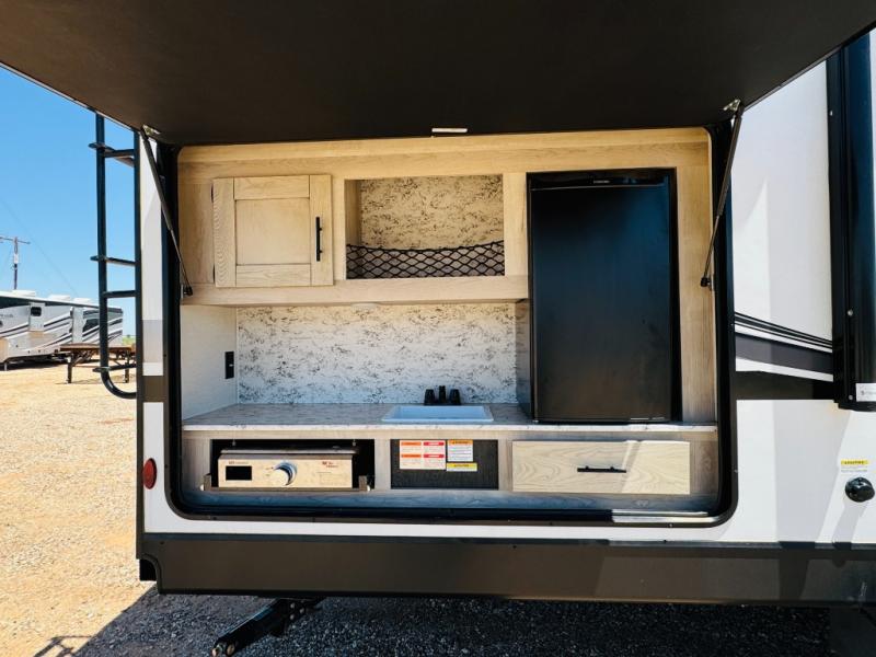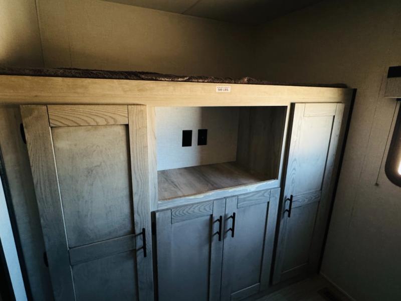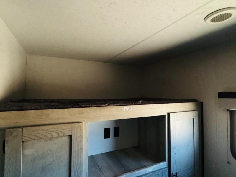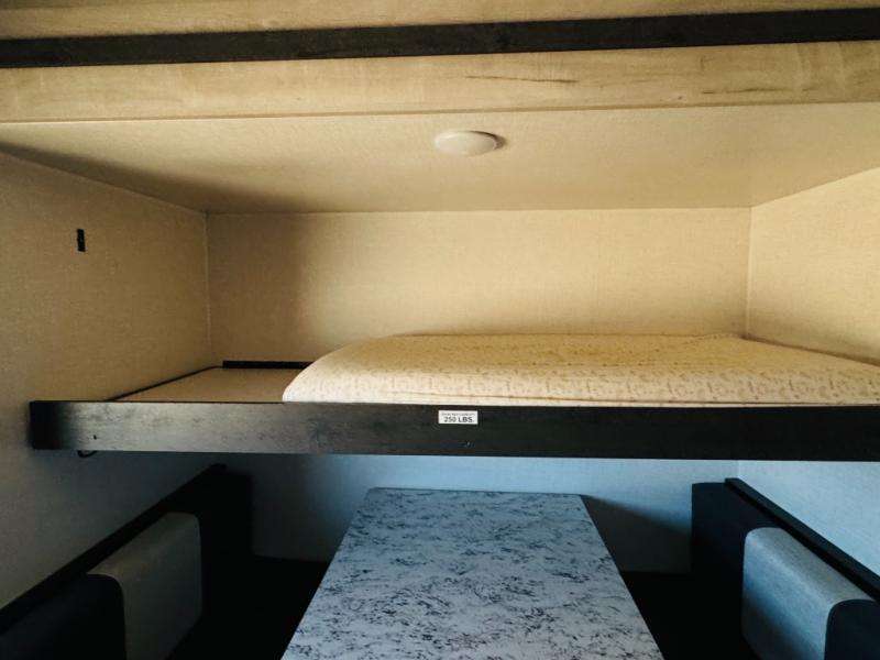 Your kids or your friends will love having their own privacy in the rear bunkhouse which offers two bunks and a dinette to play games or dine at, plus there is a closet for their storage. The full bathroom is conveniently located and includes the second exterior entry for quick and easy access to the fun happening outside. You will have your own private bedroom on the opposite side of the trailer, and it includes a walk-around queen bed, dual wardrobes and a sliding entry door. The main living and kitchen area is spacious with a large slide out, and you can relax on the 64" sofa or the 80" U-shaped dinette while the cook makes meals with full amenities including a 10 cu. ft. refrigerator and a pantry for food storage.