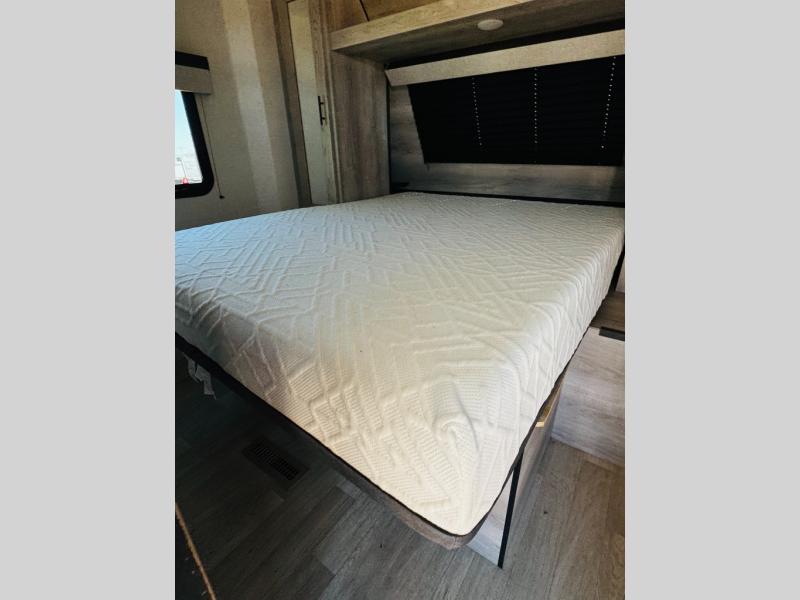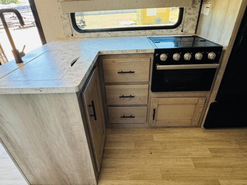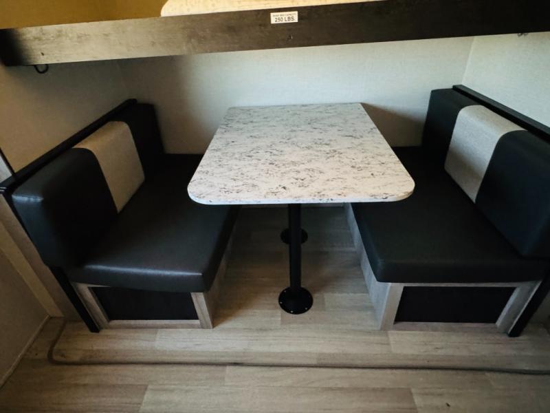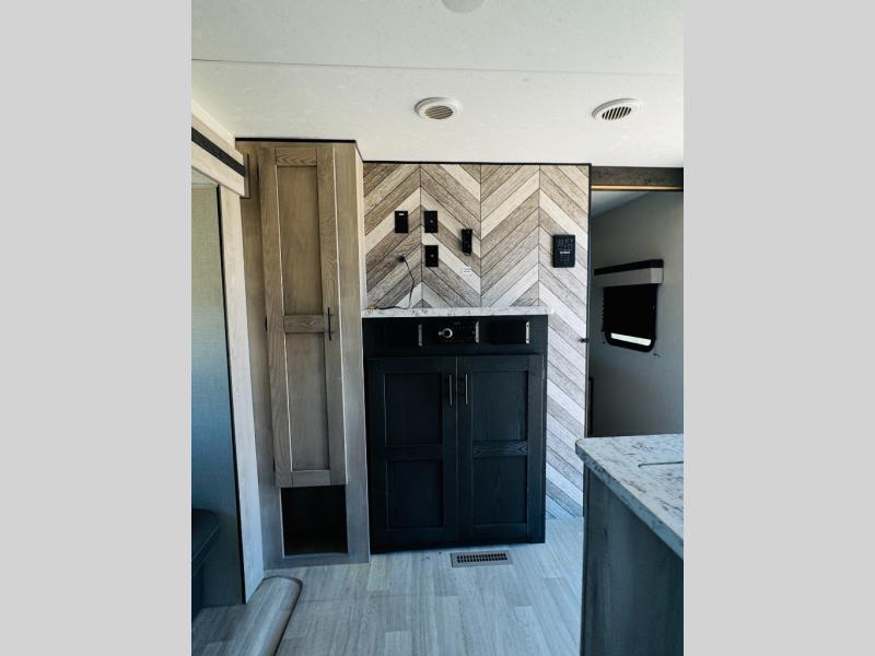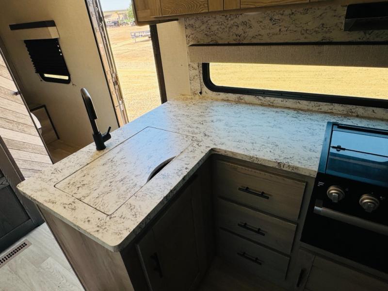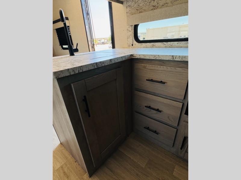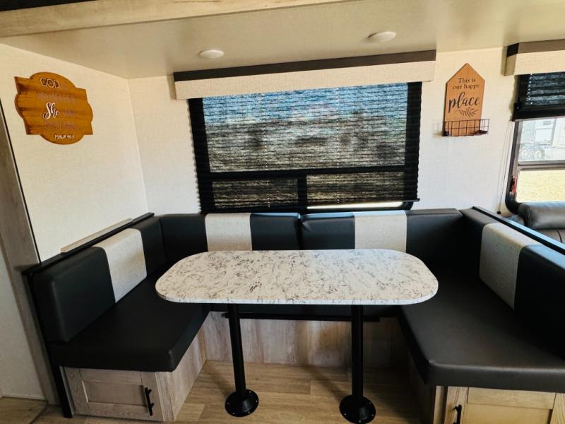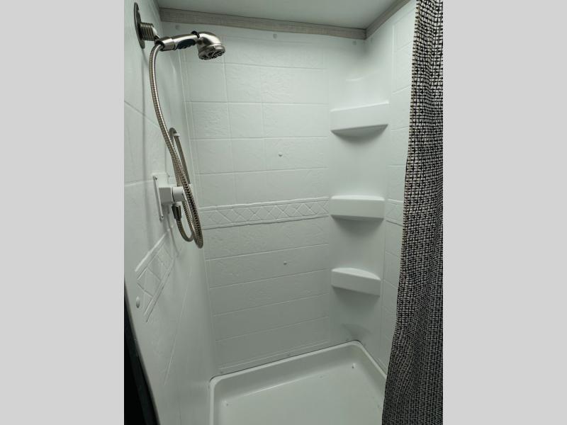 Your kids or your friends will love having their own privacy in the rear bunkhouse which offers two bunks and a dinette to play games or dine at, plus there is a closet for their storage. The full bathroom is conveniently located and includes the second exterior entry for quick and easy access to the fun happening outside. You will have your own private bedroom on the opposite side of the trailer, and it includes a walk-around queen bed, dual wardrobes and a sliding entry door. The main living and kitchen area is spacious with a large slide out, and you can relax on the 64" sofa or the 80" U-shaped dinette while the cook makes meals with full amenities including a 10 cu. ft. refrigerator and a pantry for food storage.