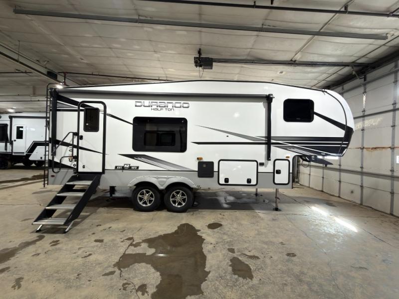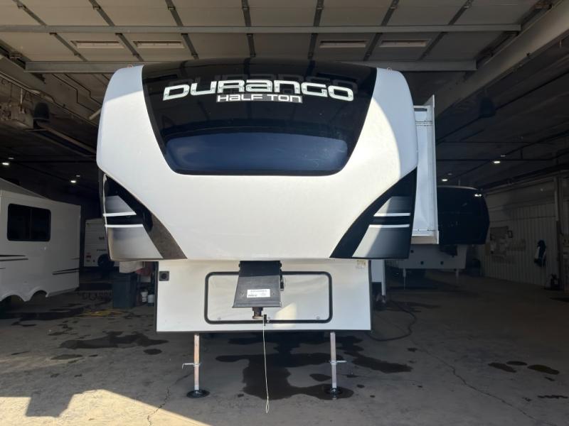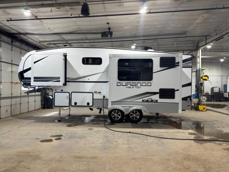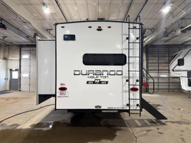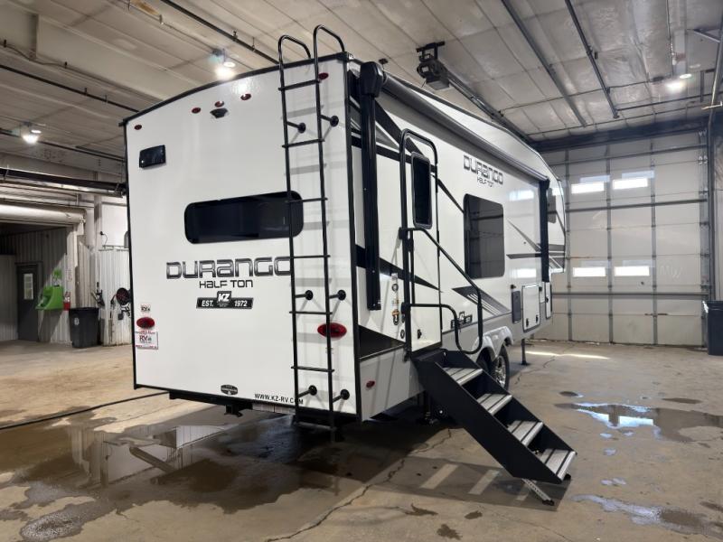 With any Durango Half-Ton fifth wheel by KZ you will enjoy lightweight towing at an affordable price! Controlling the functions of your unit will be a breeze with the KZ Engage powered by OneControl that includes a 5" touchscreen to control awnings, lights, tanks, and more. There are so many exterior conveniences to make each trip enjoyable, like the 2" towing receiver hitch with a four-pin wire harness connection, the metal latches on the baggage doors, the fully-finished, heated and sealed basement storage compartment, and the list goes on! Step inside to find modern farmhouse cabinetry, solid hardwood slide out fascia, seamless countertops with a deep undermount stainless steel sink, and many more at-home comforts. You can further customize your fifth wheel by adding one or more of the many options that are available, like the full-timers hardwood desk in place of the dinette table, the 32" exterior TV with a bracket, and the four-point auto electric leveling to name a few!