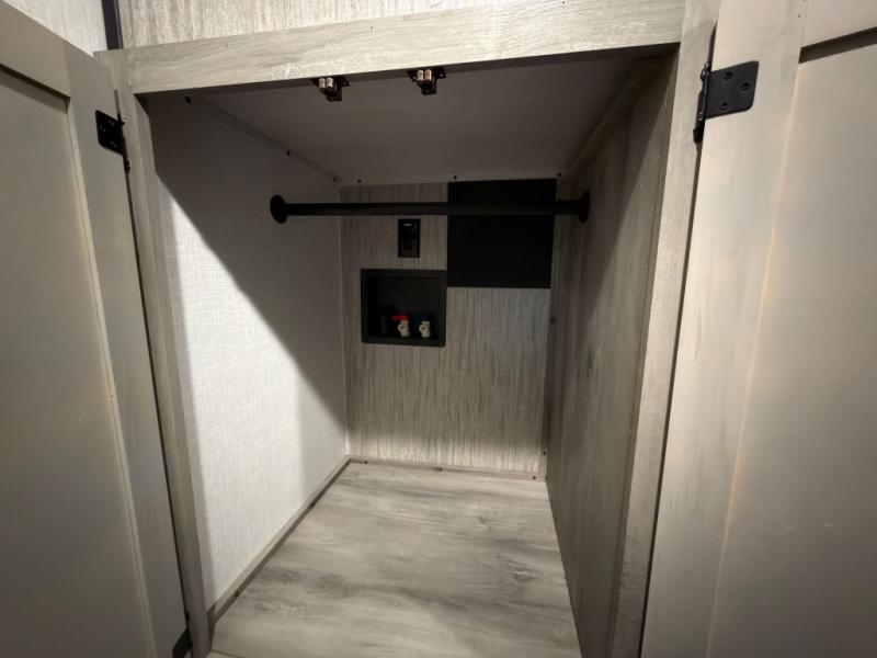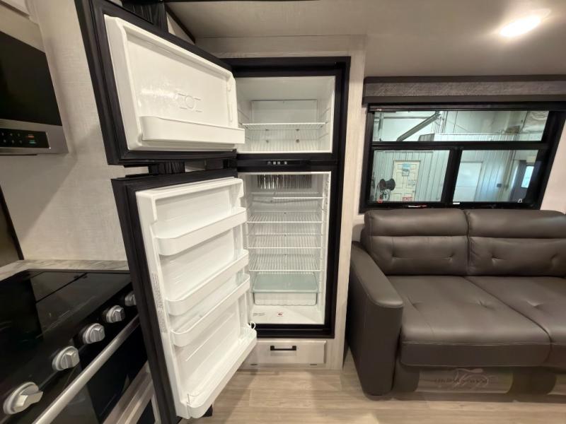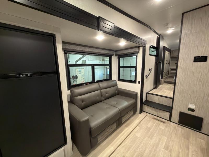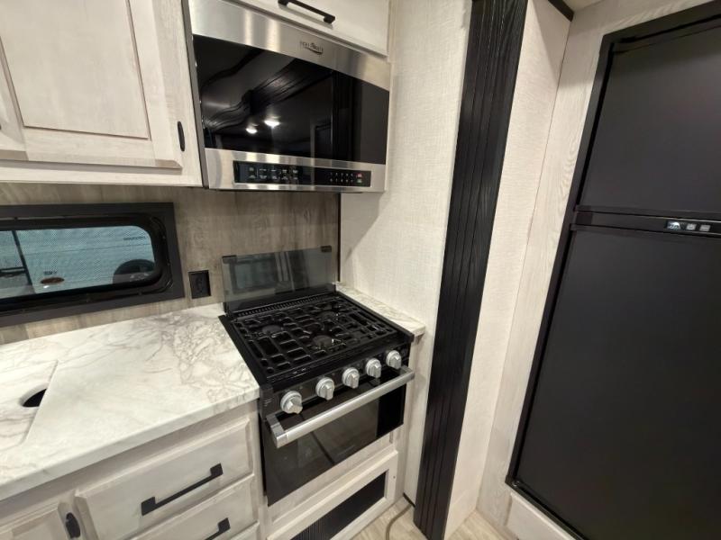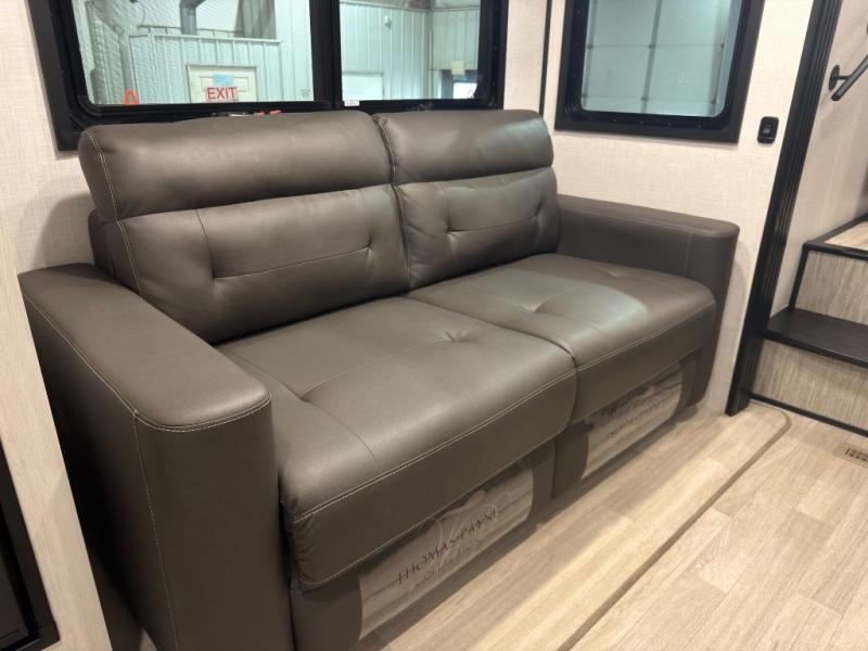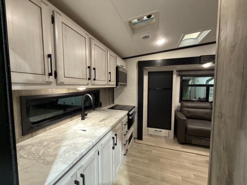 This rear kitchen fifth wheel is perfect for weekend trips to the lake. You will love how much counter space you have in the kitchen, as well as a pantry to store dry goods, a three burner drop-in cooktop with a glass cover, and a 8 cu. ft. gas/electric refrigerator. Your crew can relax on the hide-a-bed sofa or play a game at the booth dinette after dinner is done, or you can head outdoors to visit under the 18' power awning. Choose the theater seating option in place of the hide-a-bed sofa if you're not needing the additional sleeping space. The front private bedroom will make you feel right at home with its queen bed, slide out wardrobe, and a closet with washer and dryer prep!