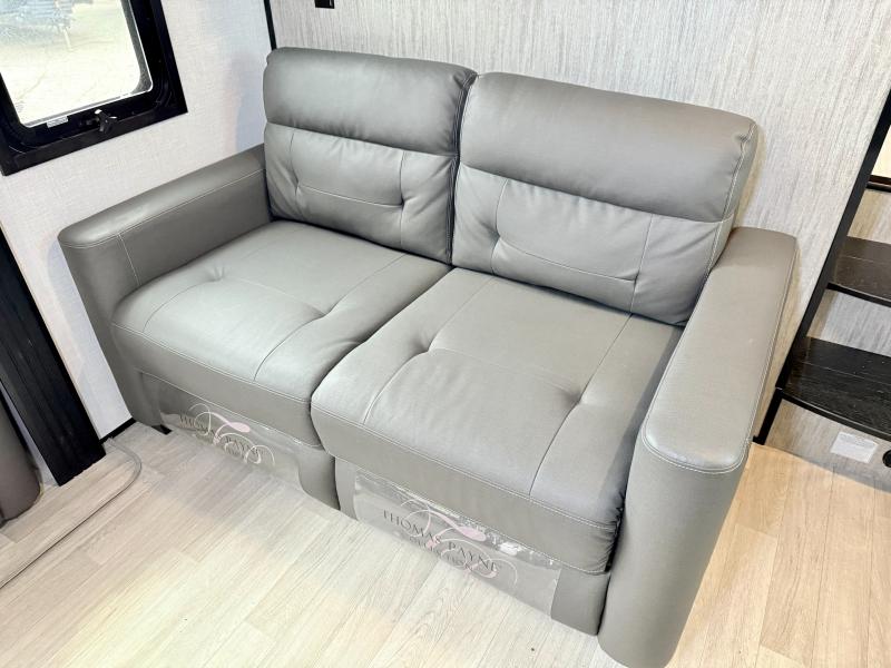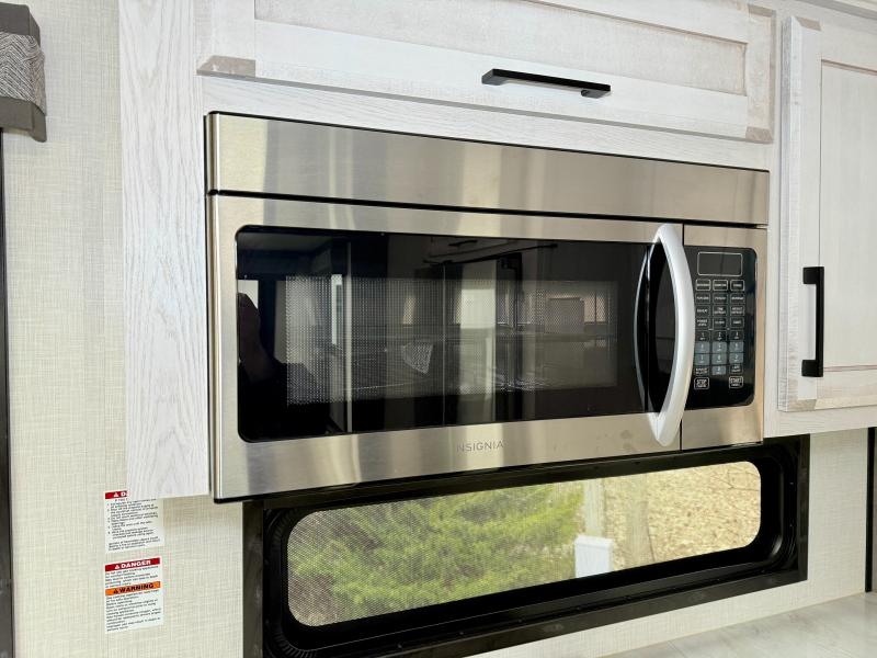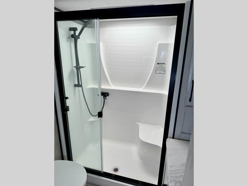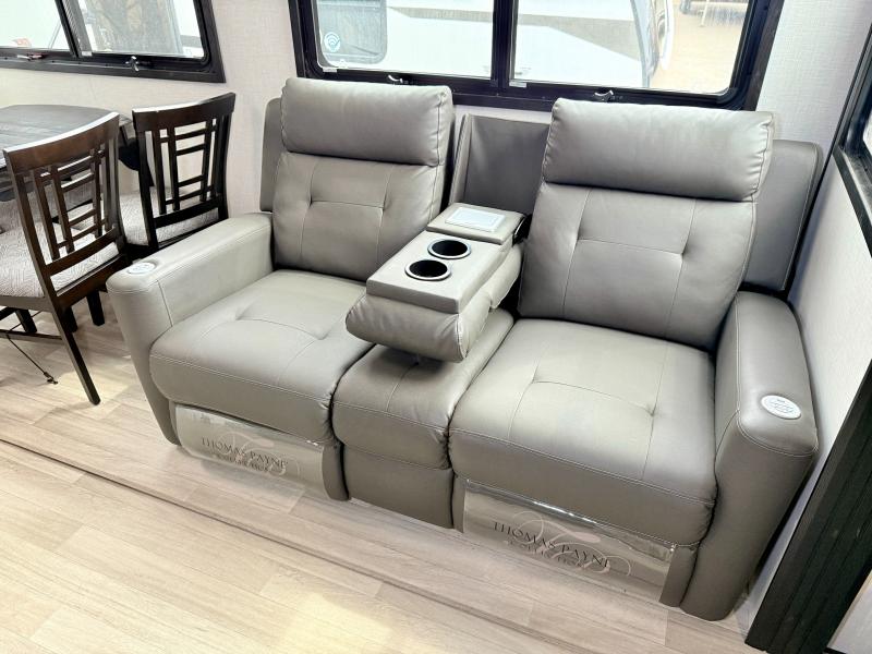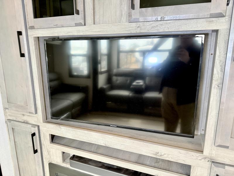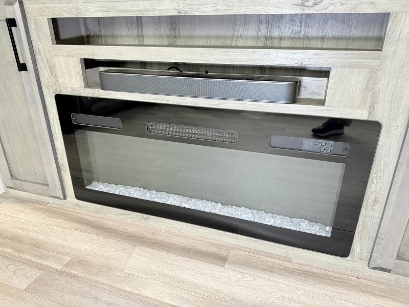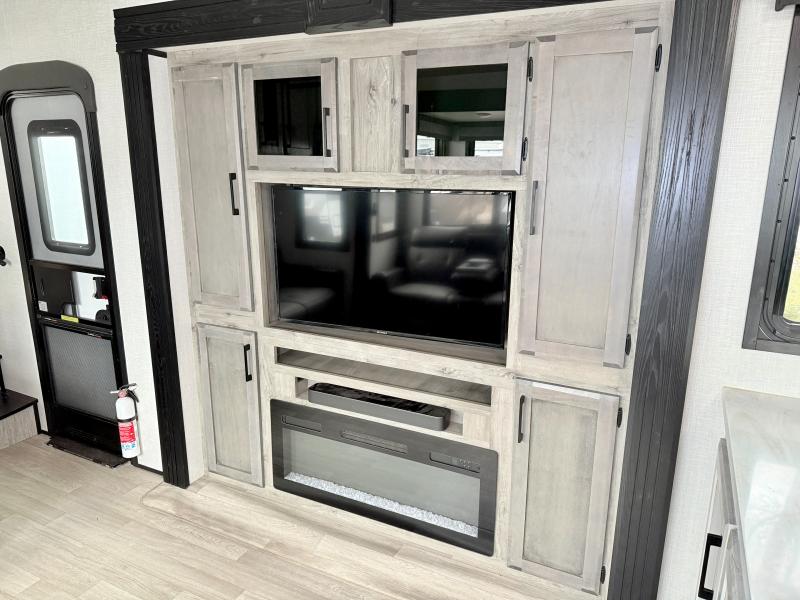 The chef will love cooking in the rear kitchen of this fifth wheel! They could even cook the catch of the day on the outside griddle while enjoying a cold beverage from the refrigerator, plus there is a pellet smoker at the outside kitchen. You can enjoy your meals at the table and chairs then lay down on the hide-a-bed sofa after stuffing yourself full. The theater seating with USB charging also offers a comfortable place to relax in front of the 40" fireplace at the entertainment center. Freshen up each morning in the full bathroom with the 48" x 30" residential shower with a seat and easily grab your towel from the linen closet next to it. When you're ready to wind down your nights, head to the front private bedroom to change into your pajamas stored in the dresser with a built-in hamper or from the front wardrobe that is prepped to add an optional washer and dryer then lay down on the king bed slide. The hitch receiver comes with a four pin harness adds more security!