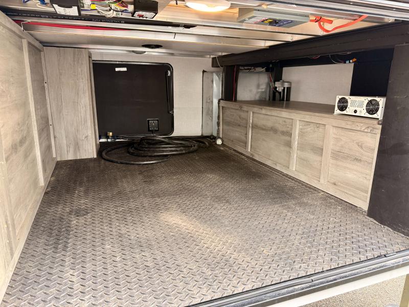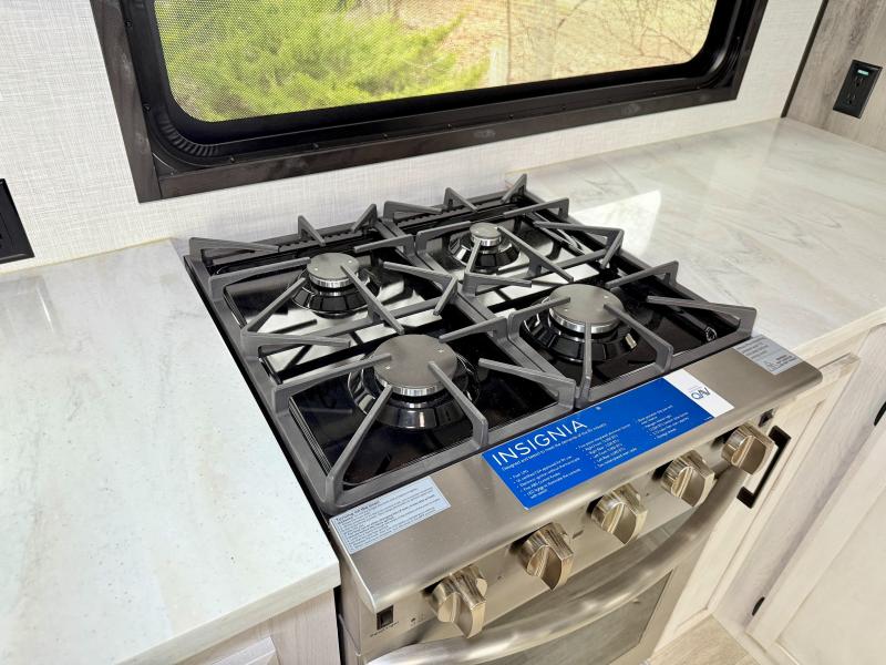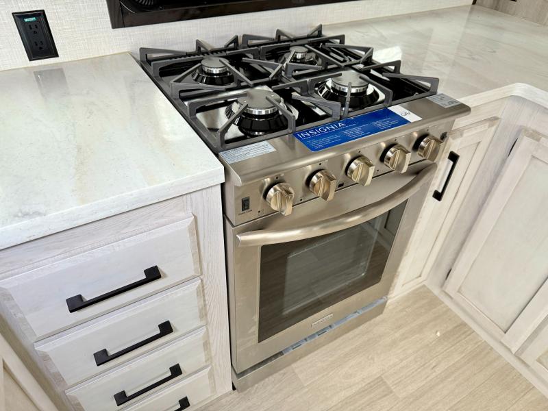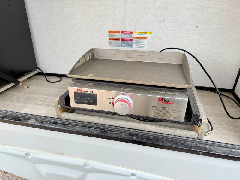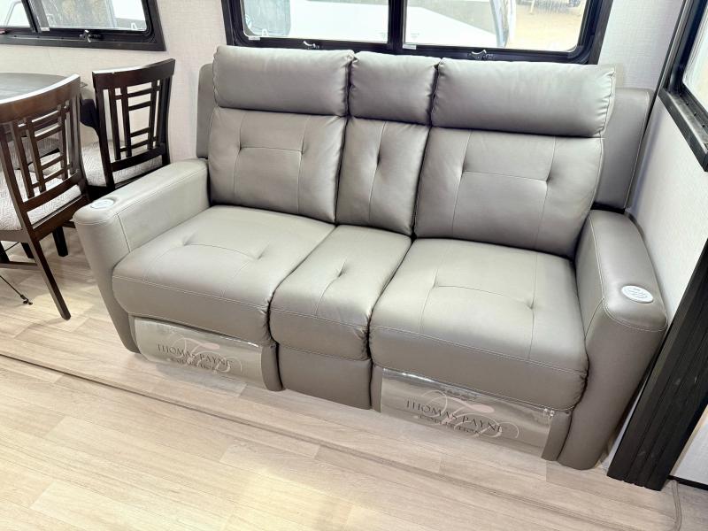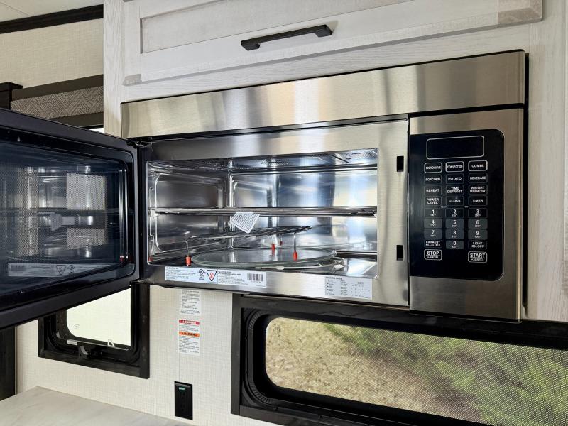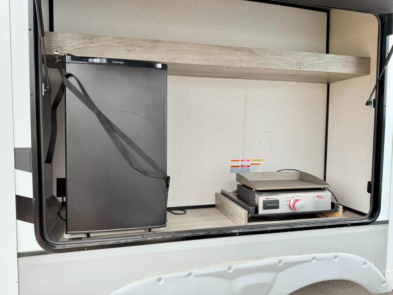 The chef will love cooking in the rear kitchen of this fifth wheel! They could even cook the catch of the day on the outside griddle while enjoying a cold beverage from the refrigerator, plus there is a pellet smoker at the outside kitchen. You can enjoy your meals at the table and chairs then lay down on the hide-a-bed sofa after stuffing yourself full. The theater seating with USB charging also offers a comfortable place to relax in front of the 40" fireplace at the entertainment center. Freshen up each morning in the full bathroom with the 48" x 30" residential shower with a seat and easily grab your towel from the linen closet next to it. When you're ready to wind down your nights, head to the front private bedroom to change into your pajamas stored in the dresser with a built-in hamper or from the front wardrobe that is prepped to add an optional washer and dryer then lay down on the king bed slide. The hitch receiver comes with a four pin harness adds more security!