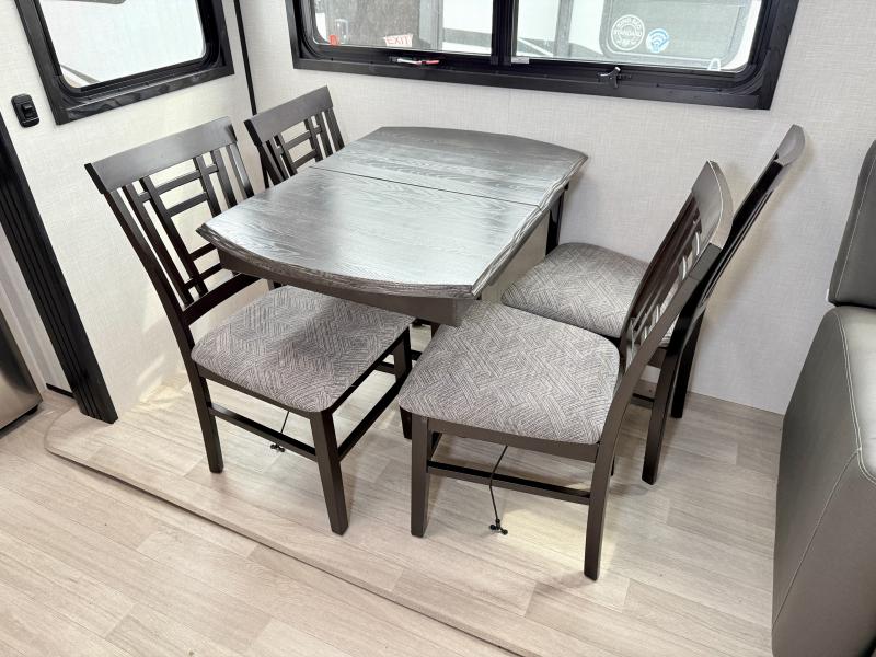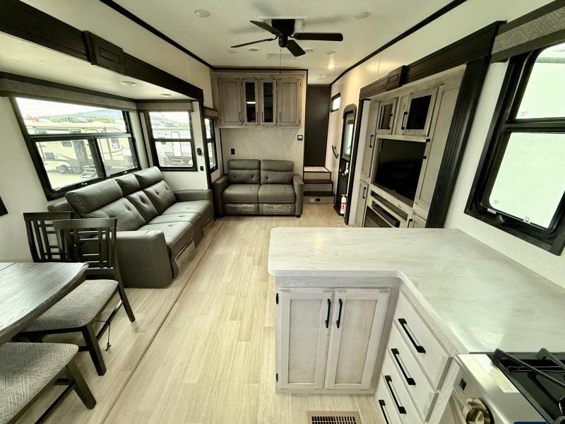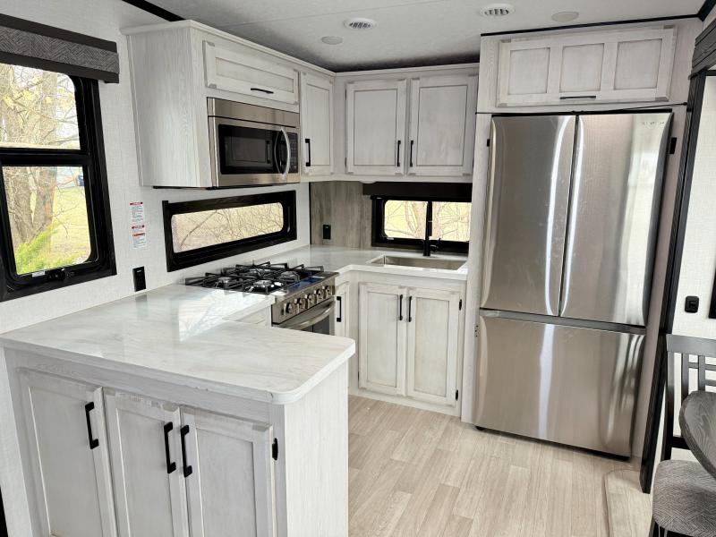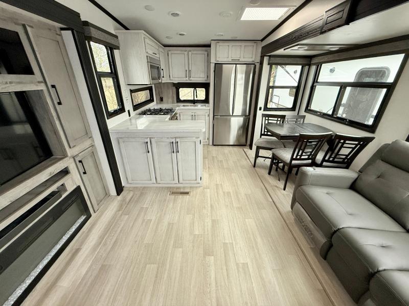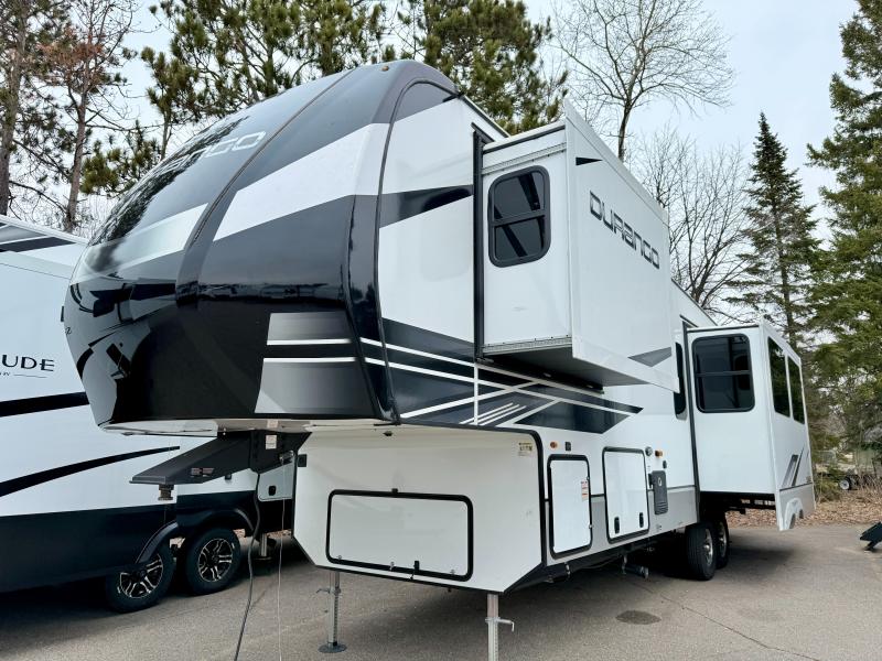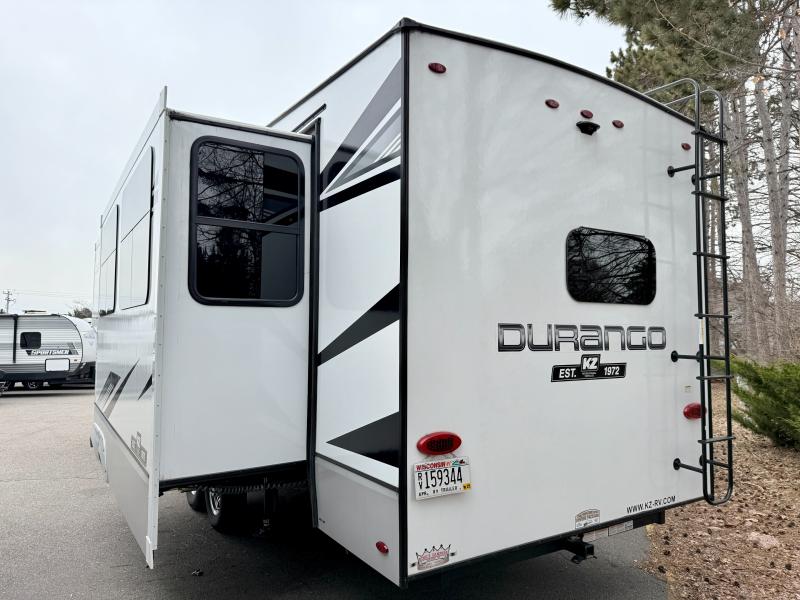 Enjoy full time living, an affordable price, and a wide body construction for more living space with every one of these KZ Durango light high-profile fifth wheels! These luxury units can be used all year round with the all-weather insulation package, the 3" x 14" foam-core in-floor straight-line heating system w/ a 35,000 BTU furnace, and the 15,000 BTU ducted roof A/C which optimizes the airflow by an average of 40% for better performance, cooling time, and reduction of noise. A few other construction features you will appreciate include a one piece, seamless walk-on Tufflex roofing material, Pex® in-floor heated waterlines, a Lamilux® gelcoat fiberglass exterior, and Dexter® axles with self adjusting brakes and height adjusting hangers. You can even head to the woods and go off-grid when you choose the optional off-the-grid solar package. Modern farmhouse cabinetry, a king size bed, and smart TVs will have you feeling like you never left home!