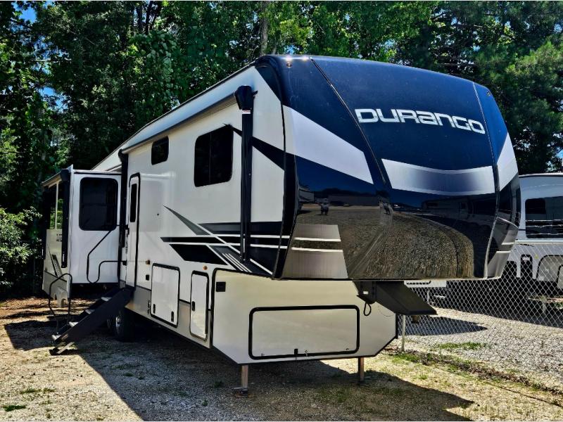 Enjoy full time living, an affordable price, and a wide body construction for more living space with every one of these KZ Durango light high-profile fifth wheels! These luxury units can be used all year round with the all-weather insulation package, the 3" x 14" foam-core in-floor straight-line heating system w/ a 35,000 BTU furnace, and the 15,000 BTU ducted roof A/C which optimizes the airflow by an average of 40% for better performance, cooling time, and reduction of noise. A few other construction features you will appreciate include a one piece, seamless walk-on Tufflex roofing material, Pex® in-floor heated waterlines, a Lamilux® gelcoat fiberglass exterior, and Dexter® axles with self adjusting brakes and height adjusting hangers. You can even head to the woods and go off-grid when you choose the optional off-the-grid solar package. Modern farmhouse cabinetry, a king size bed, and smart TVs will have you feeling like you never left home!