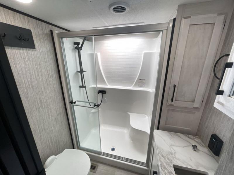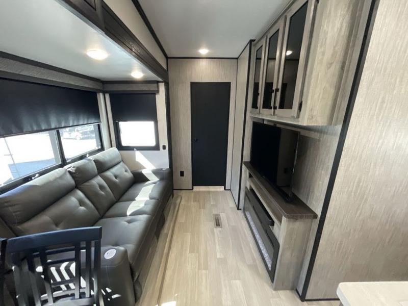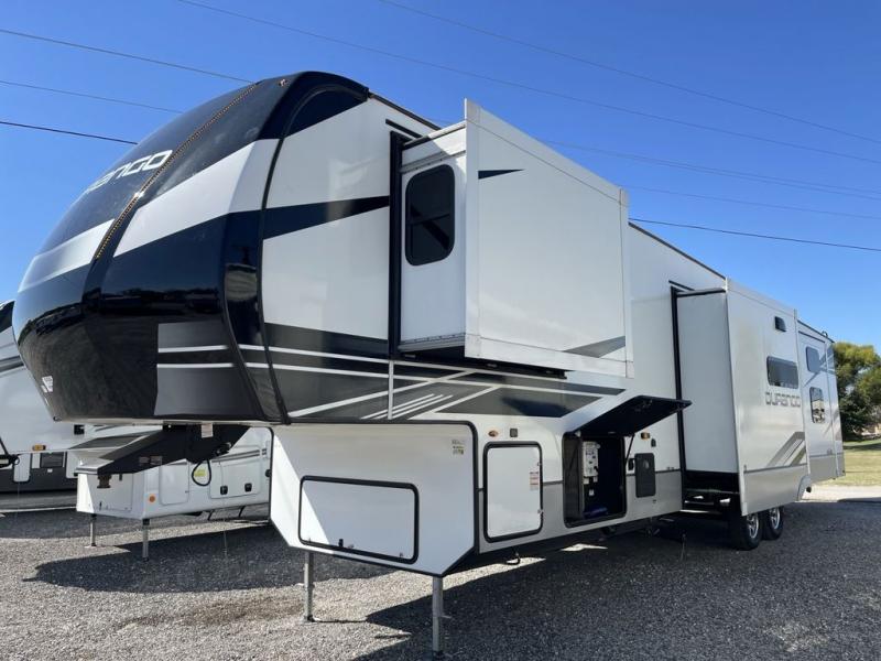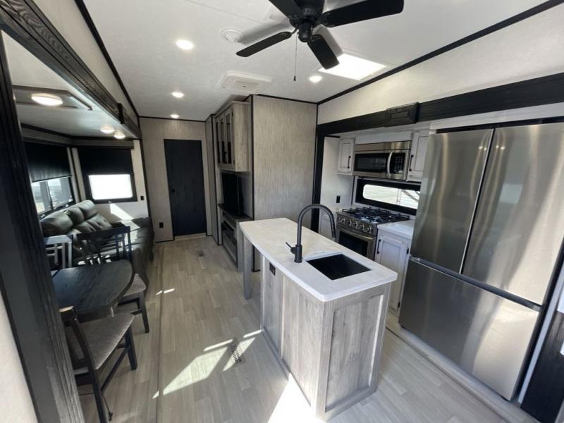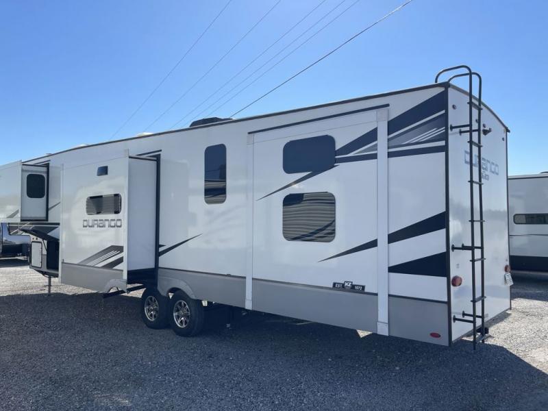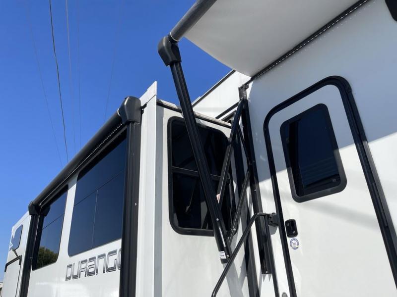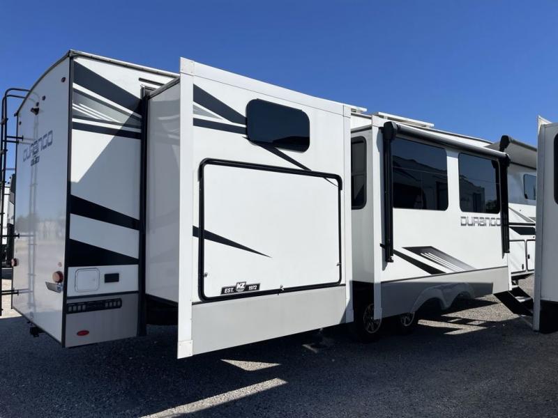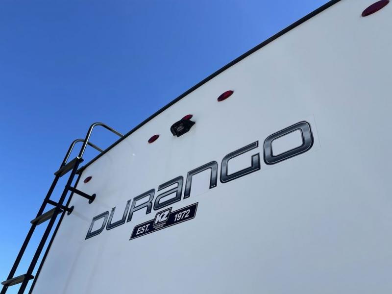 Enjoy full time living, an affordable price, and a wide body construction for more living space with every one of these KZ Durango light high-profile fifth wheels! These luxury units can be used all year round with the all-weather insulation package, the 3" x 14" foam-core in-floor straight-line heating system w/ a 35,000 BTU furnace, and the 15,000 BTU ducted roof A/C which optimizes the airflow by an average of 40% for better performance, cooling time, and reduction of noise. A few other construction features you will appreciate include a one piece, seamless walk-on Tufflex roofing material, Pex® in-floor heated waterlines, a Lamilux® gelcoat fiberglass exterior, and Dexter® axles with self adjusting brakes and height adjusting hangers. You can even head to the woods and go off-grid when you choose the optional off-the-grid solar package. Modern farmhouse cabinetry, a king size bed, and smart TVs will have you feeling like you never left home!