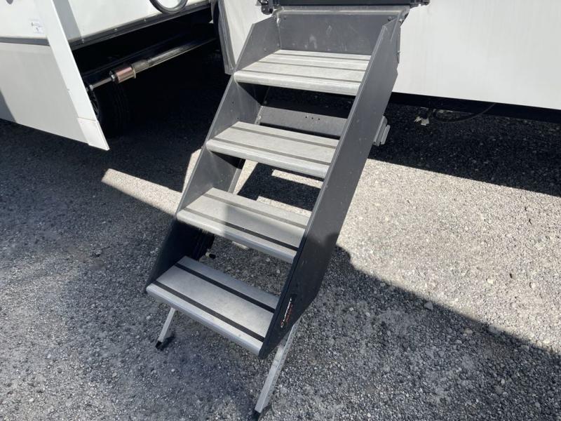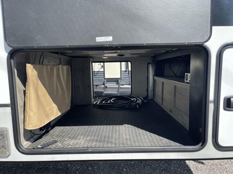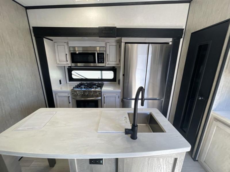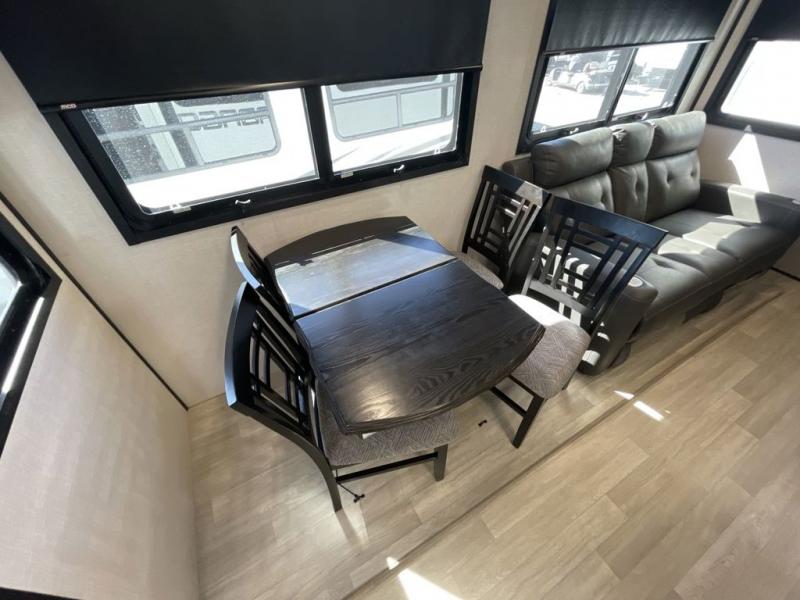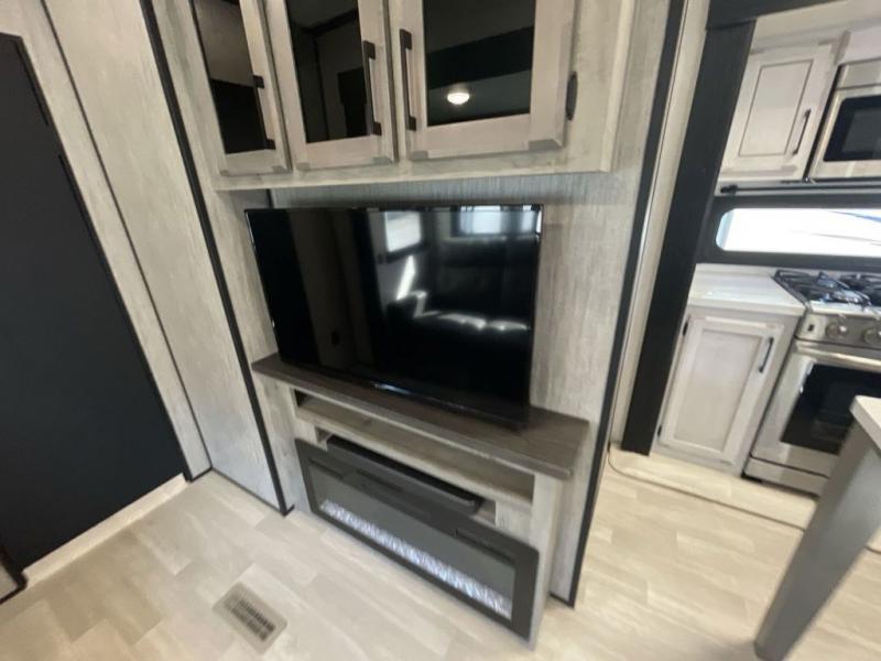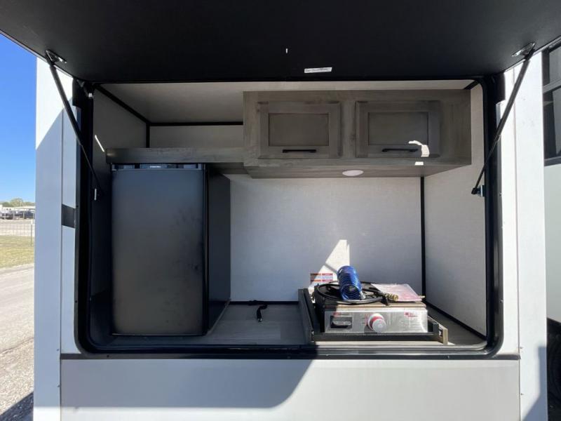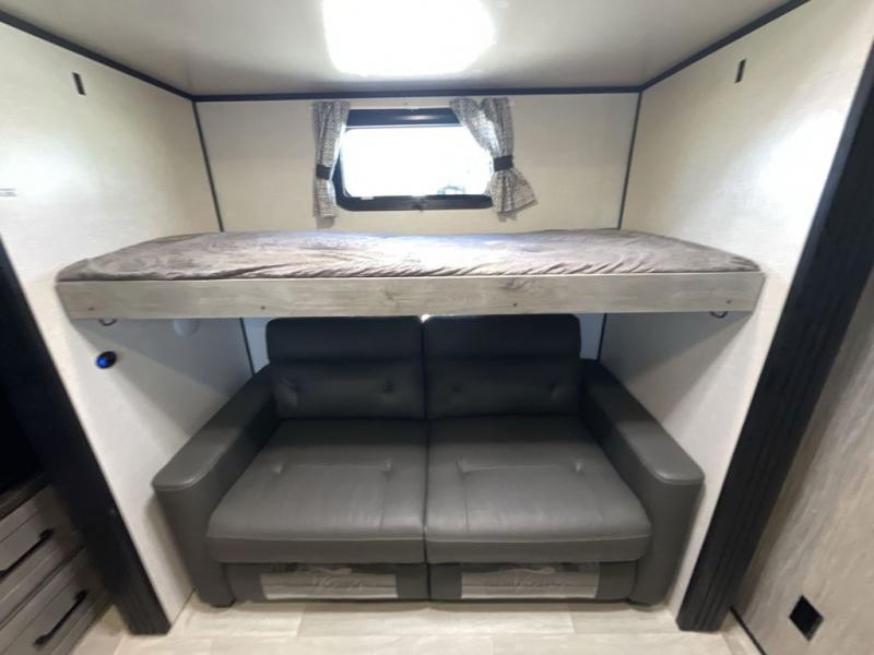 All of your friends and family can camp together in this fifth wheel! It features a rear private bunkhouse with a bunk above a hide-a-bed sofa, a full bathroom with a 30" x 36" shower, an entertainment center with wardrobes on either side, a folding bunk, and a bunk over the outside kitchen which even has a pellet smoker. Across from the hide-a-bed sofa is an entertainment center with a 40" fireplace and a 43" smart TV to watch your favorite movies at night. The kitchen island comes with two bar stools and you can prepare your best meals with the four burner range with a 24" oven. The second bathroom has a 48" x 30" residential shower with a seat and a linen closet to keep your towel close. Enjoy a good night's rest on the king bed slide in the front private bedroom which also has a dresser with a built-in hamper and a front wardrobe that is prepped to add an optional washer and dryer!