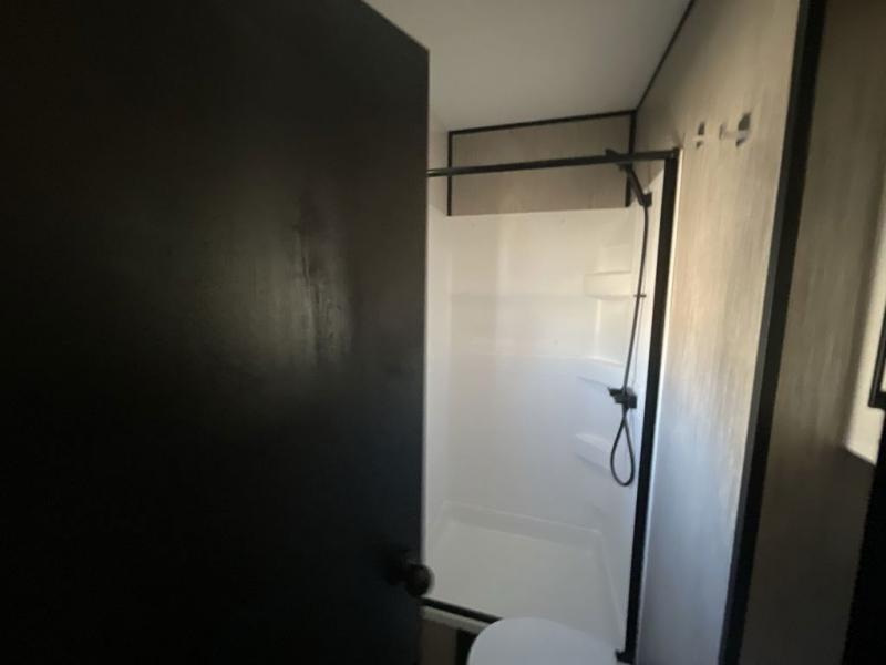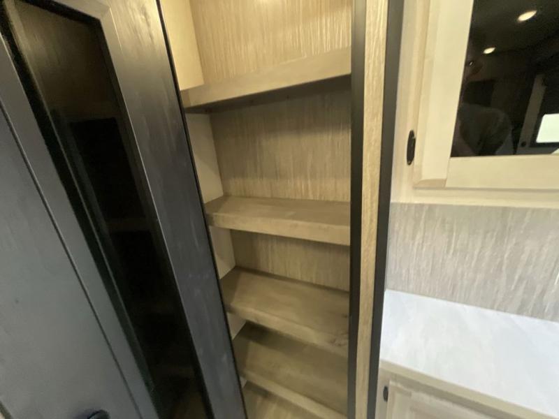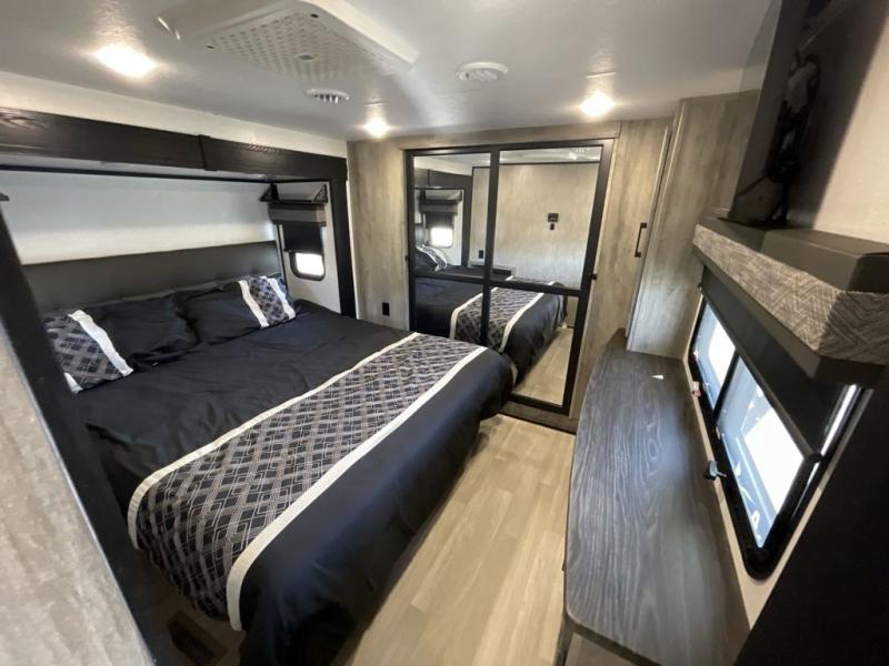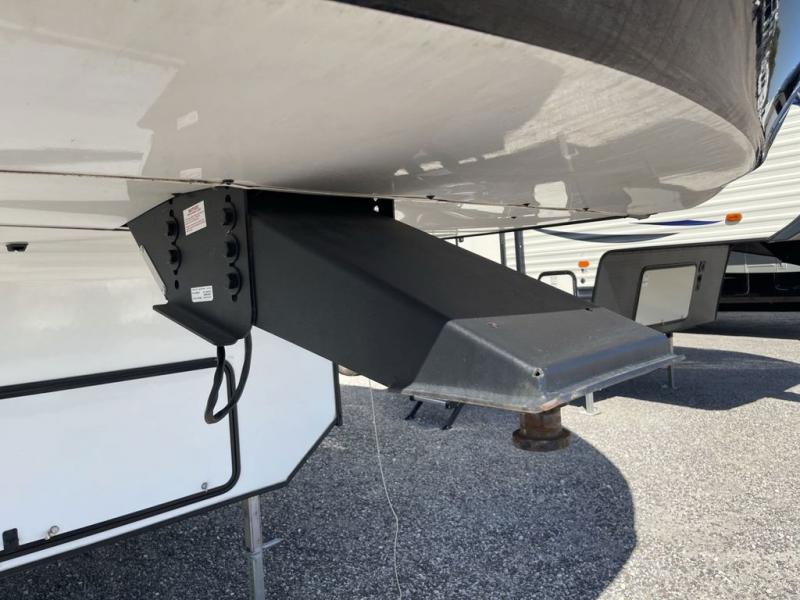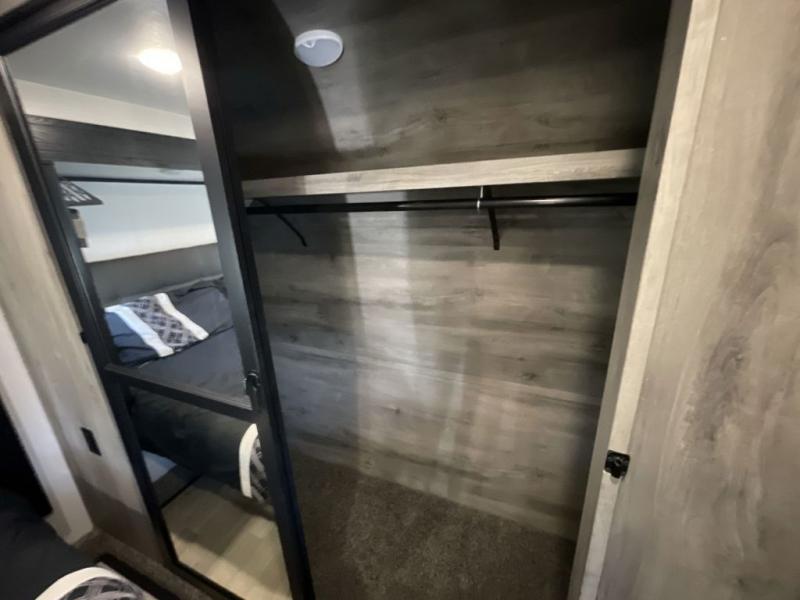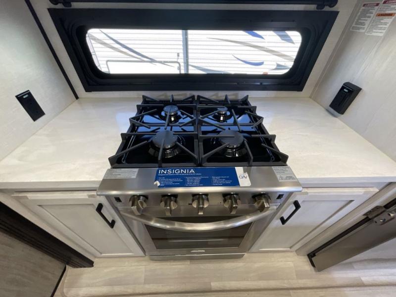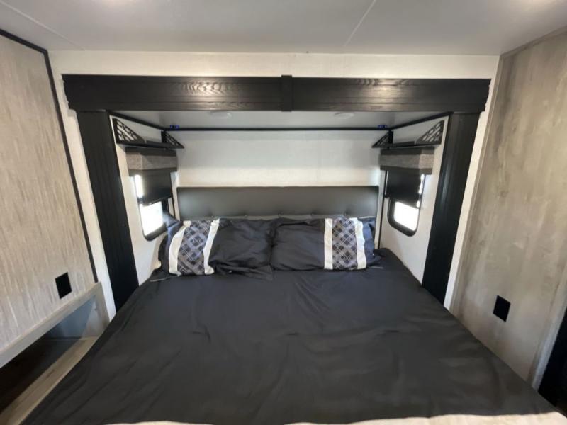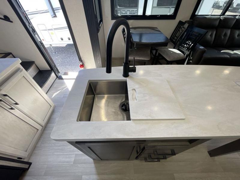 All of your friends and family can camp together in this fifth wheel! It features a rear private bunkhouse with a bunk above a hide-a-bed sofa, a full bathroom with a 30" x 36" shower, an entertainment center with wardrobes on either side, a folding bunk, and a bunk over the outside kitchen which even has a pellet smoker. Across from the hide-a-bed sofa is an entertainment center with a 40" fireplace and a 43" smart TV to watch your favorite movies at night. The kitchen island comes with two bar stools and you can prepare your best meals with the four burner range with a 24" oven. The second bathroom has a 48" x 30" residential shower with a seat and a linen closet to keep your towel close. Enjoy a good night's rest on the king bed slide in the front private bedroom which also has a dresser with a built-in hamper and a front wardrobe that is prepped to add an optional washer and dryer!
