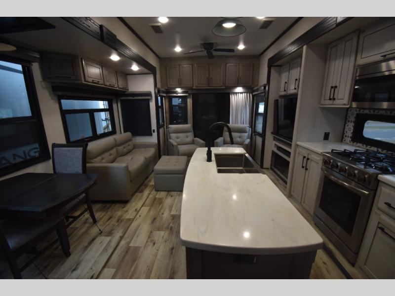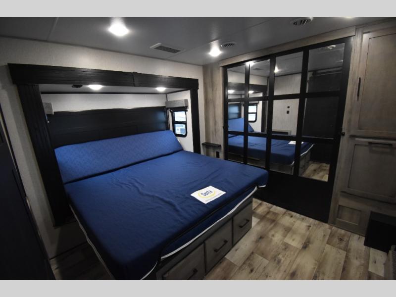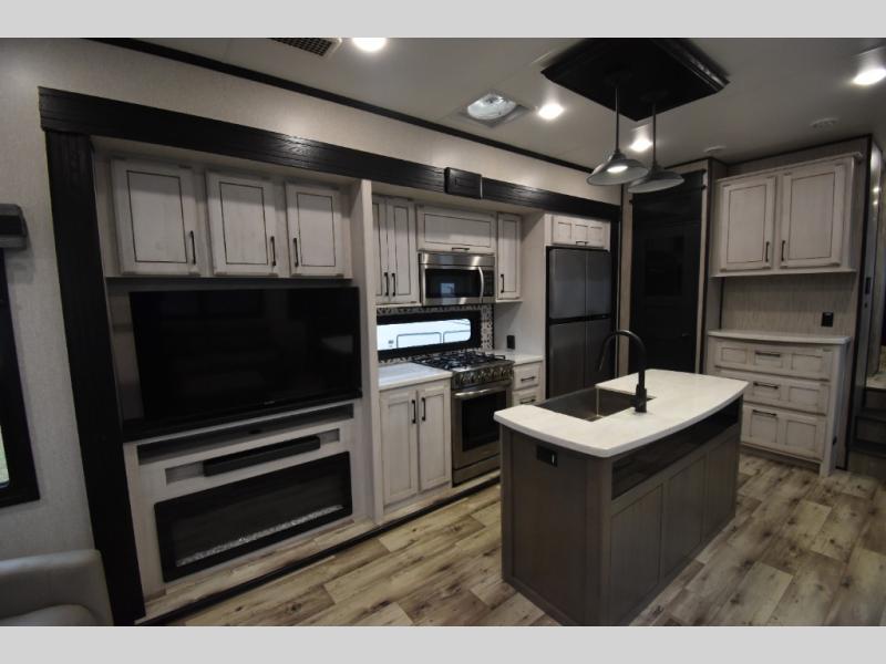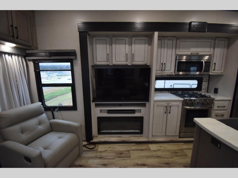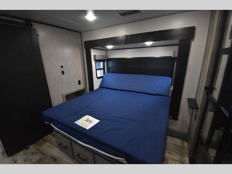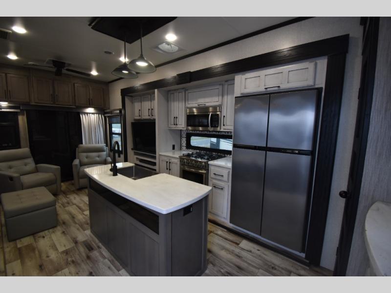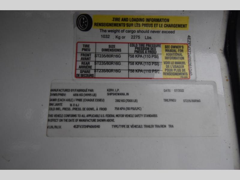 With any KZ Durango Gold full-time luxury fifth wheel, you will enjoy the look of modern farmhouse cabinetry, upgraded kitchen appliances such as a 30" convection microwave and 24" oven with four burner range, plus a stainless dishwasher. Other top features include an electric tilt bed with Serta Comfort foam king mattress, theater seating with cupholders and a USB plug, plus heat, massage, and power recline/decline features. You will also appreciate a handy central vacuum system with multiple attachments that stores out of sight. Each Durango Gold is constructed with six-sided aluminum framing, and has heated, insulated and an enclosed underbelly. It is also constructed with Tufflex roofing material which is flexible, puncture resistant, and reflective. Some additional standout features include a fully-vented attic system, and a Durango Towing package which includes a 2" towing receiver hitch with 4-pin wire harness connection. This will provide you with 3,000 lbs. of towing capacity. Come choose your favorite lightweight high-profile wide body luxury fifth wheel today!