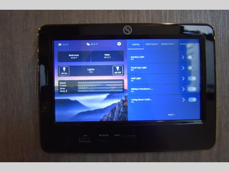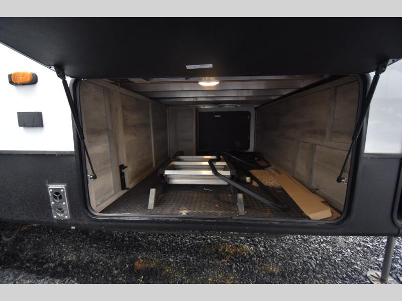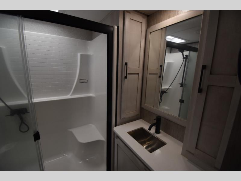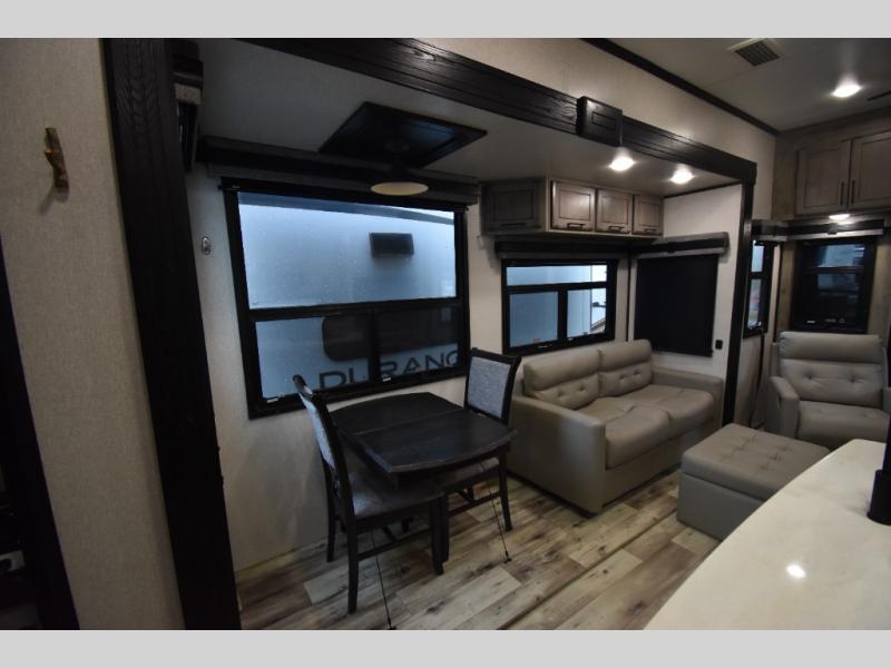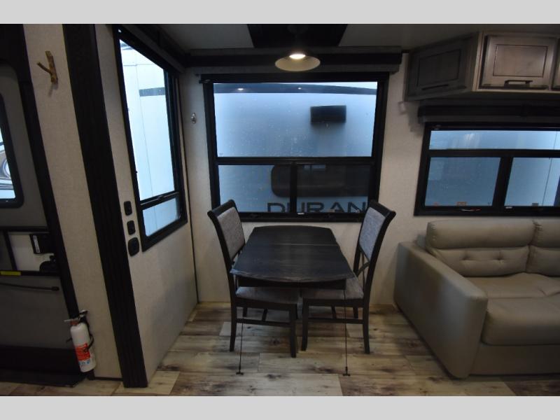 The unique patio deck on this Durango Gold offers a raised area to enjoy the great outdoors at a tailgate event, a big race, or just because you want this type of living space. You can also relax outside near the main entry under the 17' electric awning with an LED light strip, and there is exterior storage for your camping chairs, charcoal. and outdoor games. Back inside, you will love relaxing in the main living and kitchen area while you watch the 50" Smart LED TV with a fireplace below it while sitting in the chairs or on the hide-a-bed sofa which offers sleeping space. The legless table and chairs is a great place to dine, or you can choose the full-timer's desk option if you need to work on occasion. The cook will love all their amenities including the kitchen island with a farmhouse stainless steel sink, the solid surface countertops, and the hutch next to the pantry. The master bedroom is up front just beyond the full bathroom which includes a residential shower with a seat and linen storage. The bedroom provides an electric tilt king bed slide for more floor space and has drawers underneath the bed. You will find another slide with a dresser and the 32" Smart LED TV.
