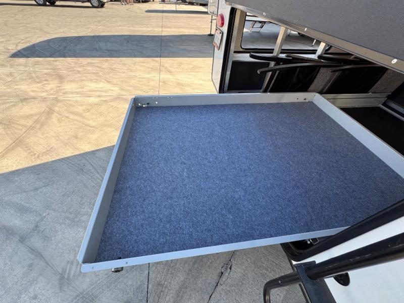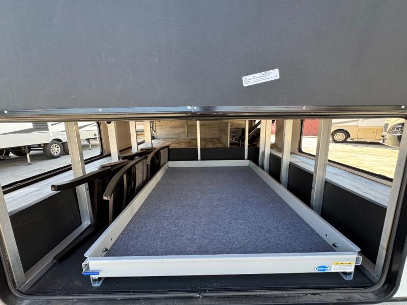 Rear Heated Storage Bay: Motion-lit, fully finished, sealed, with slide-out tray
