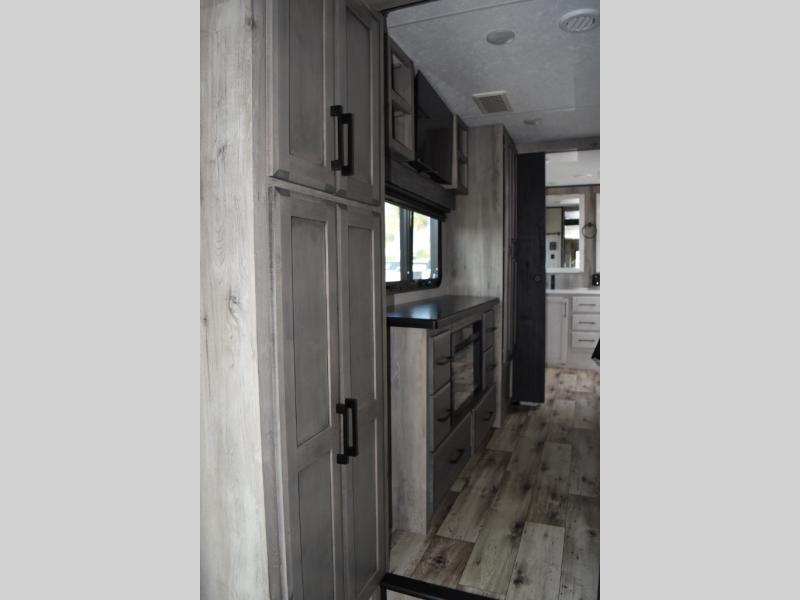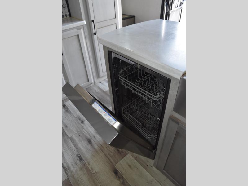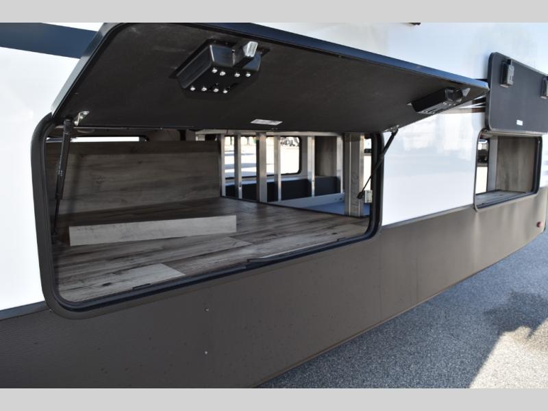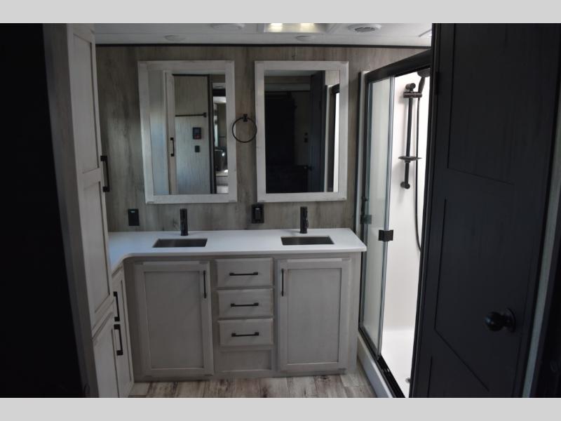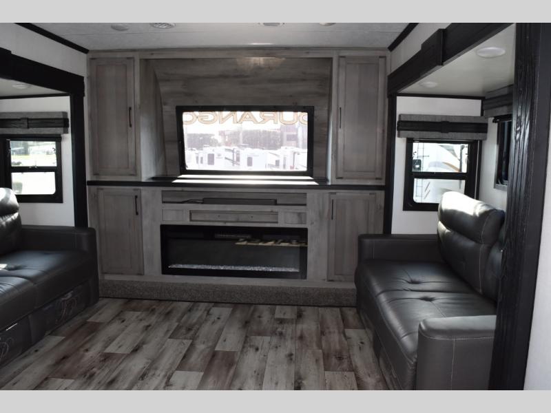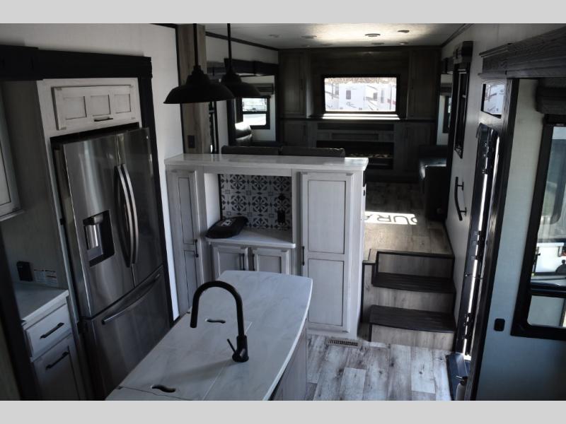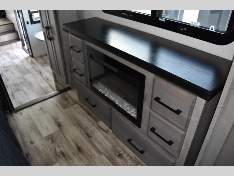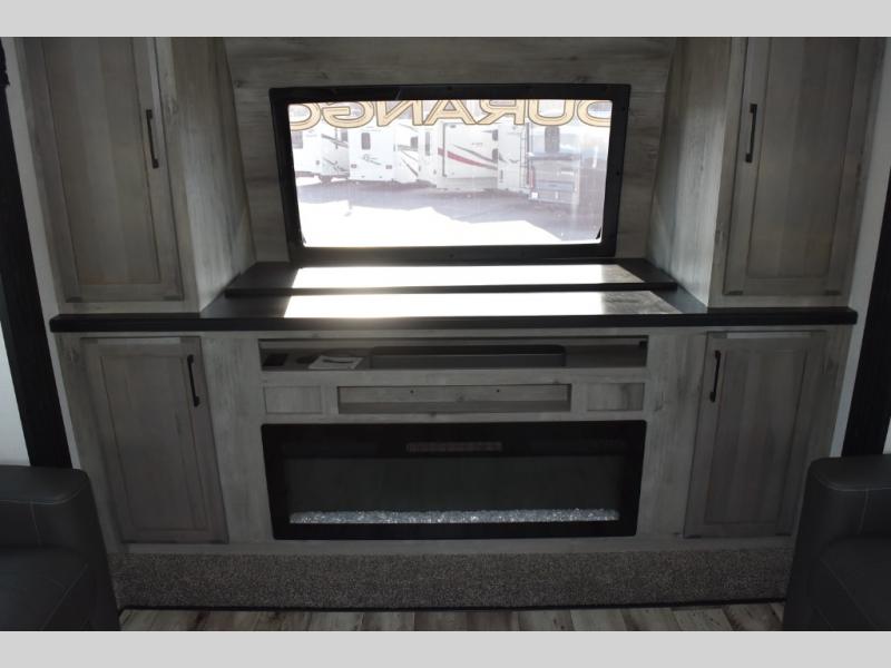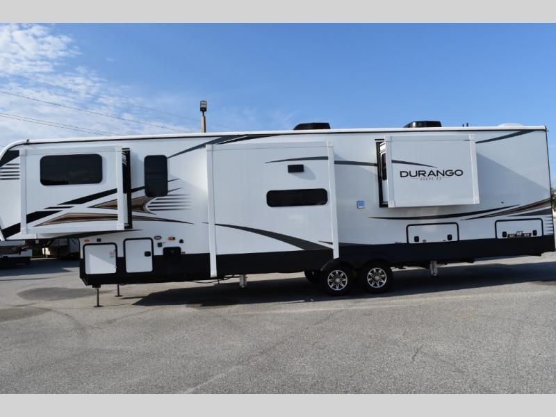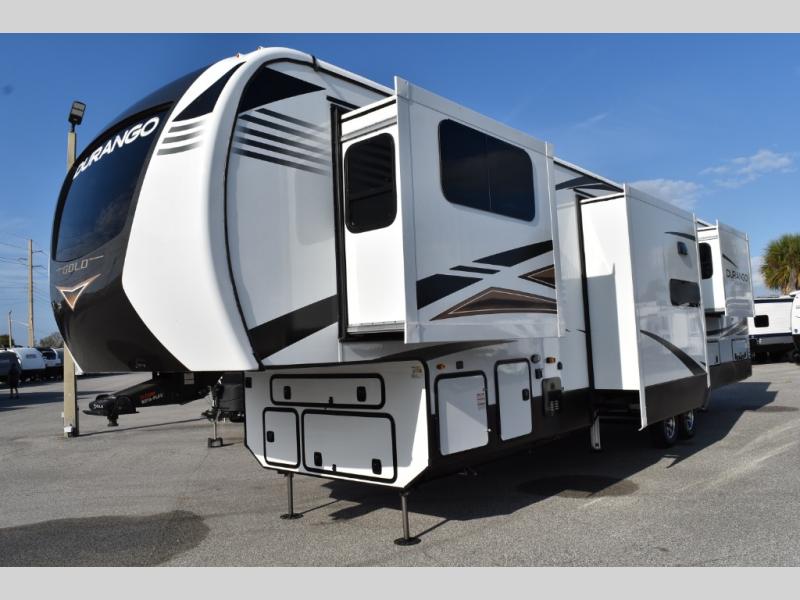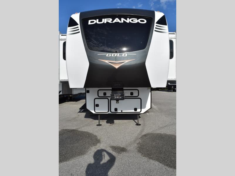 Looking for a full-featured fifth wheel that includes a walk-in laundry/pantry and a place to add a washer/dryer option, plus one that includes lots of storage, lots of interior space, and lots of extra features that will provide comfort, convenience and luxury? If so, this Durango Gold models offers all of that and more. You will appreciate the unique rear storage with a slide out tray that is motion-lit, fully finished, heated and sealed to keep your larger items safe during any season, and the separate spacious living area is great for entertaining your family and friends. This living area also provides an entertainment center across the entire front along with a 65" LED TV and 48" fireplace below, a front windshield, theater seating with USB ports, and two hide-a-bed sofas slide outs. The separate kitchen is centrally located and spacious with two slides including residential appliances, a legless table with four chairs, and a hutch/pantry for storage. The walk-through bedroom offers an electric-tilt king bed, drawer storage under the bed, and there is a dresser with hidden storage, a wardrobe, as well as a 32" Smart LED TV. And the rear full bathroom is attached and includes dual sinks for two people to get ready at once. Back outdoors, you can make meals using the outside kitchen with a griddle, stow more gear away in the pass-through storage, and relax under the 17' electric awning, and maybe add the 13' awning option off the private bedroom entry/exit door.