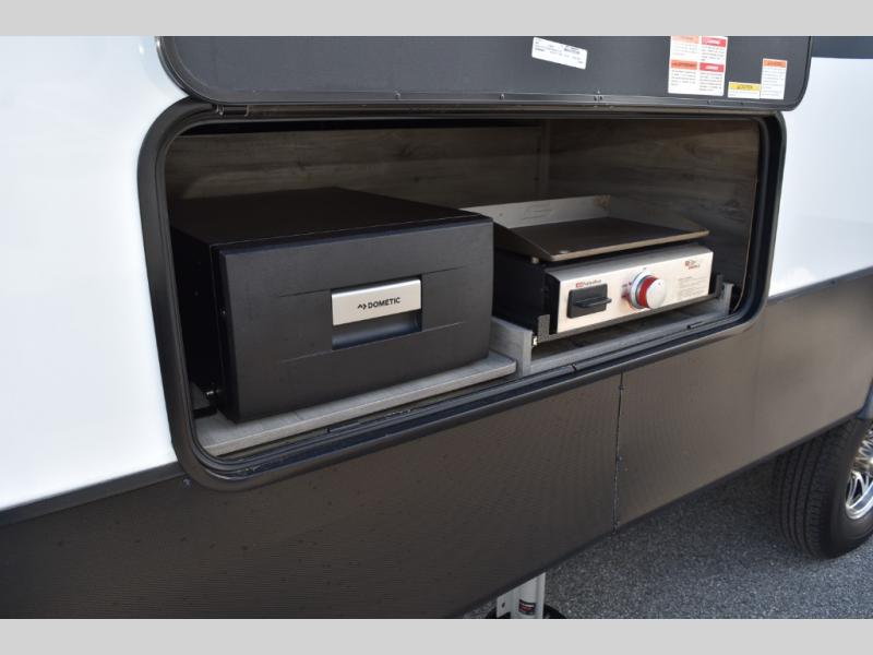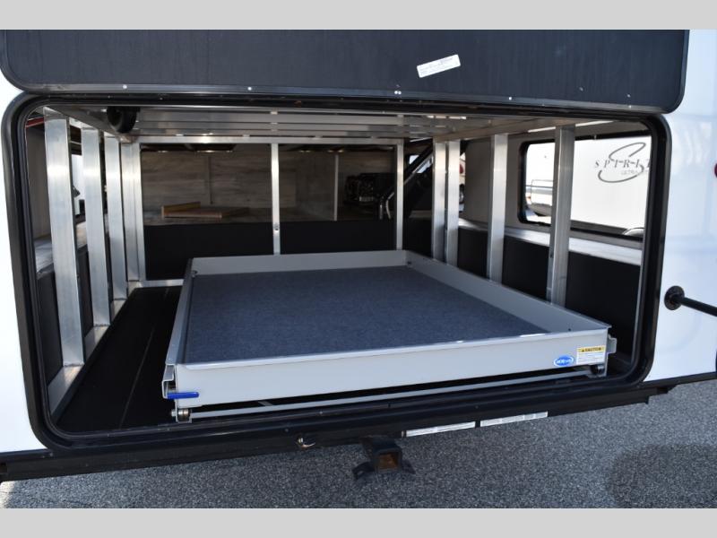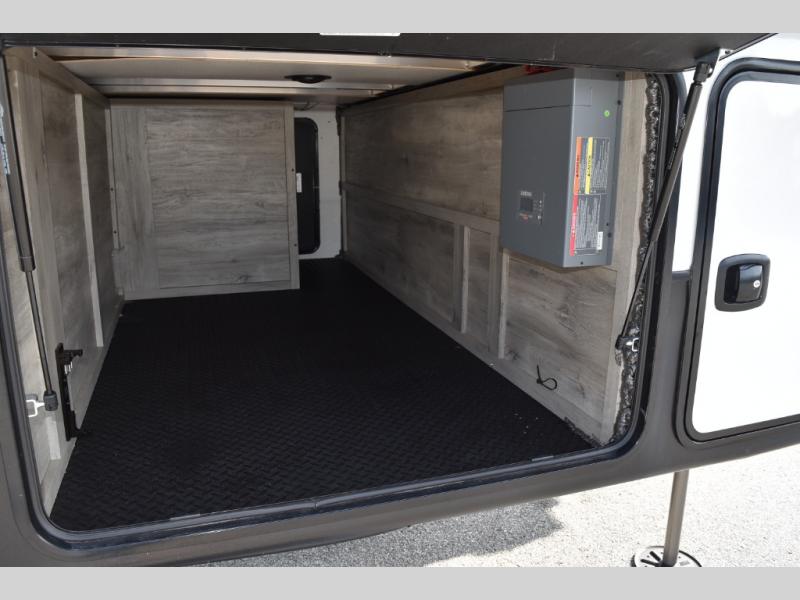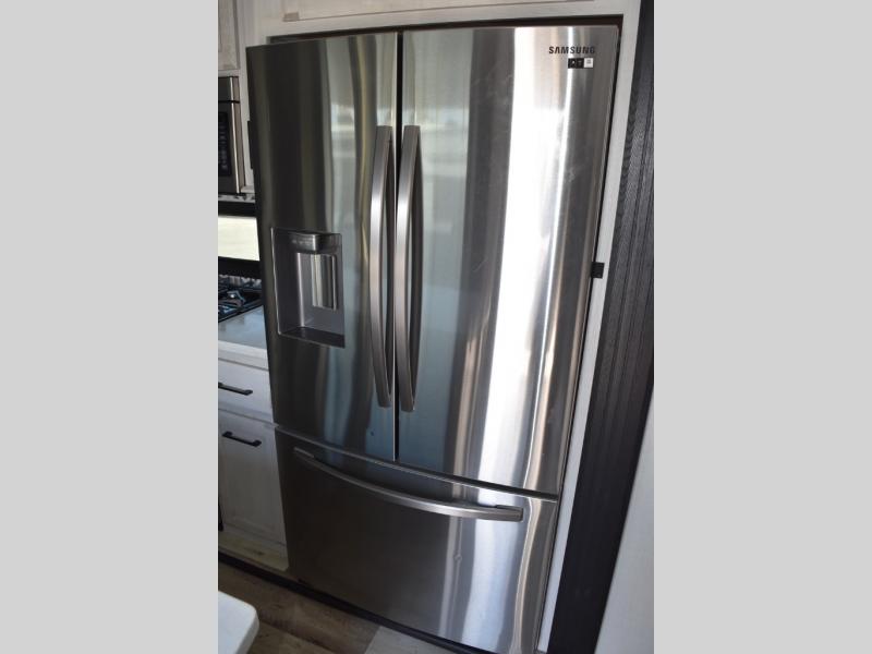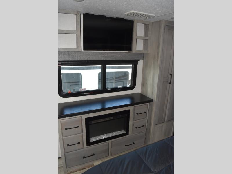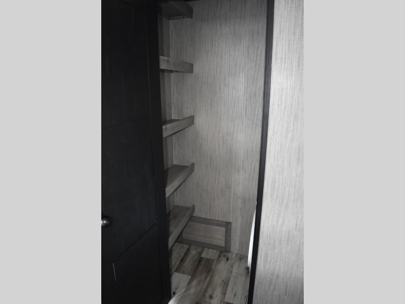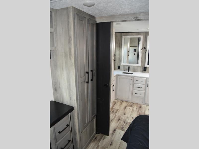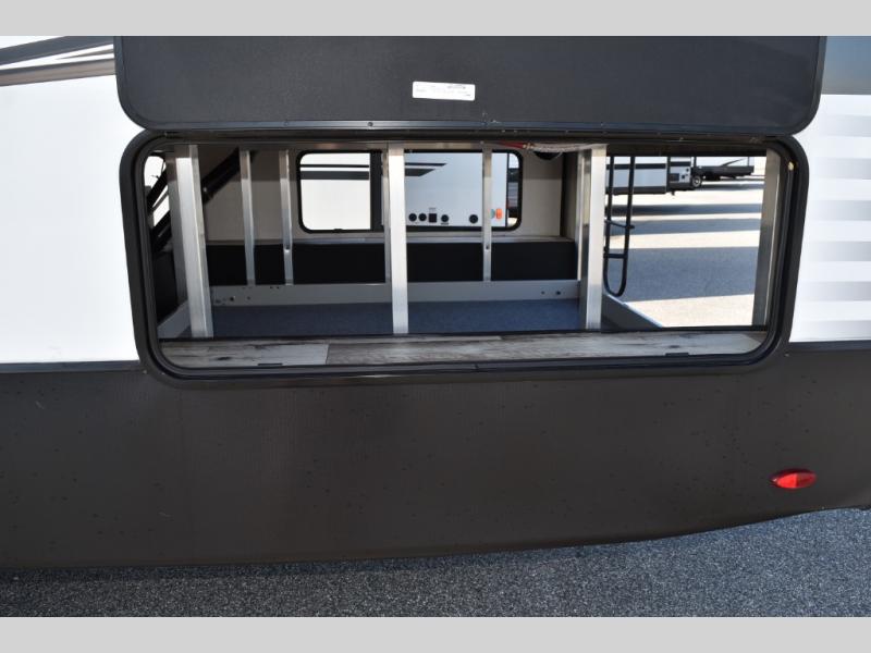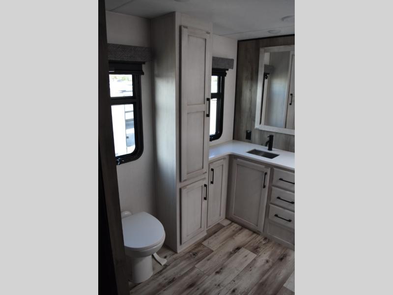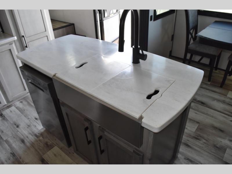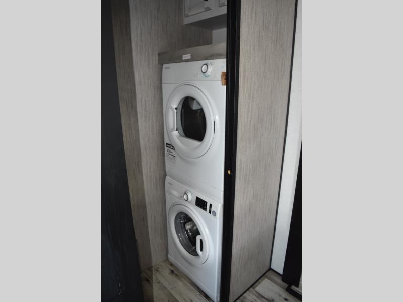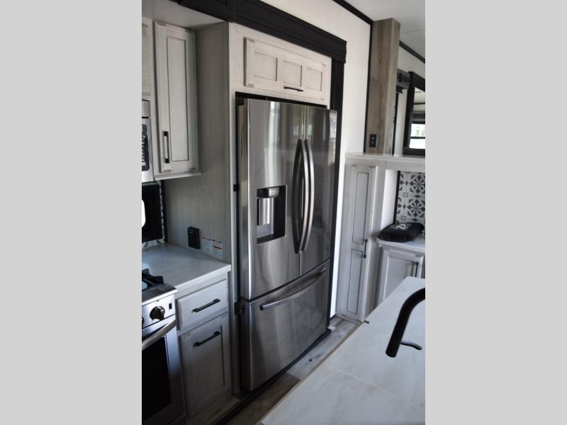 Looking for a full-featured fifth wheel that includes a walk-in laundry/pantry and a place to add a washer/dryer option, plus one that includes lots of storage, lots of interior space, and lots of extra features that will provide comfort, convenience and luxury? If so, this Durango Gold models offers all of that and more. You will appreciate the unique rear storage with a slide out tray that is motion-lit, fully finished, heated and sealed to keep your larger items safe during any season, and the separate spacious living area is great for entertaining your family and friends. This living area also provides an entertainment center across the entire front along with a 65" LED TV and 48" fireplace below, a front windshield, theater seating with USB ports, and two hide-a-bed sofas slide outs. The separate kitchen is centrally located and spacious with two slides including residential appliances, a legless table with four chairs, and a hutch/pantry for storage. The walk-through bedroom offers an electric-tilt king bed, drawer storage under the bed, and there is a dresser with hidden storage, a wardrobe, as well as a 32" Smart LED TV. And the rear full bathroom is attached and includes dual sinks for two people to get ready at once. Back outdoors, you can make meals using the outside kitchen with a griddle, stow more gear away in the pass-through storage, and relax under the 17' electric awning, and maybe add the 13' awning option off the private bedroom entry/exit door.