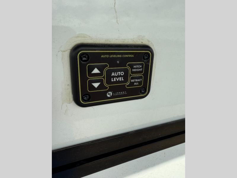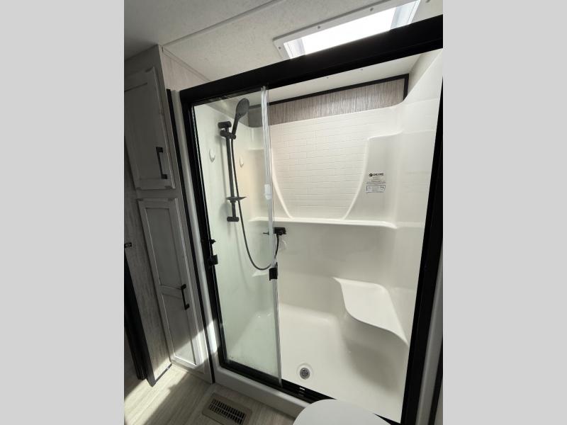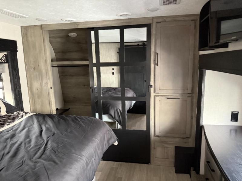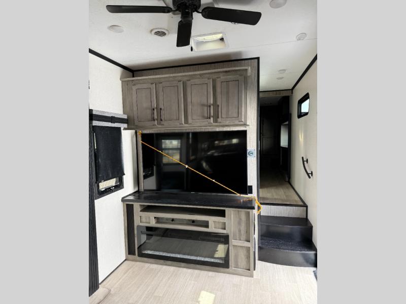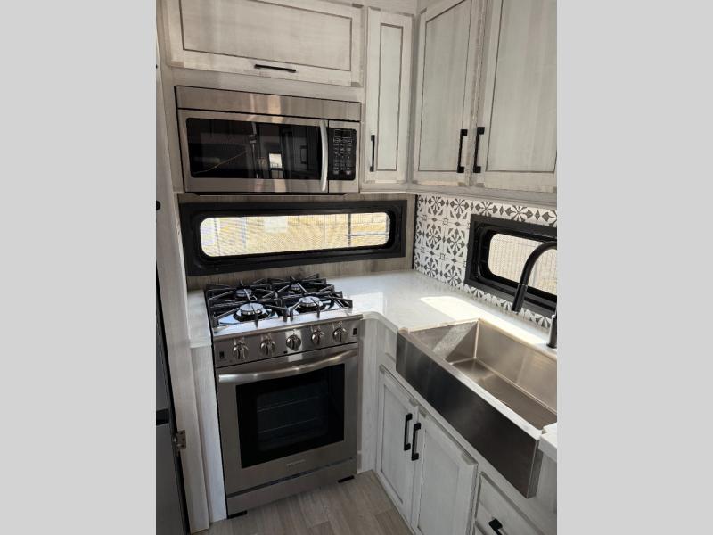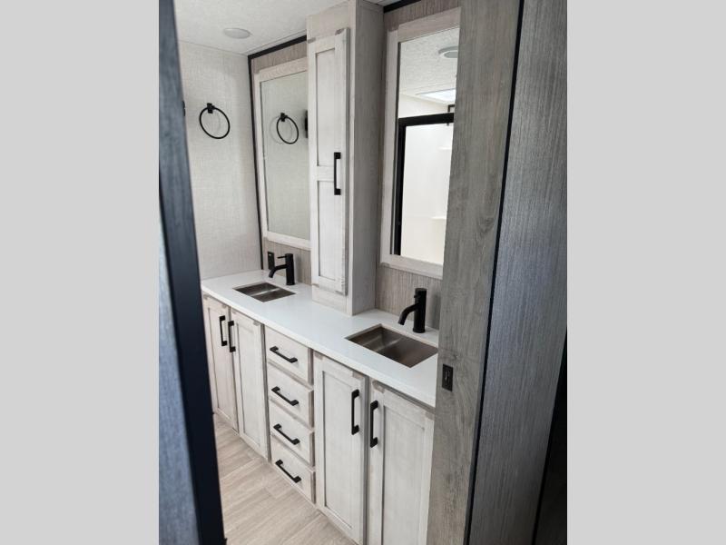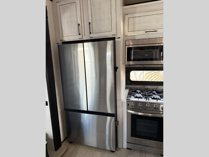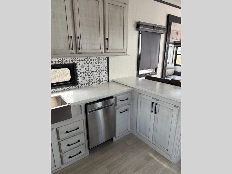 Any cook will love this fifth wheel's layout with a rear kitchen which includes residential appliances, a farmhouse stainless steel sink, a dishwasher, a pantry, and a view of the middle, separate living area. You can even see the 65" LED TV with a fireplace below from the slide out which includes the legless table with chairs unless you choose the full-timer's desk option for that convenience. The theater seating with USB ports, and two hide-a-bed sofa slides widen this area so everyone can stretch out and relax. At night, retire to your own front bedroom with a slide out king electric tilt bed with drawers underneath, a front wardrobe including washer and dryer prep, a closet with a built-in hamper, plus a slide out dresser with a 32" Smart LED TV above it. And the full bathroom provides a residential shower with a seat plus linen storage, and two sinks for more convenience.
