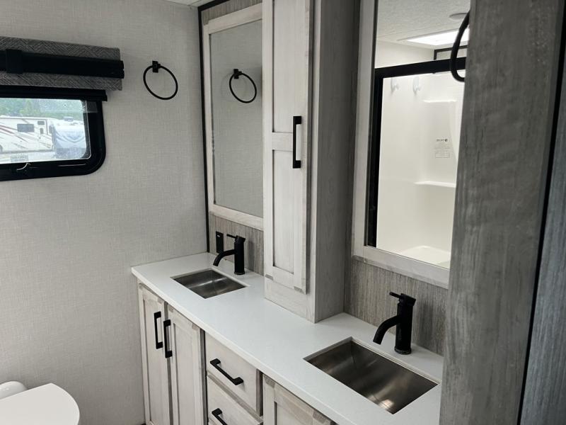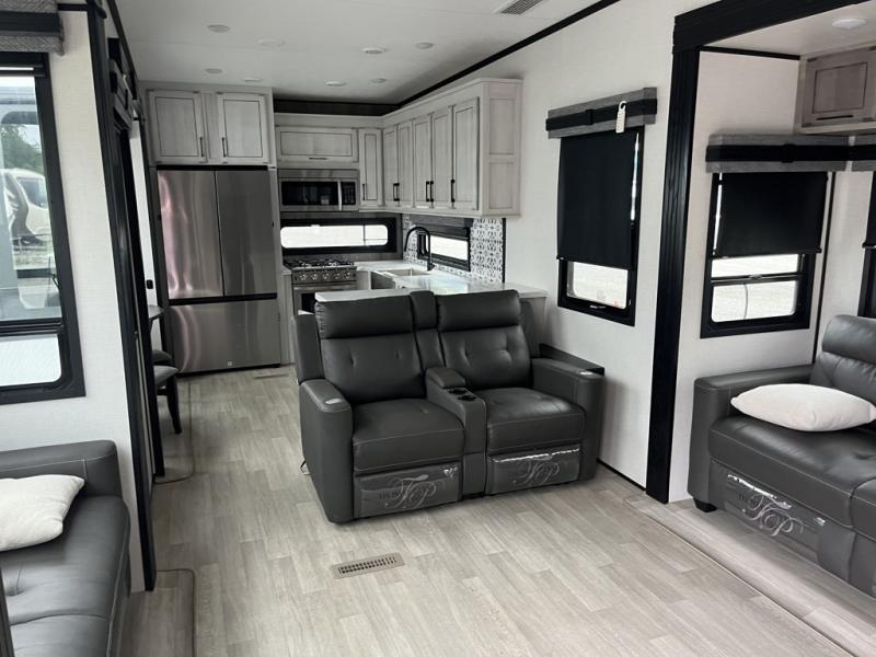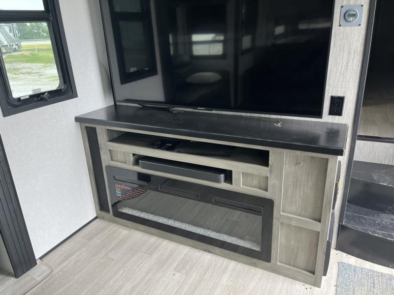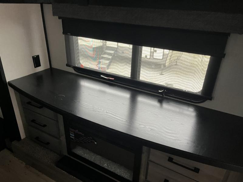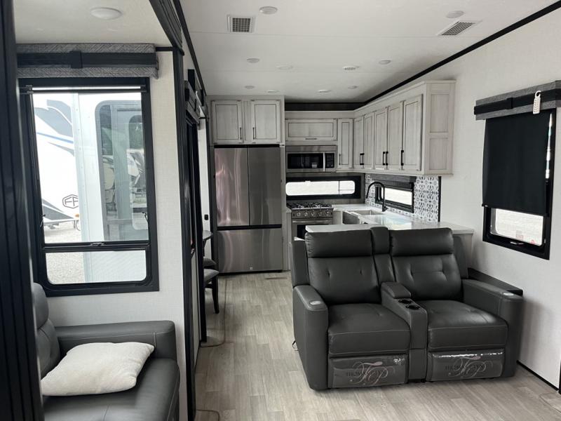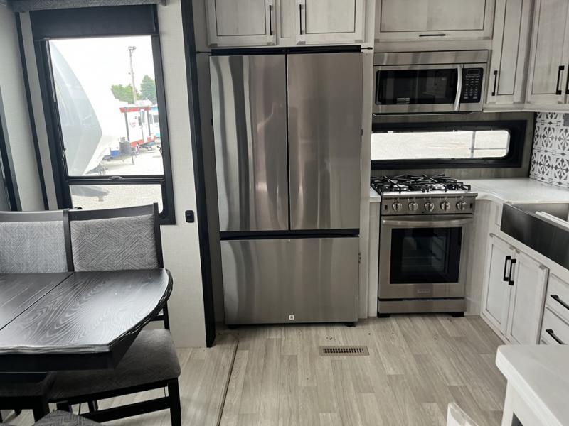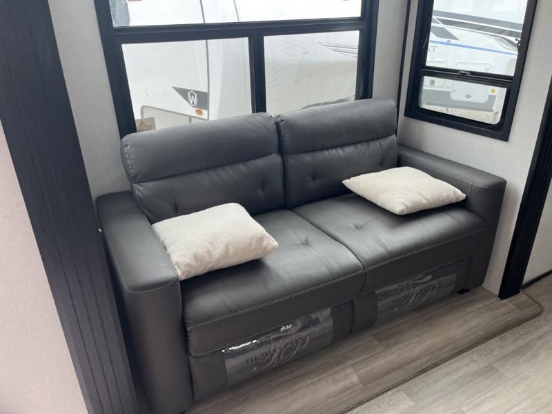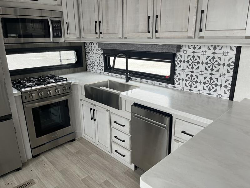 Any cook will love this fifth wheel's layout with a rear kitchen which includes residential appliances, a farmhouse stainless steel sink, a dishwasher, solid surface countertops, a pantry, and a view of the middle, separate living area. You can even see the 65" LED TV with fireplace below from the slide out which includes the legless table with chairs unless you choose the full-timer's desk option for that convenience. The theater seating with USB ports, and two hide-a-bed sofa slides widen this area so everyone can stretch out and relax. At night retire to your own front bedroom with a slide out king electric tilt bed with drawers underneath, a front wardrobe including a washer/dryer prepped space, and a closet with a built-in hamper, plus a slide out dresser with a 32" Smart LED TV above it. And the full bathroom provides a residential shower with a seat plus linen storage, and two sinks for more convenience.