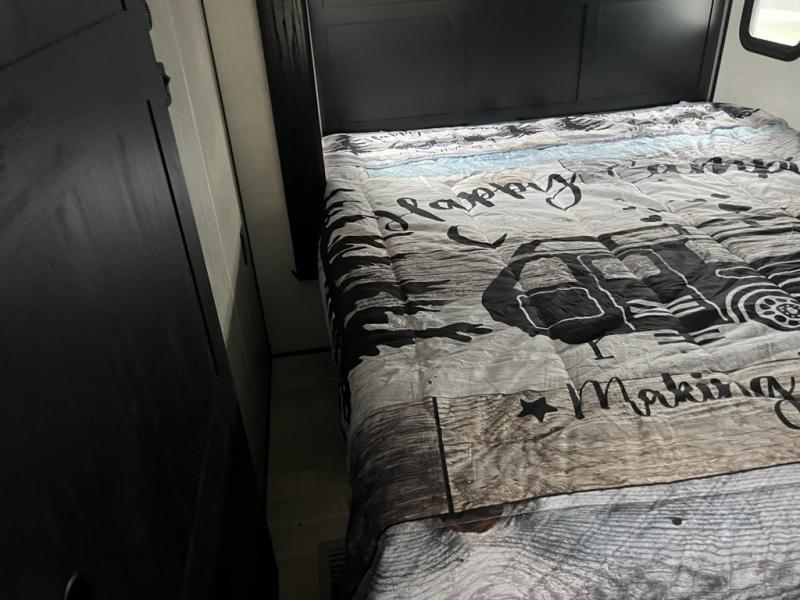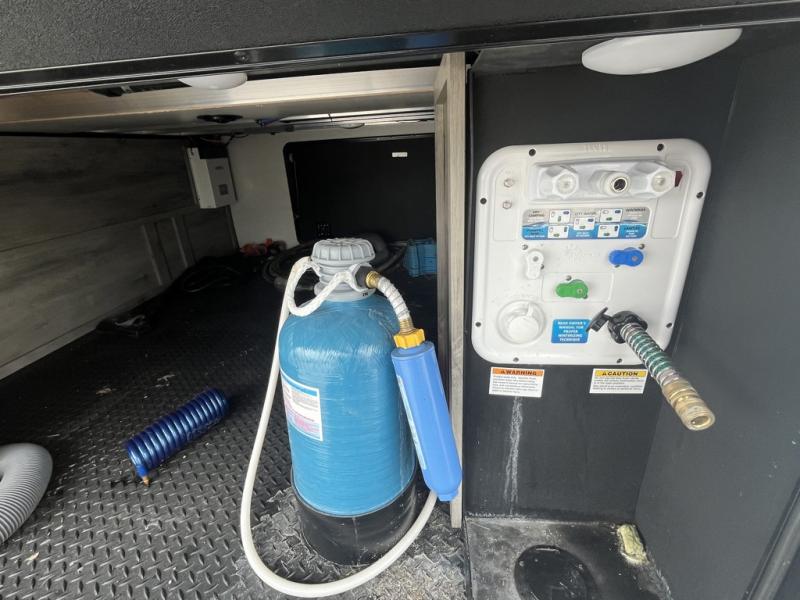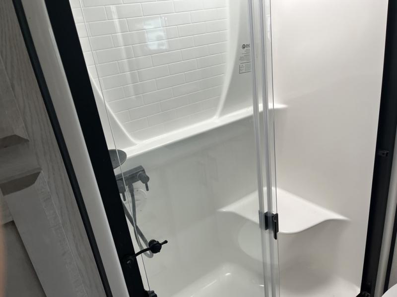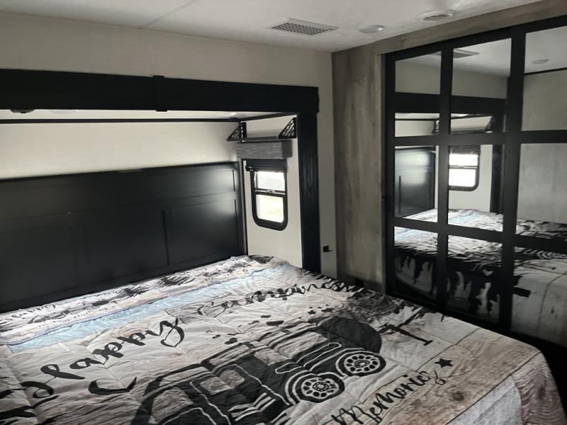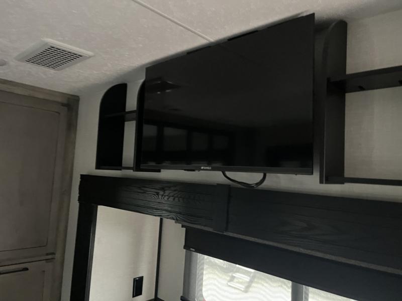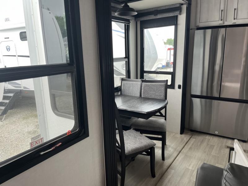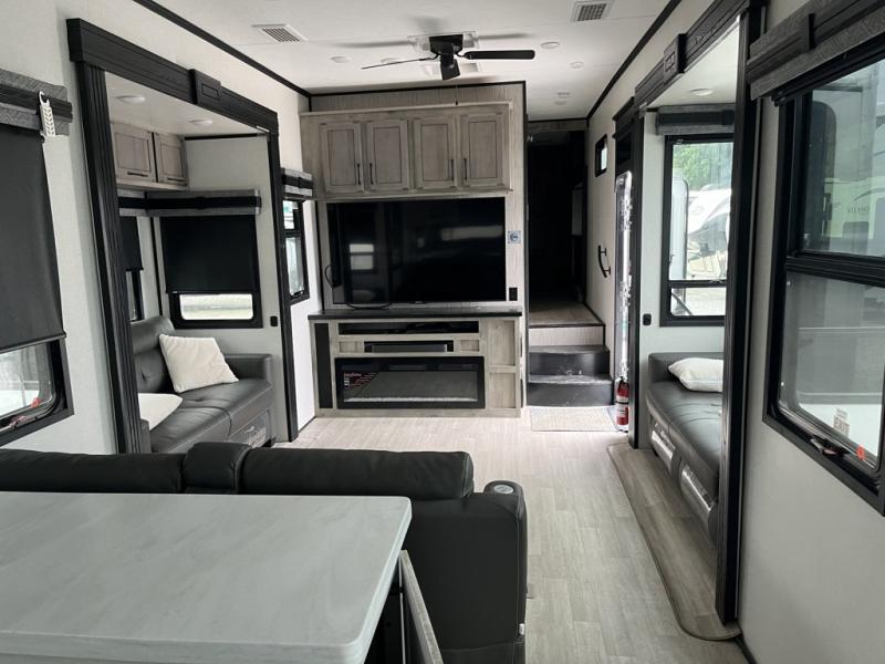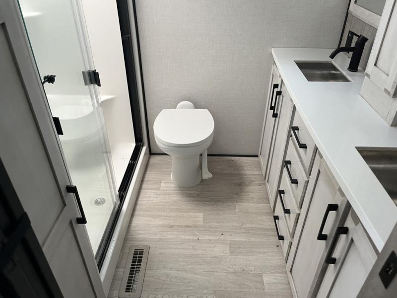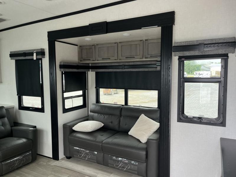 Any cook will love this fifth wheel's layout with a rear kitchen which includes residential appliances, a farmhouse stainless steel sink, a dishwasher, solid surface countertops, a pantry, and a view of the middle, separate living area. You can even see the 65" LED TV with fireplace below from the slide out which includes the legless table with chairs unless you choose the full-timer's desk option for that convenience. The theater seating with USB ports, and two hide-a-bed sofa slides widen this area so everyone can stretch out and relax. At night retire to your own front bedroom with a slide out king electric tilt bed with drawers underneath, a front wardrobe including a washer/dryer prepped space, and a closet with a built-in hamper, plus a slide out dresser with a 32" Smart LED TV above it. And the full bathroom provides a residential shower with a seat plus linen storage, and two sinks for more convenience.