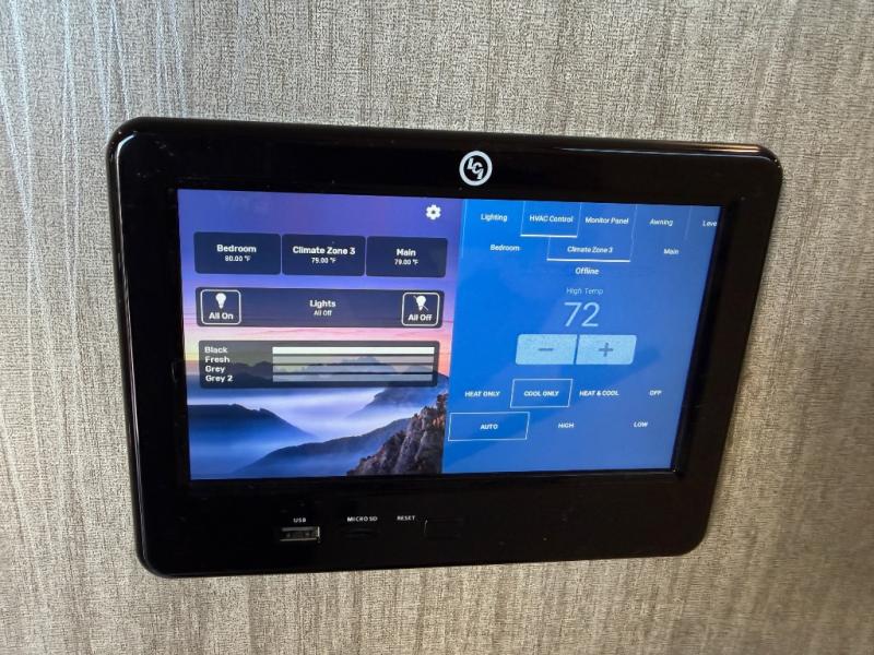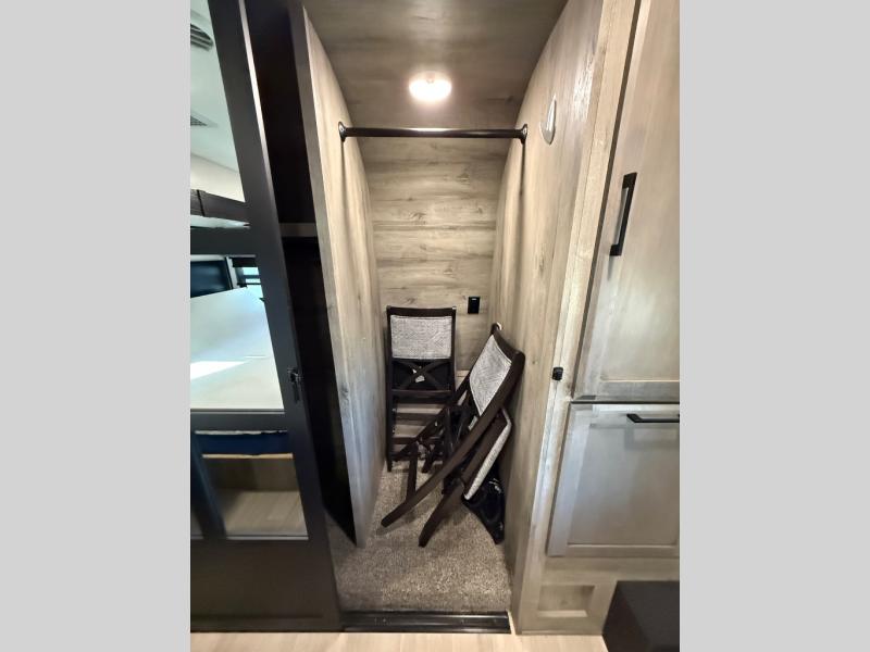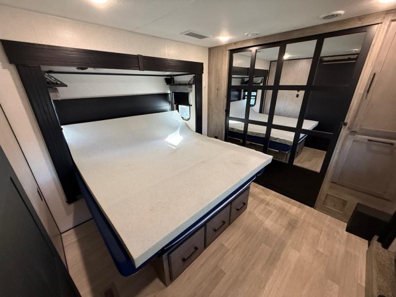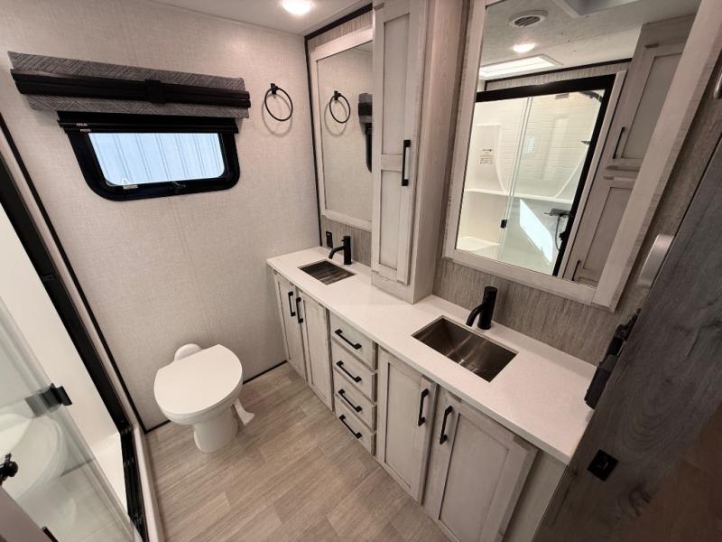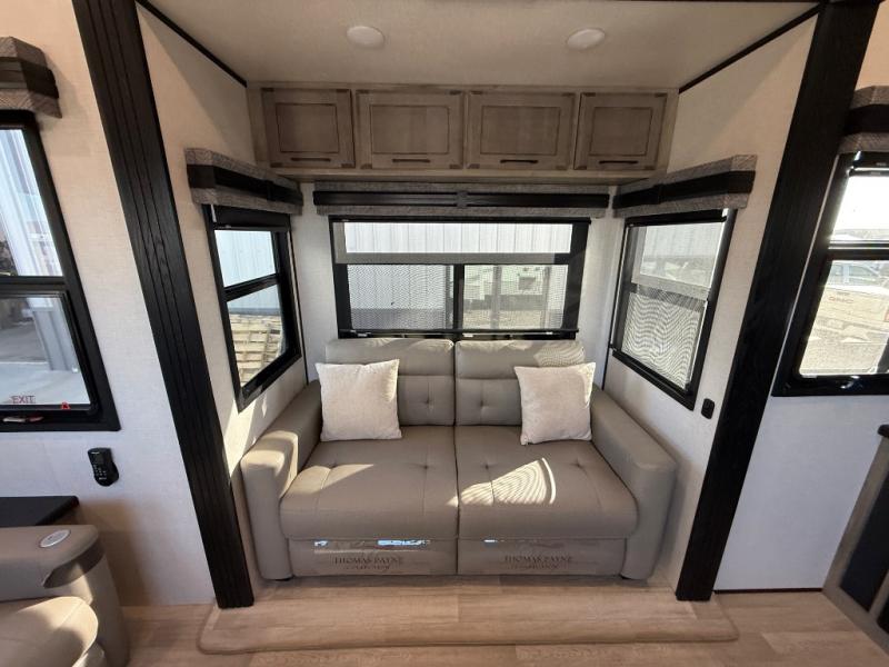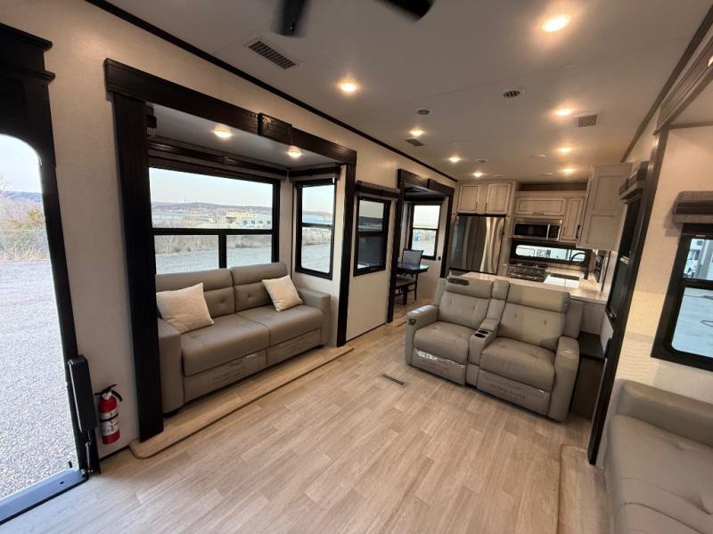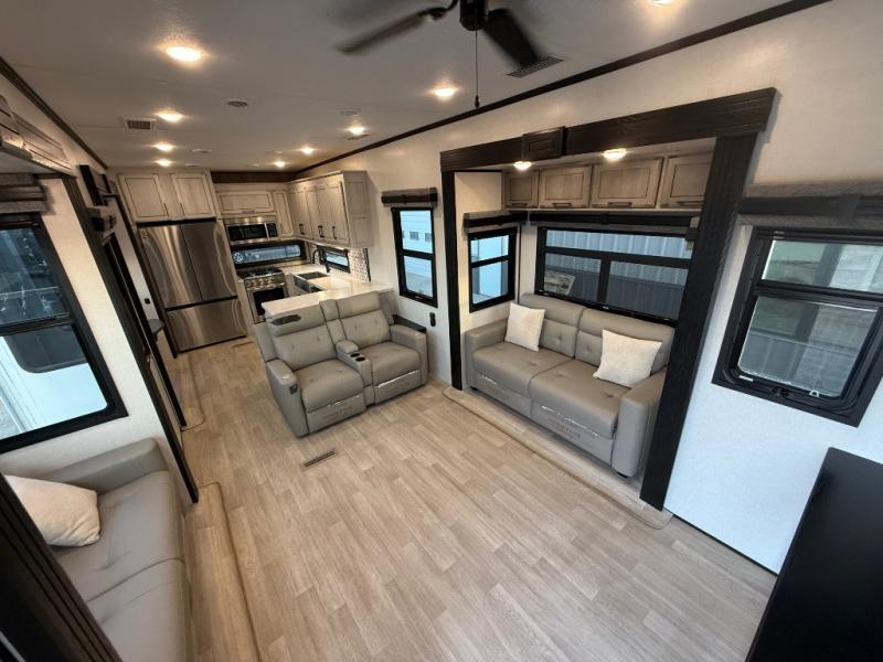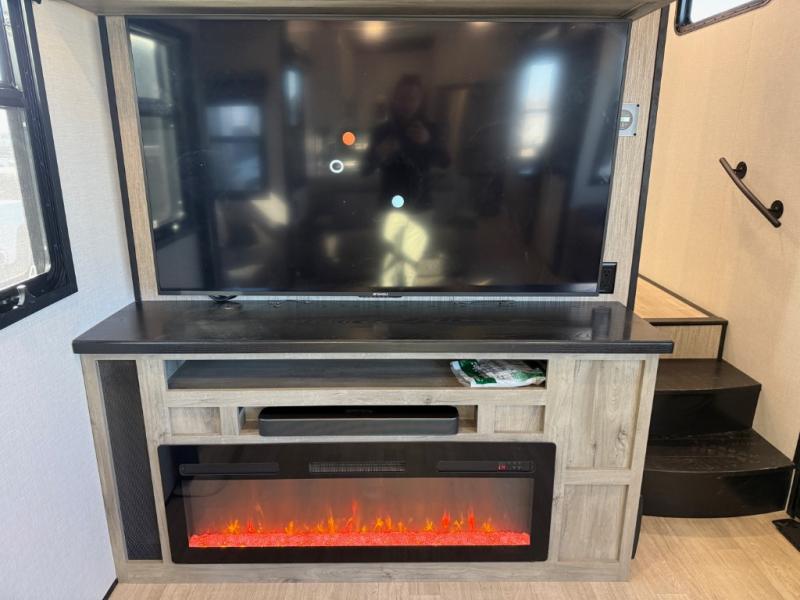 Any cook will love this fifth wheel's layout with a rear kitchen which includes residential appliances, a farmhouse stainless steel sink, a dishwasher, solid surface countertops, a pantry, and a view of the middle, separate living area. You can even see the 65" LED TV with fireplace below from the slide out which includes the legless table with chairs unless you choose the full-timer's desk option for that convenience. The theater seating with USB ports, and two hide-a-bed sofa slides widen this area so everyone can stretch out and relax. At night retire to your own front bedroom with a slide out king electric tilt bed with drawers underneath, a front wardrobe including a washer/dryer prepped space, and a closet with a built-in hamper, plus a slide out dresser with a 32" Smart LED TV above it. And the full bathroom provides a residential shower with a seat plus linen storage, and two sinks for more convenience.
