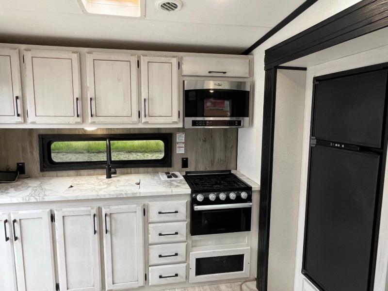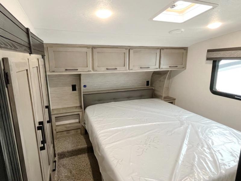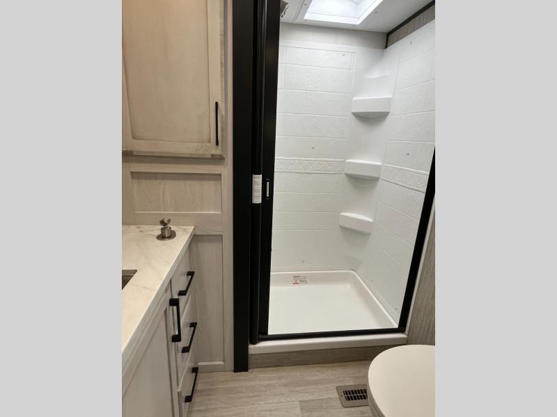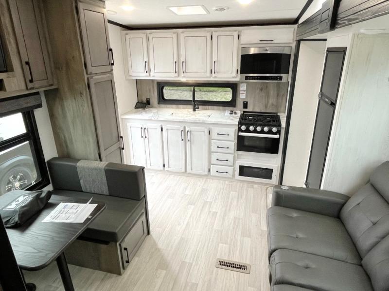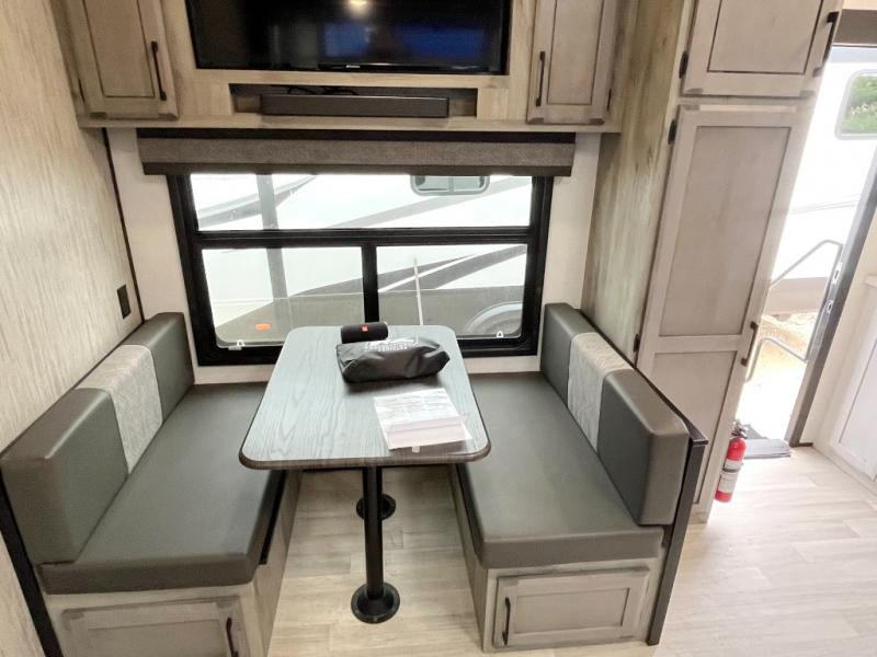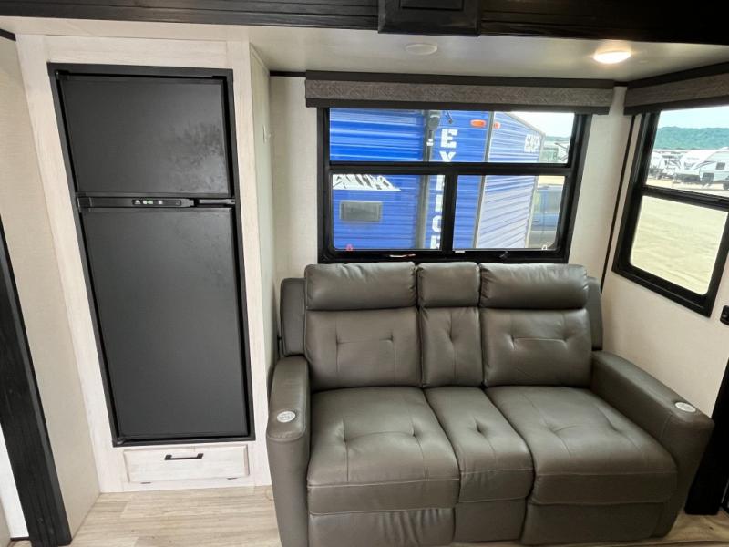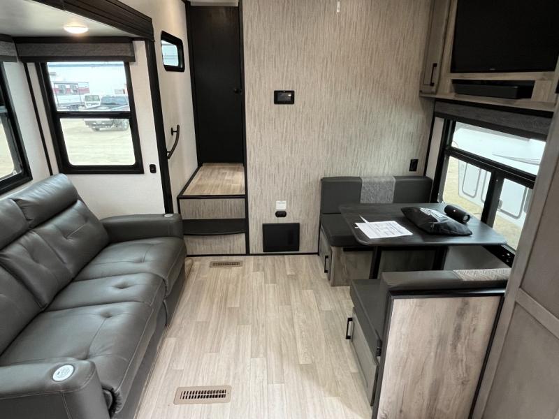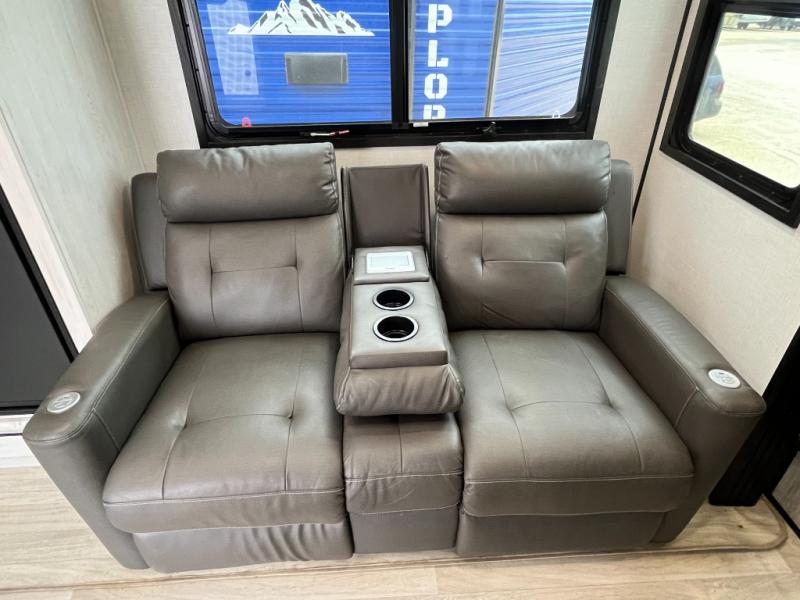 This rear kitchen fifth wheel is perfect for weekend trips to the lake. You will love how much counter space you have in the kitchen, as well as a pantry to store dry goods, a three burner drop-in cooktop with a glass cover, and a 8 cu. ft. gas/electric refrigerator. Your crew can relax on the hide-a-bed sofa or play a game at the booth dinette after dinner is done, or you can head outdoors to visit under the 18' power awning. Choose the theater seating option in place of the hide-a-bed sofa if you're not needing the additional sleeping space. The front private bedroom will make you feel right at home with its queen bed, slide out wardrobe, and a closet with washer and dryer prep!