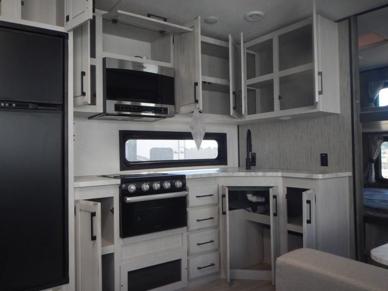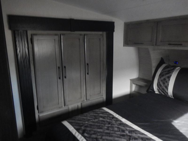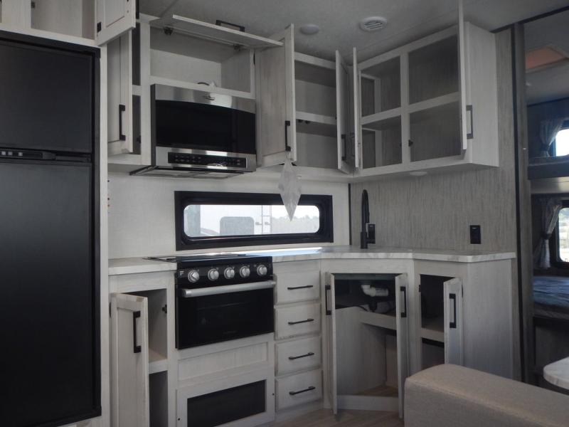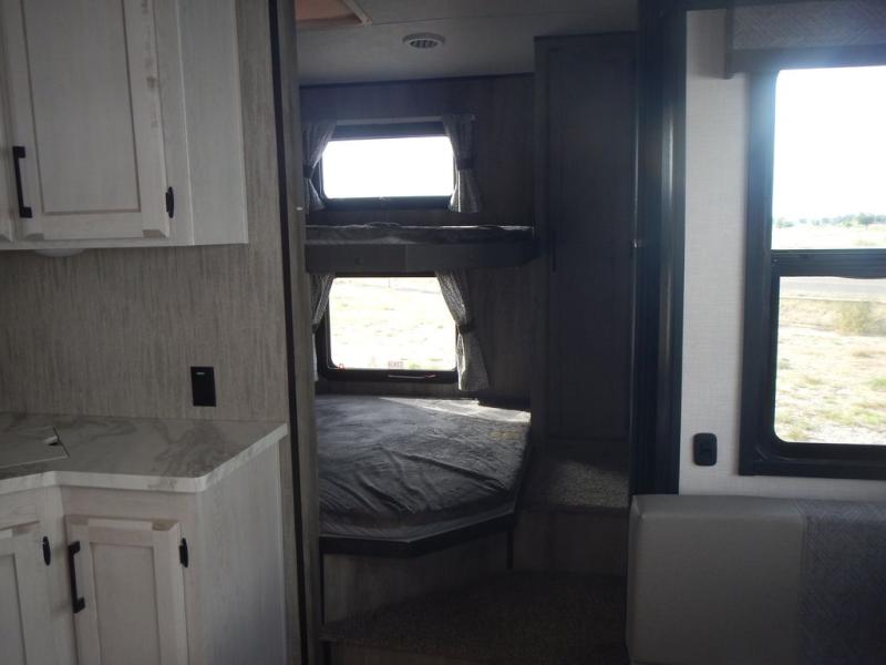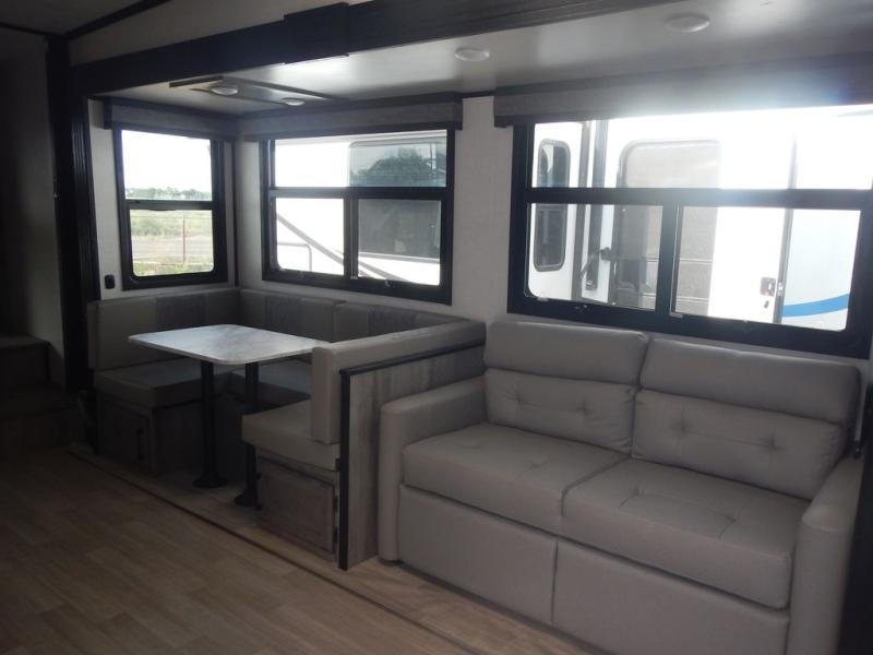 This fifth wheel is perfect for camping with a large group or family since it can sleep ten people each night! There are queen-size bunks, a U-shaped dinette, a hide-a-bed sofa, plus a queen bed in the front private bedroom. The chef will have their choice to cook indoors on the three burner drop-in cooktop or outdoors on the outside griddle, plus there are two 14' power awnings here for maximum shade. Don't let this fifth wheel slip away!