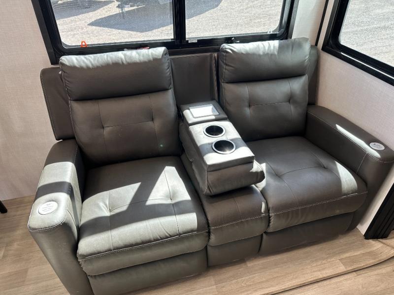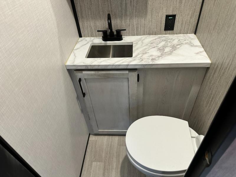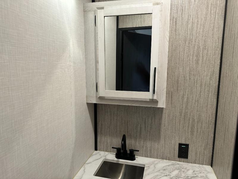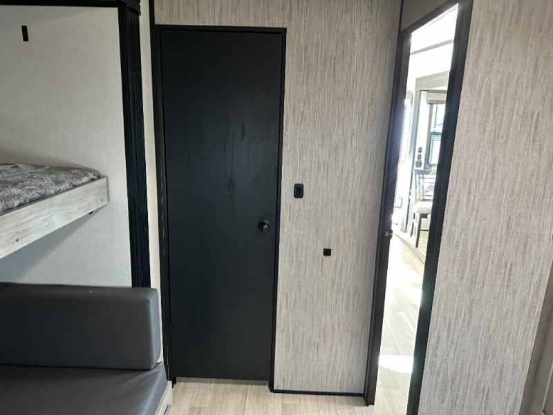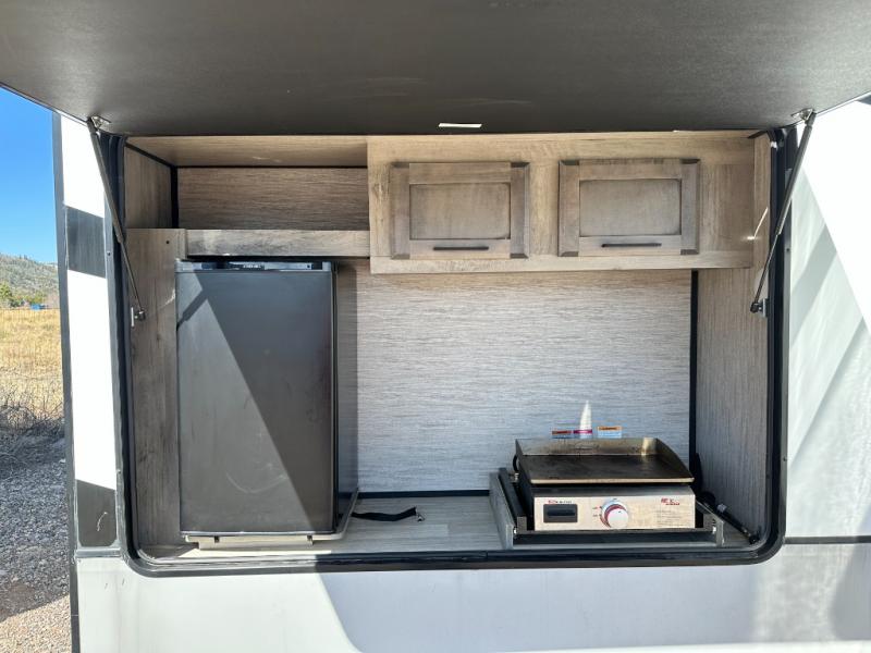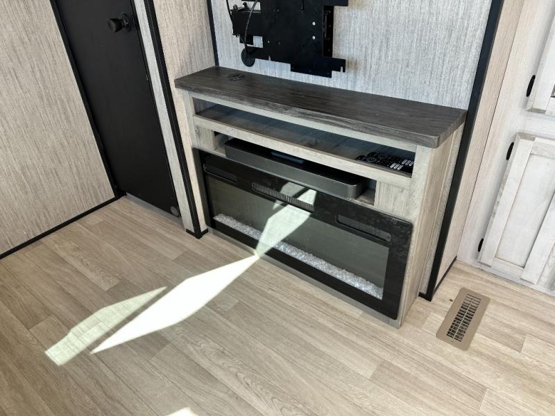 Your guests will feel right at home when they go camping with you since they will have their own bunkhouse suite with a half bath! There are three bunks here, plus an entertainment center if they choose to add a TV. The spacious full bath is up by the front private bedroom, and here you'll enjoy a queen bed, a slide out wardrobe, plus a closet with washer and dryer prep. Everyone can meet in the main living area at the booth dinette, or on the theater seating, plus this area includes a 43" Smart LED TV and an optional 40" fireplace can be added. Head outdoors to cook on the outside kitchen that includes a griddle, a sink, plus a refrigerator. There is also a 13' power awning here, and a second optional 11" awning can be added for even more shade!