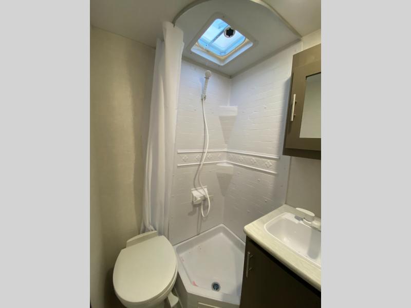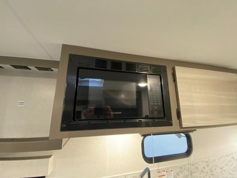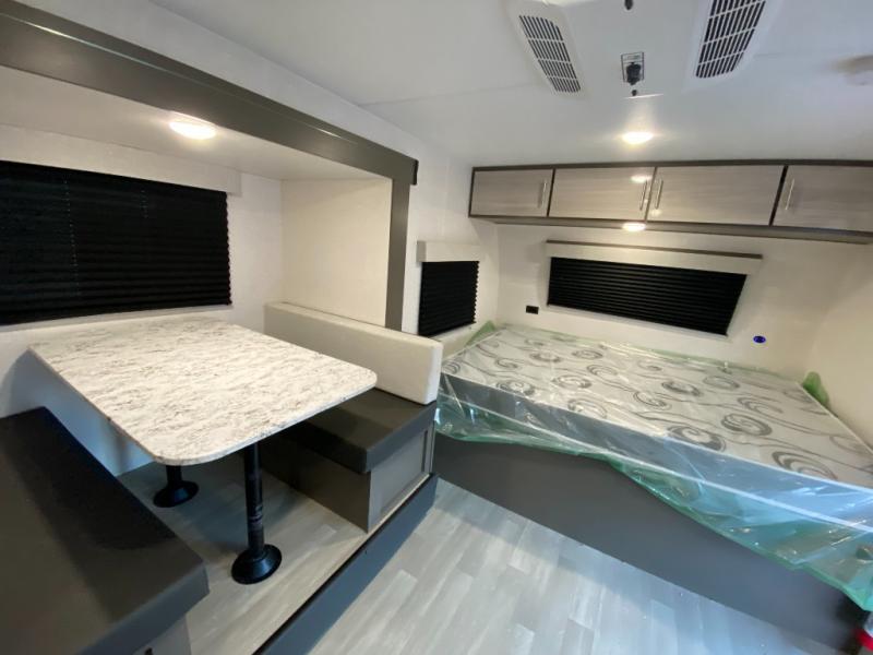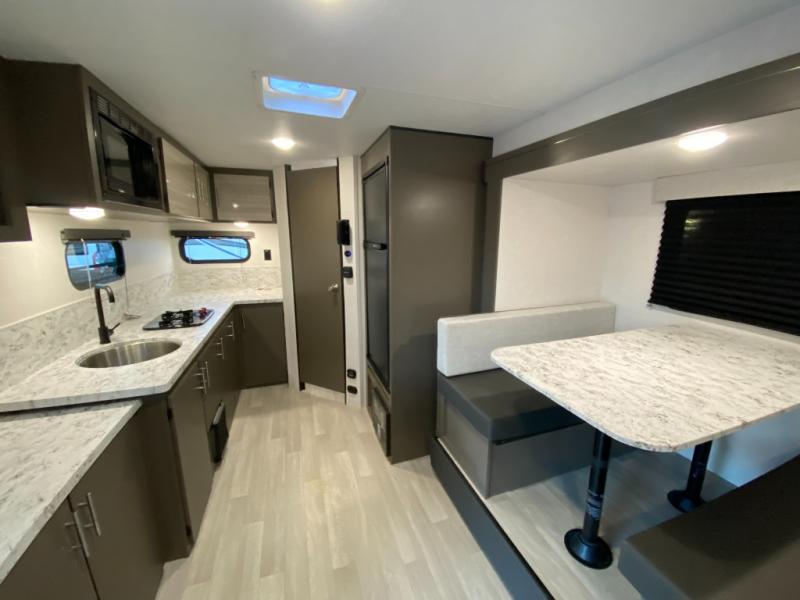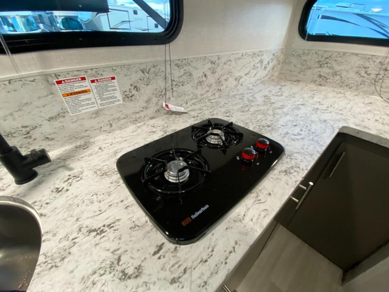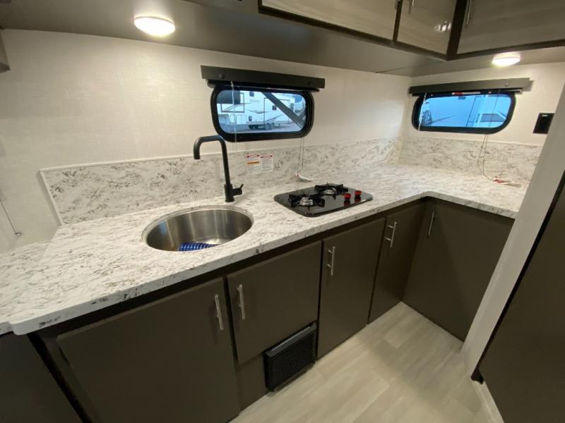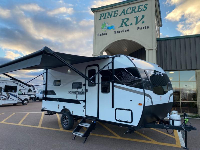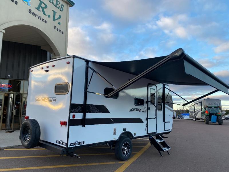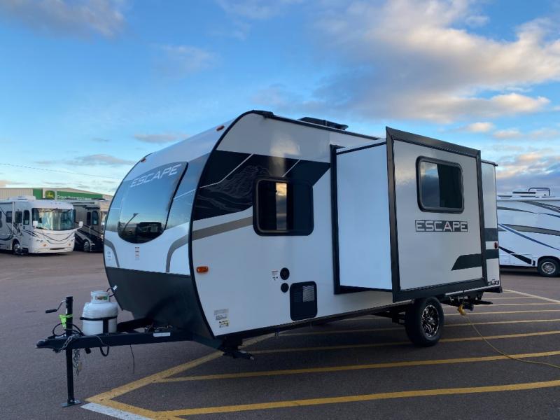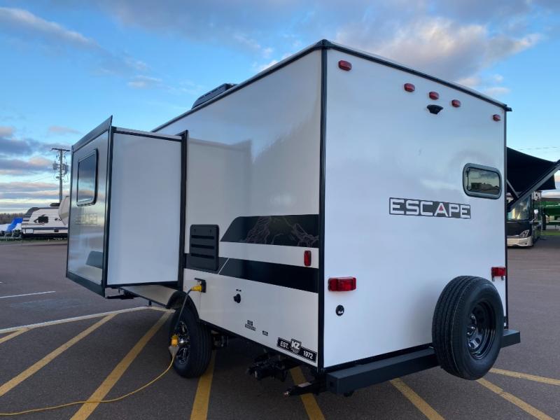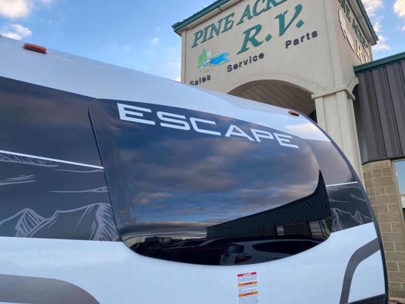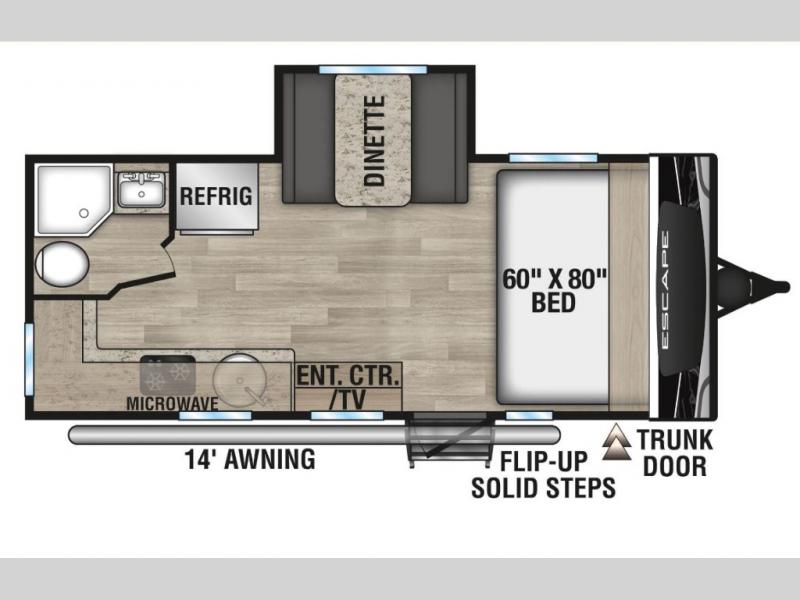 A perfect ultra lightweight towable for any couple that loves adventures! This Escape unit features a rear corner bath with angled shower, toilet, and vanity with sink, plus overhead medicine cabinet. No late night trips to the campground facilities! In the morning, you can easily create a great breakfast to get your day started using the two burner cook-top and microwave oven. The dinette slide not only creates more room inside, but is a comfortable place to enjoy each meal when indoors, or to play a few games. There is a queen bed for a great night's rest, and the dinette can also be folded down for added sleeping space for children or a guest. On the outside, you will enjoy a 14' awning which creates a nice outdoor living space protected from the summer sun and rain, and the trunk door up front is great for storing all of your camp chairs, rugs, and outdoor games and gear.