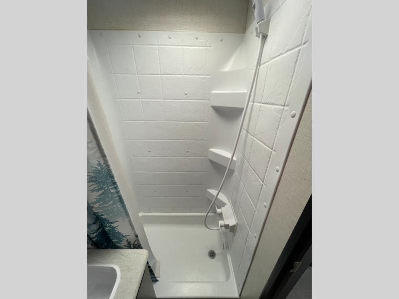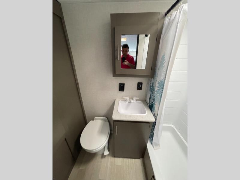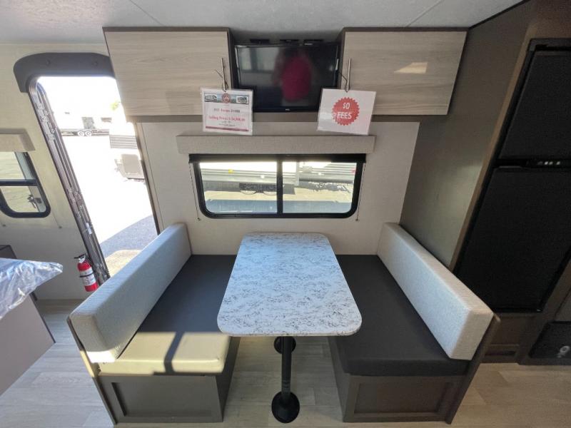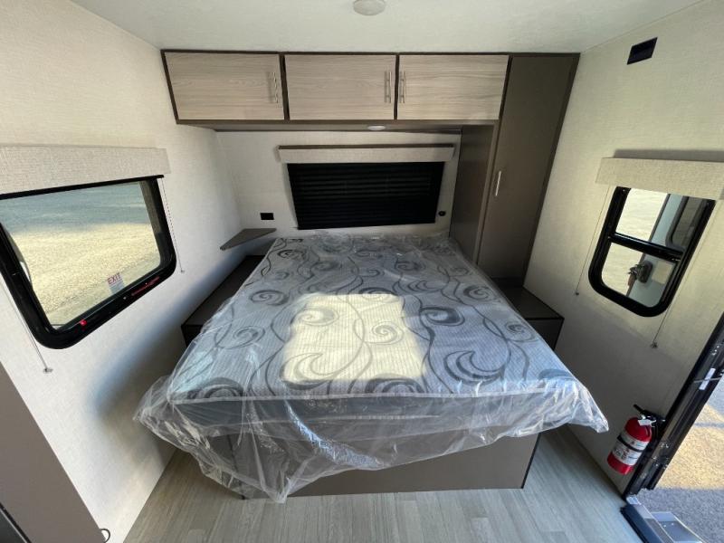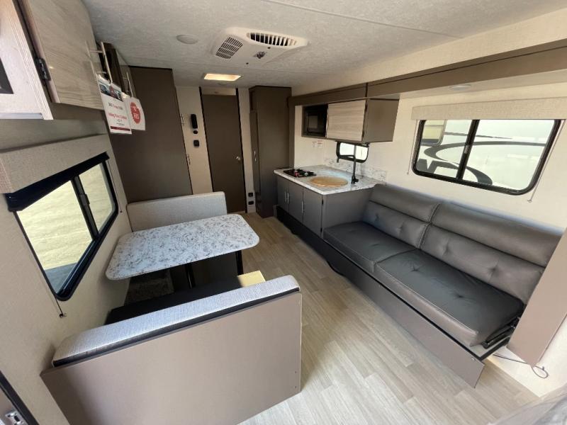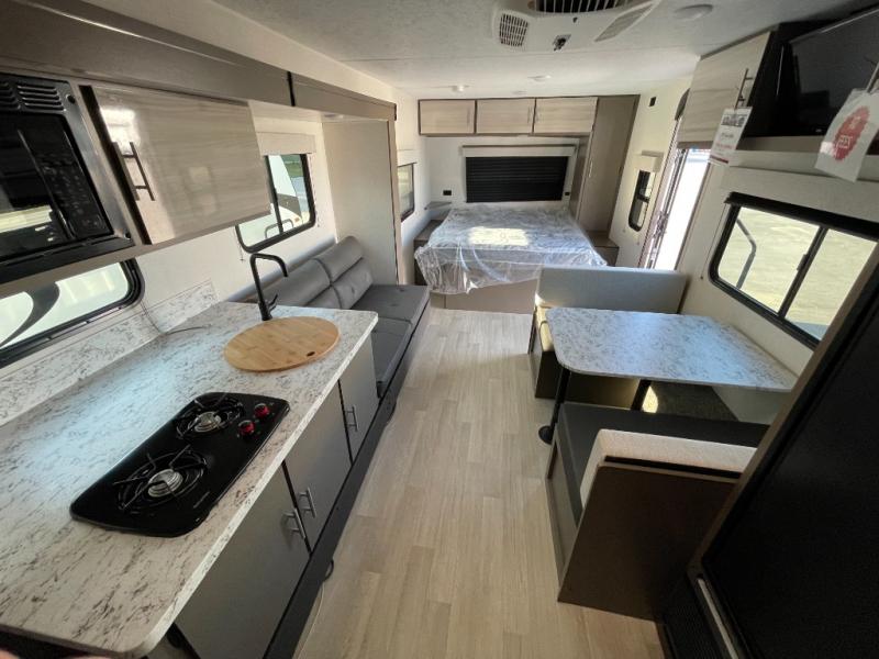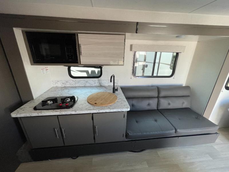 If you're ready to escape the hustle and bustle of everyday life then you need this travel trailer! The full rear bathroom has a shower and a wardrobe to keep you towels close. Just outside the bathroom is a storage area next to the two burner cooktop, the microwave, and the stainless steel round sink. Grab a snack from the pantry or a cold pop from the 8 cu. ft. 12V refrigerator and enjoy them at the booth dinette. You could even relax on the sofa while watching a movie on the TV. When you're ready to wind down your nights, lay down on the front queen bed with a nightstand on one side for you glass of water and a wardrobe on the other for your clothes.