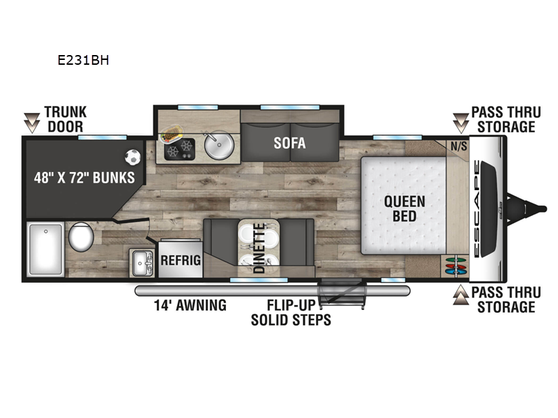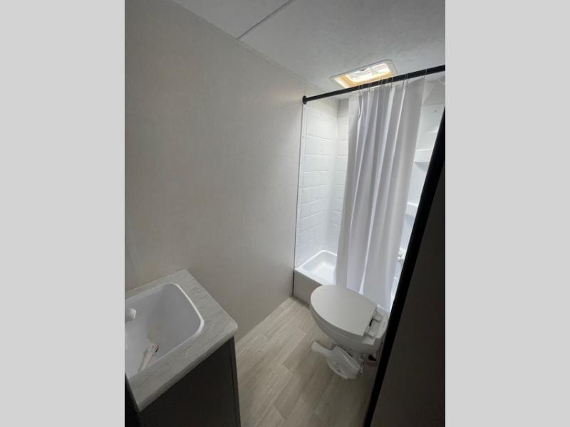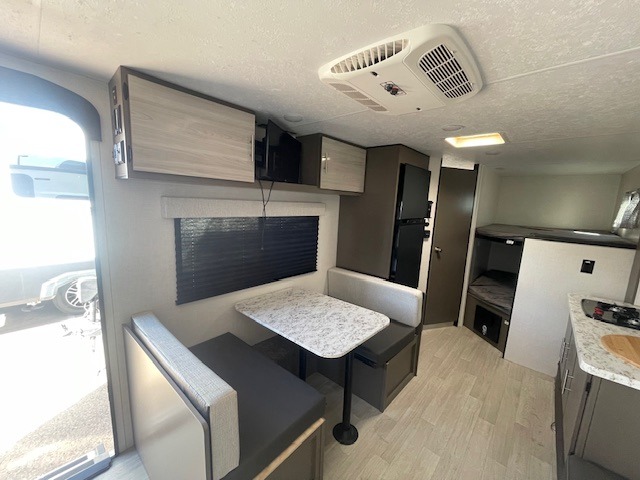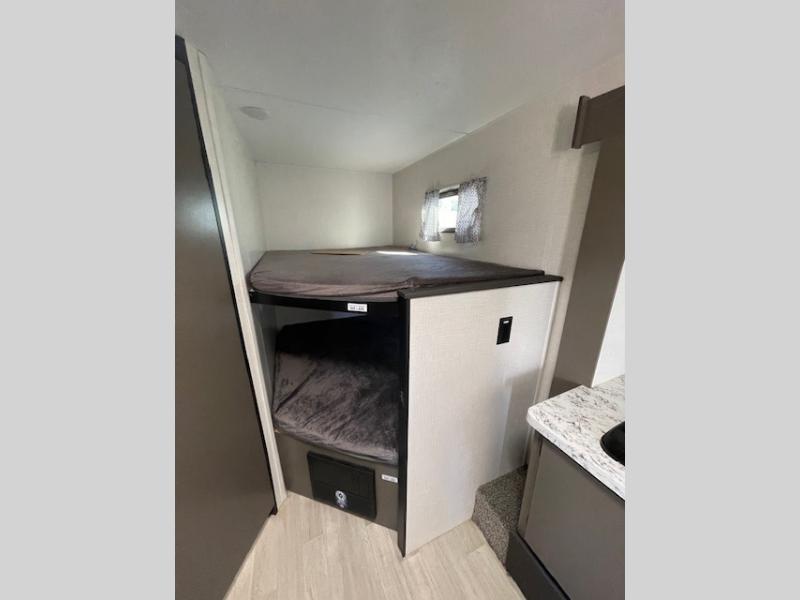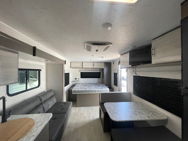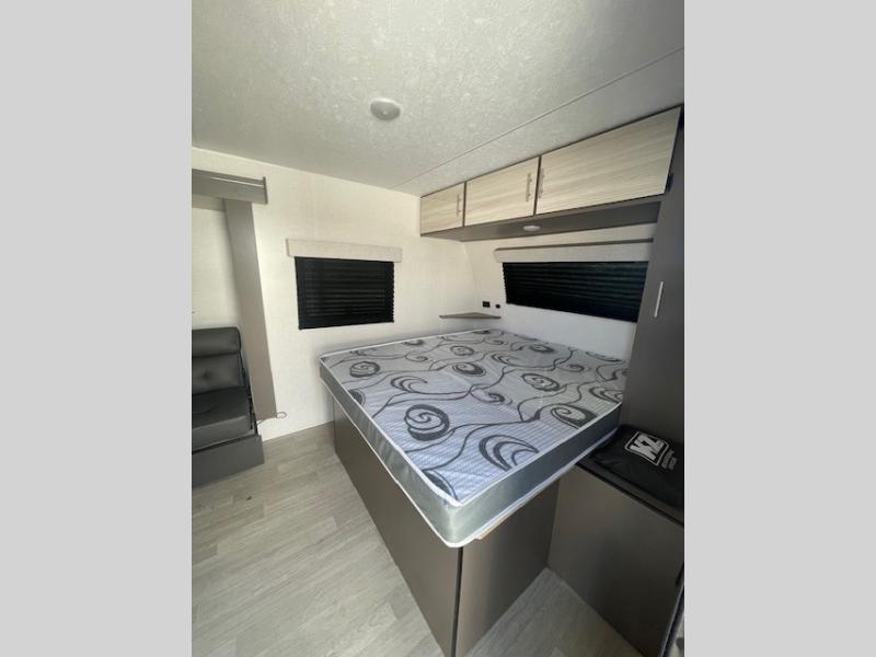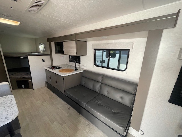 This travel trailer is big enough for you to bring the whole family or some friends to the campground! You can rest on the front queen bed with a nightstand on one side and a wardrobe on another while the kids or guests sleep on the corner set of 48" x 72" bunk beds. The rear corner bathroom has a shower for everyone to freshen up in each morning. Grab some eggs from the 8 cu. ft. 12V refrigerator and fry them up on the two burner cooktop then enjoy them at the booth dinette. The dinette and sofa can also transform into extra sleeping spaces if needed.