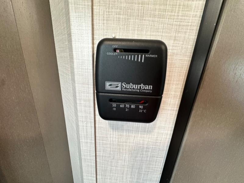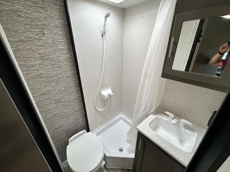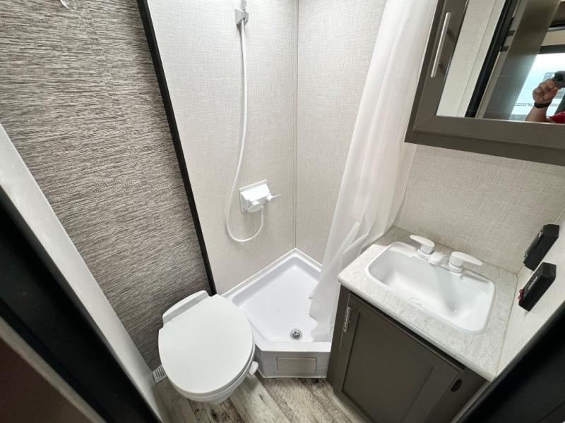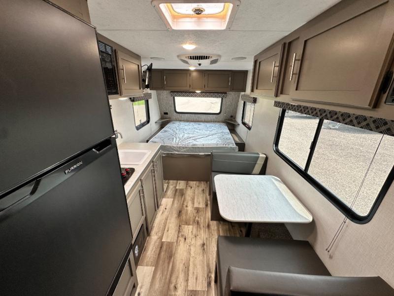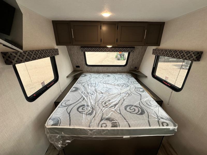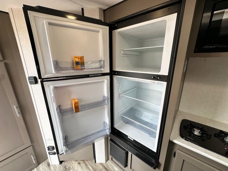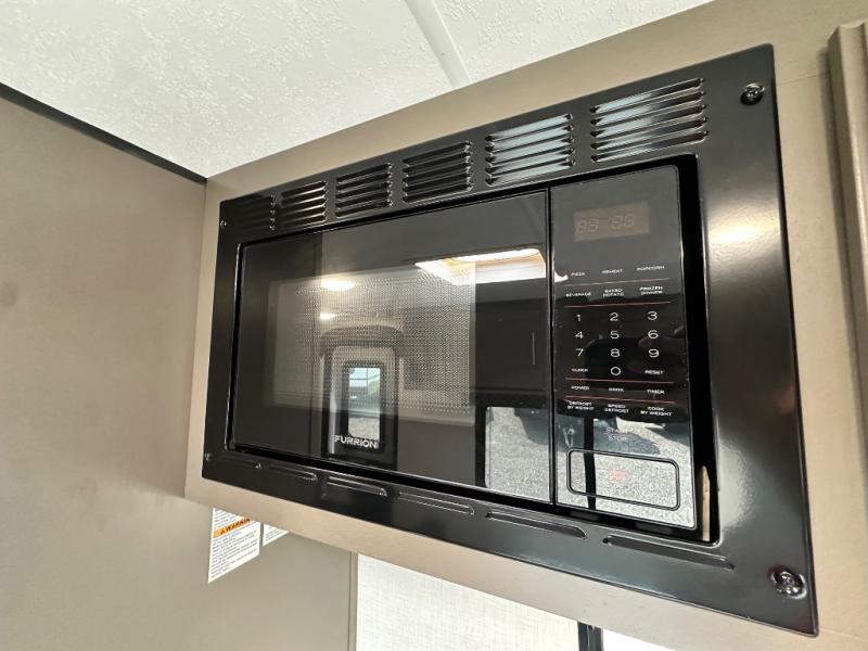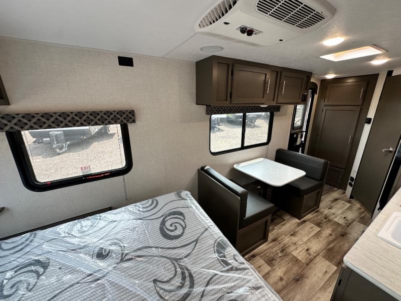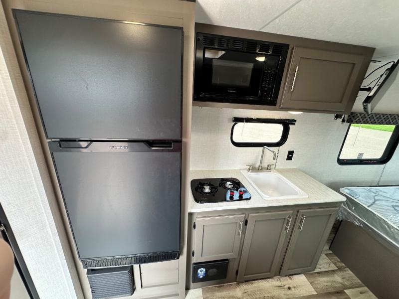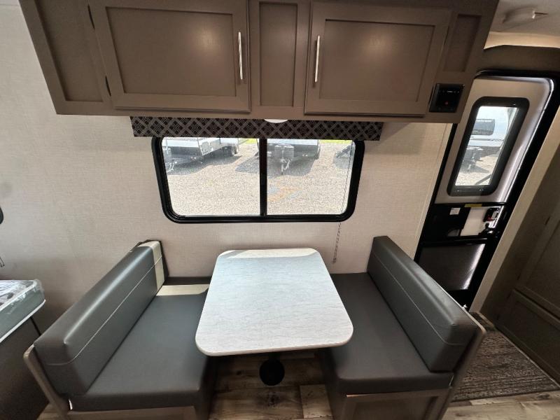 This travel trailer will feel just like home with its full bath, walk-around queen bed, and plenty of storage space for your belongings. Once you arrive at the campground, grab your fishing poles from the pass-through storage and head down to the river. You can get cleaned up in the full bath before heading to the kitchen to prepare a meal on the two burner cooktop or in the microwave oven. There is a comfortable booth dinette to dine at, and this space can double as sleeping space for overnight guests or two little ones.