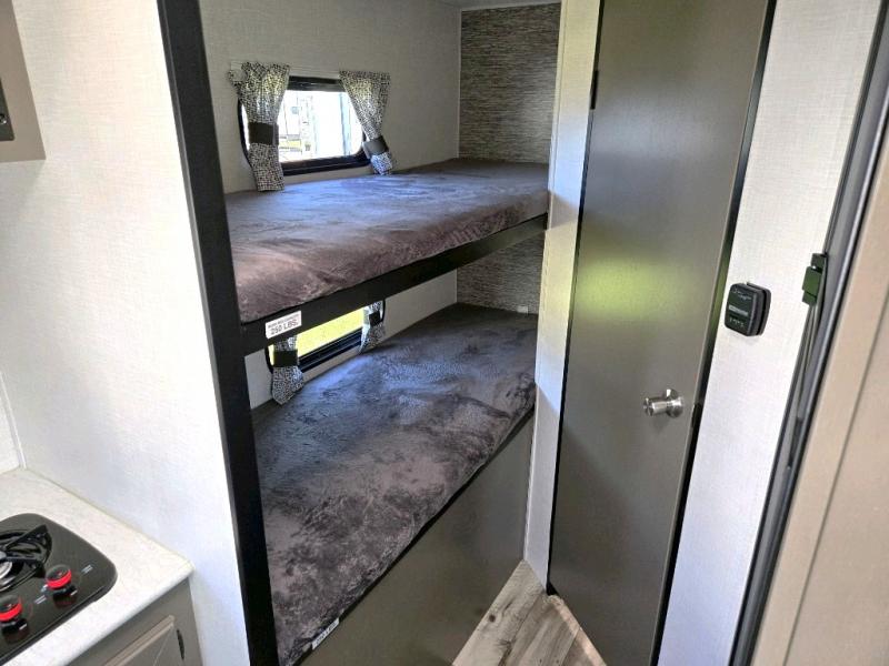 You're going to love camping in this spacious travel trailer that can sleep five people each night. When you arrive at your destination, set up the 14' power awning and start lunch on the outside kitchen. The little ones will love the bunk beds, and you will have the front RV queen bed all to yourselves. This model also includes a full bath that will allow you to stay clean!