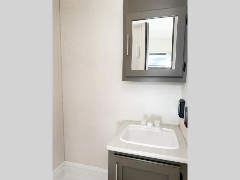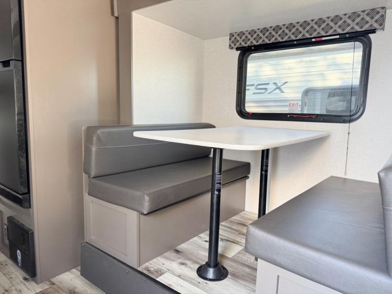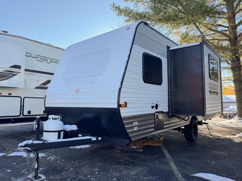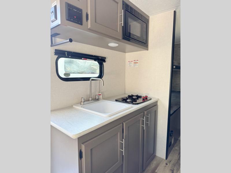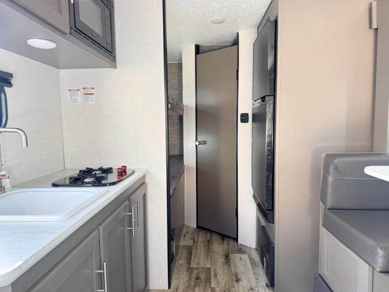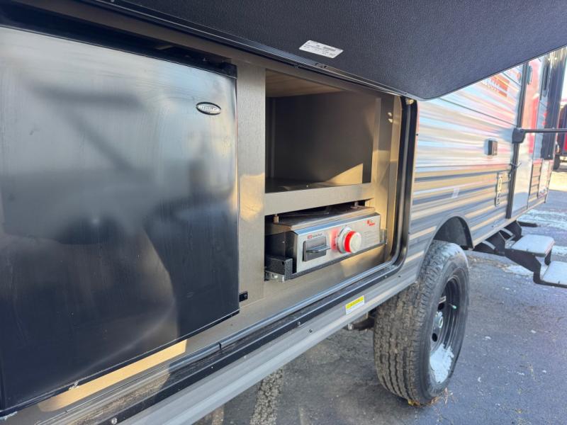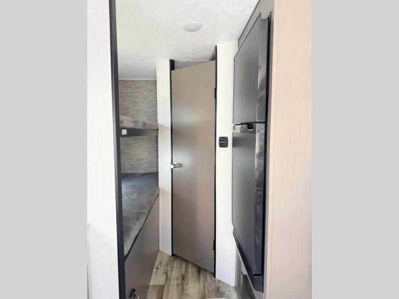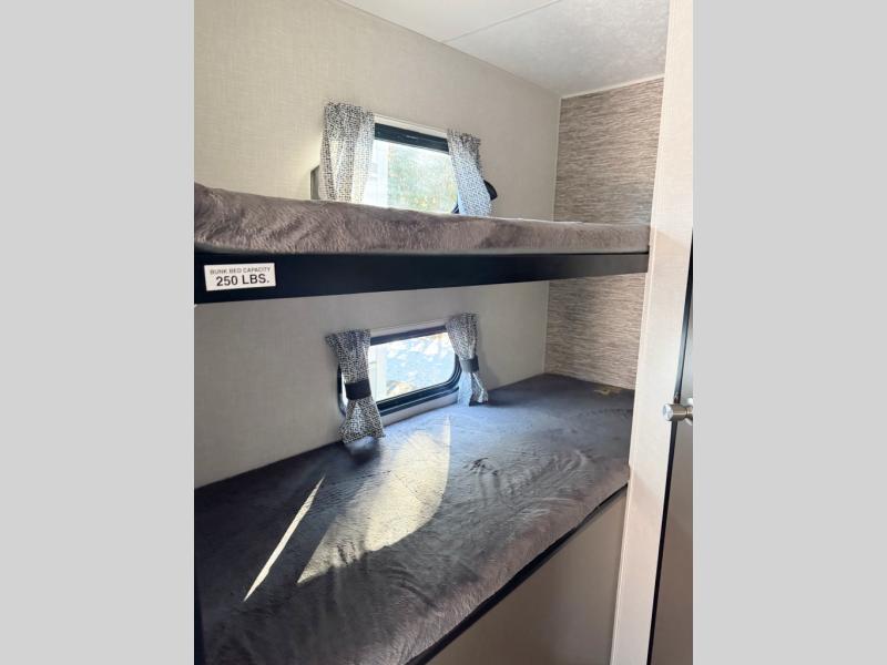 You're going to love camping in this spacious travel trailer that can sleep five people each night. When you arrive at your destination, set up the 14' power awning and start lunch on the outside kitchen. The little ones will love the bunk beds, and you will have the front RV queen bed all to yourselves. This model also includes a full bath that will allow you to stay clean!