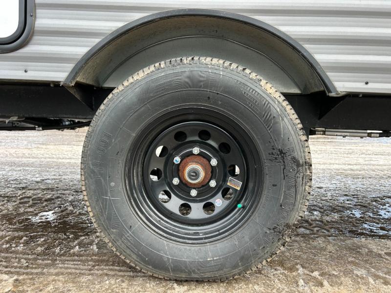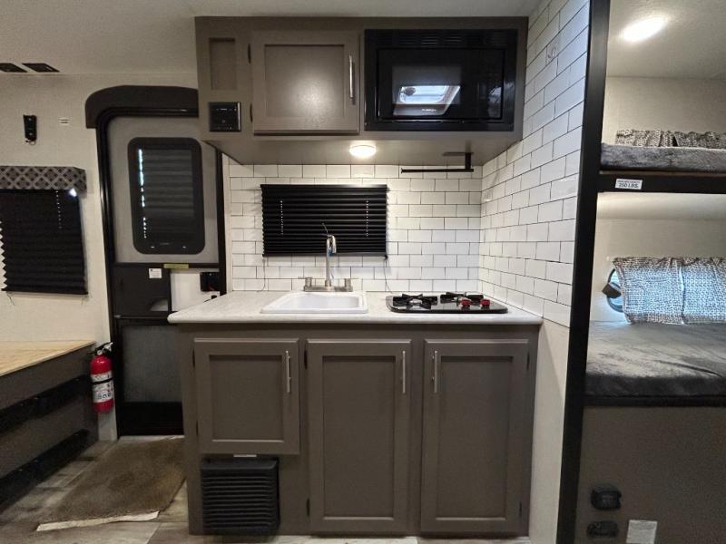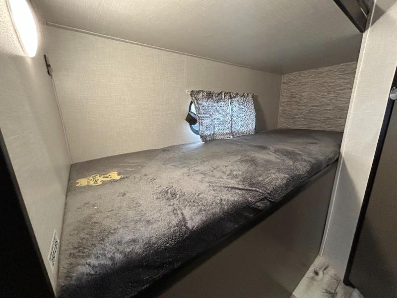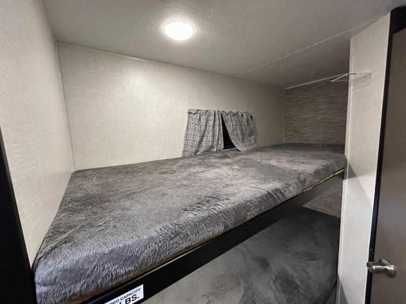 You're going to love camping in this spacious travel trailer that can sleep five people each night. When you arrive at your destination, set up the 14' power awning and start lunch on the outside kitchen. The little ones will love the bunk beds, and you will have the front RV queen bed all to yourselves. This model also includes a full bath that will allow you to stay clean!