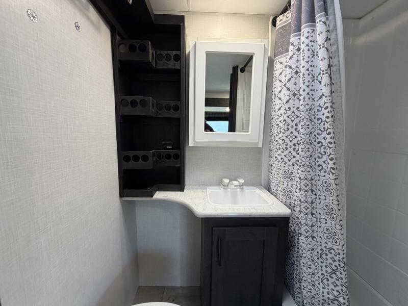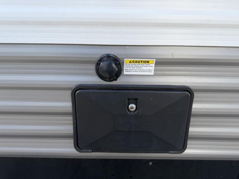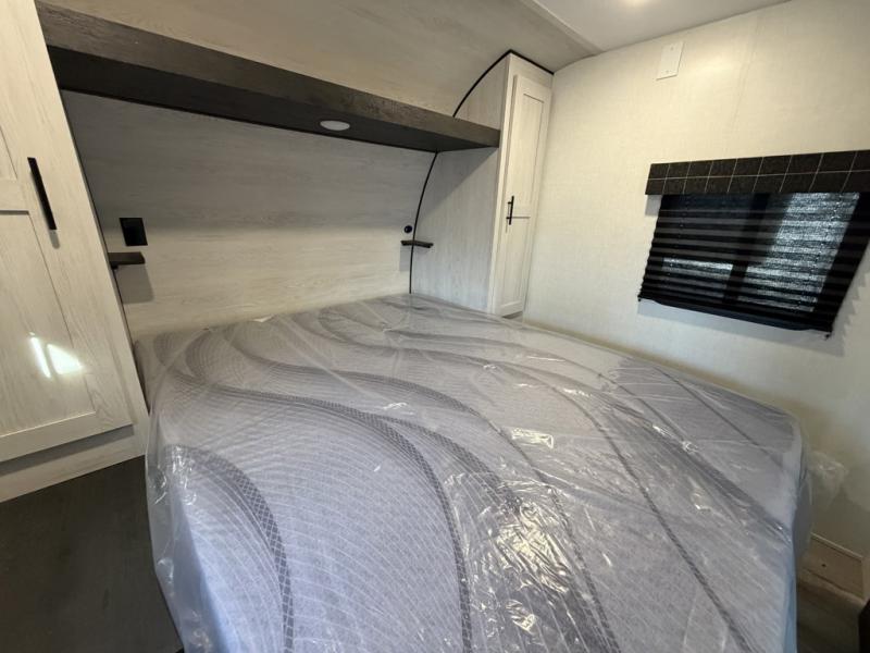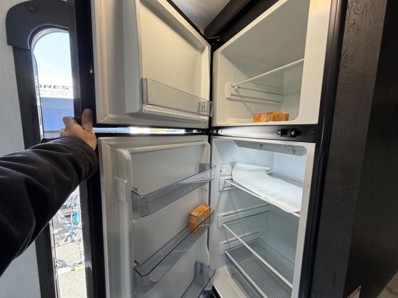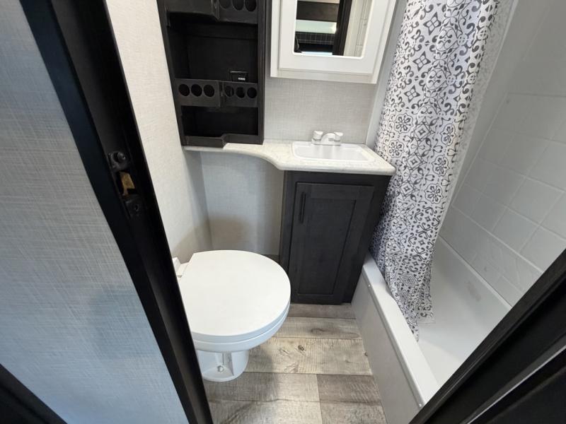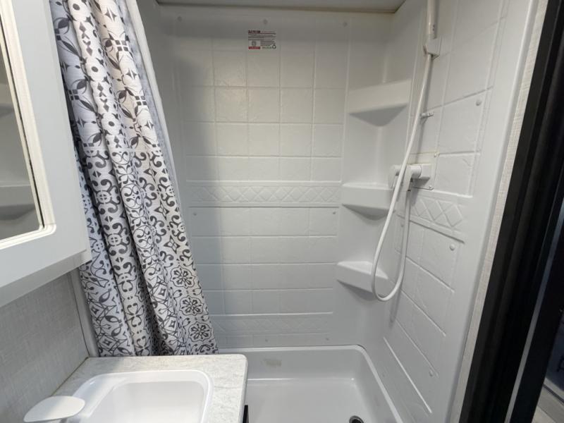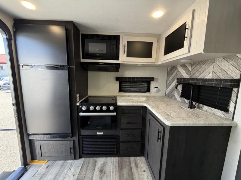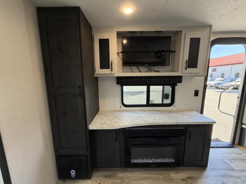 You will love the amount of interior space you have in this travel trailer thanks to the large slide out and rear kitchen with plenty of counter space. There is a 70" sofa and 42" booth dinette within the slide out across from the entertainment center, and you can add the optional 30" fireplace here for more comfort. The full bath includes a bath shelf with towel hooks, plus a foot-flush toilet for convenience. You will feel right at home in the front private bedroom that includes a queen bed, dual shirt closets, plus a TV mount if you choose to bring along a television.