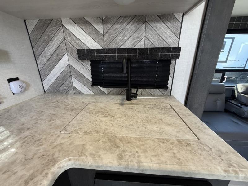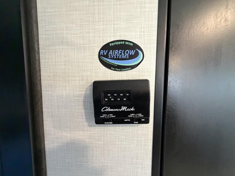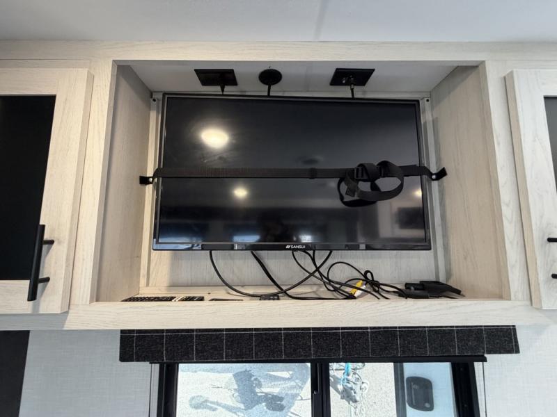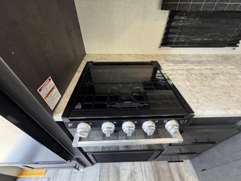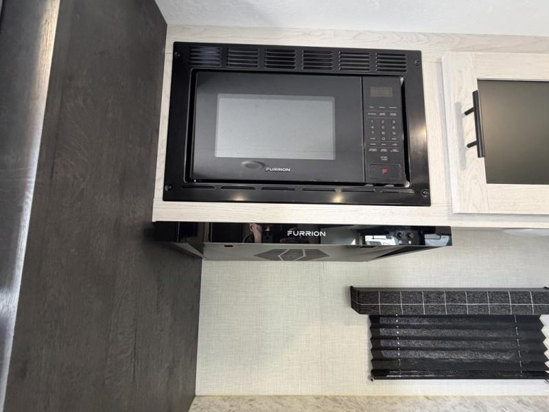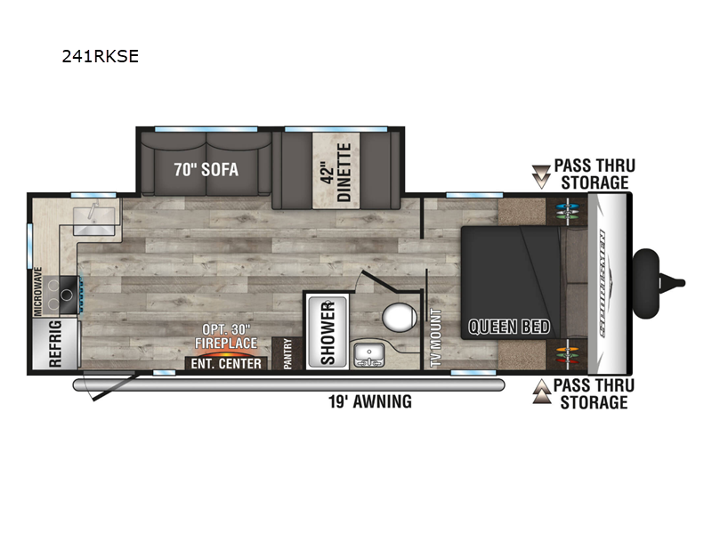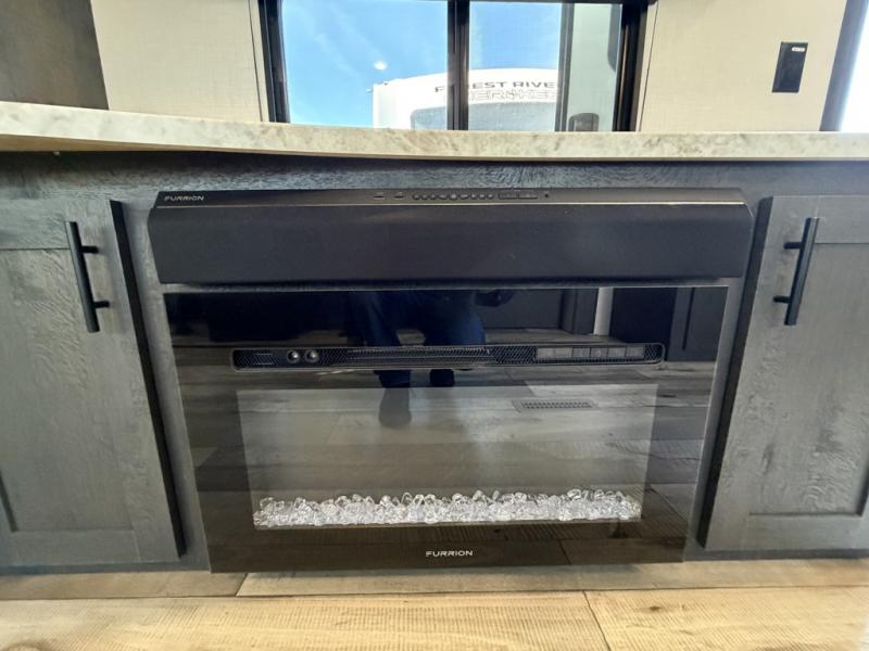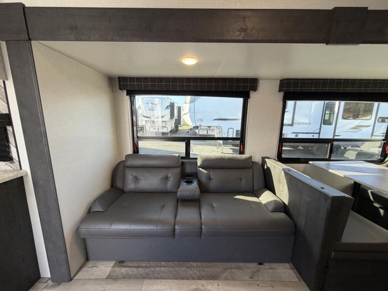 You will love the amount of interior space you have in this travel trailer thanks to the large slide out and rear kitchen with plenty of counter space. There is a 70" sofa and 42" booth dinette within the slide out across from the entertainment center, and you can add the optional 30" fireplace here for more comfort. The full bath includes a bath shelf with towel hooks, plus a foot-flush toilet for convenience. You will feel right at home in the front private bedroom that includes a queen bed, dual shirt closets, plus a TV mount if you choose to bring along a television.