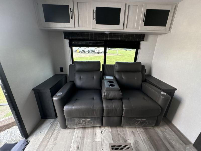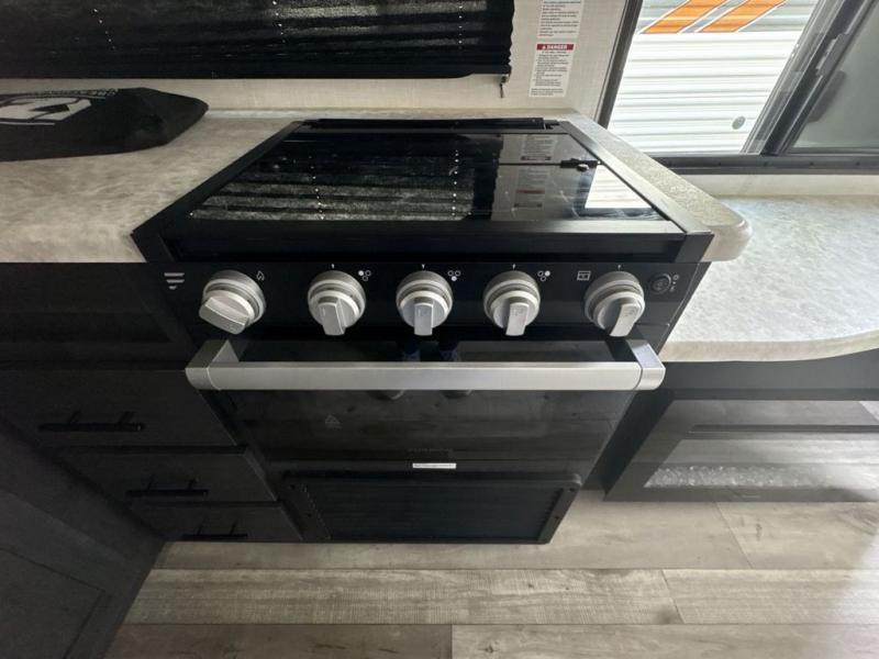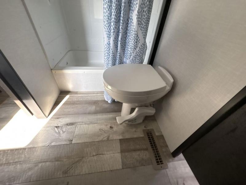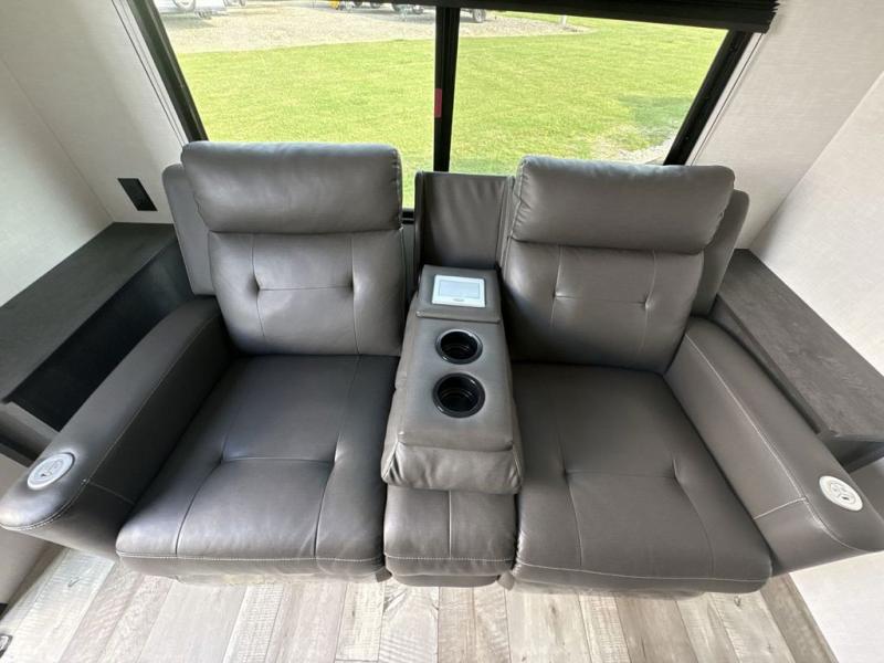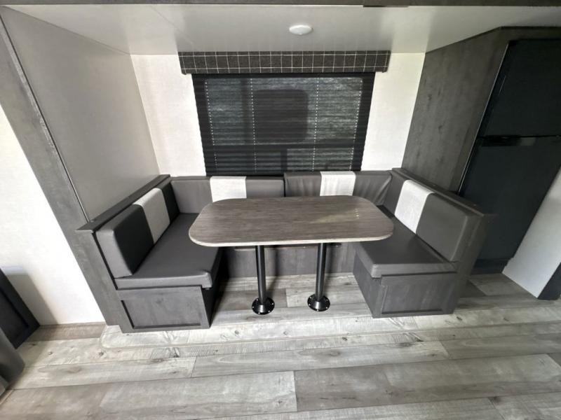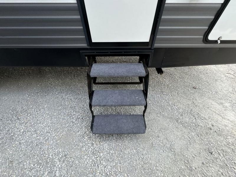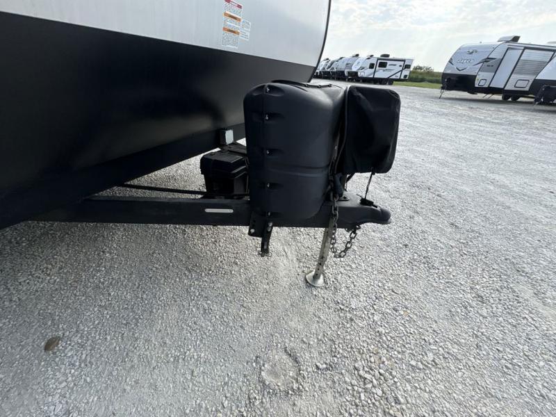 This model features dual entry doors which will make camping easier than ever! You can enter in through the front private bedroom, or the rear living area. The walk-through bath is easily accessible to everyone, and the large slide included in this model will provide the dog space to stretch out. Your crew can play a game around the U-shaped dinette after dinner, or head outdoors to relax under the 20' power awning with LED lights. You'll also find a 70" sofa in the rear living area that will be perfect for overnight guests. Don't let this model slip away!