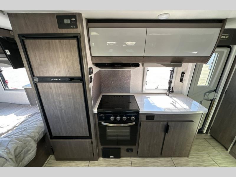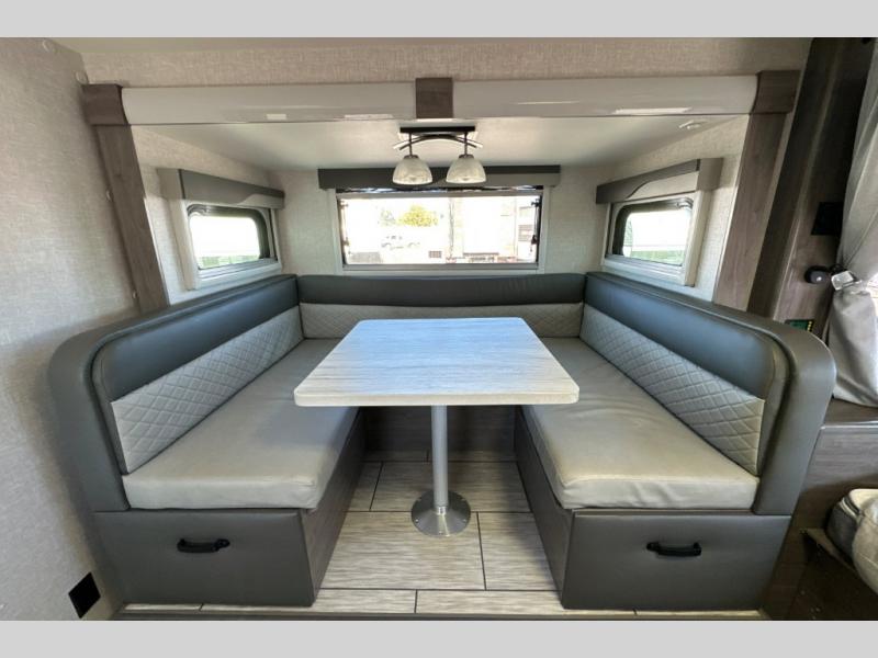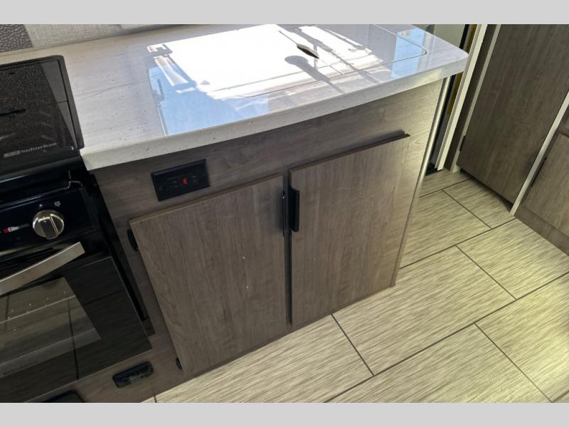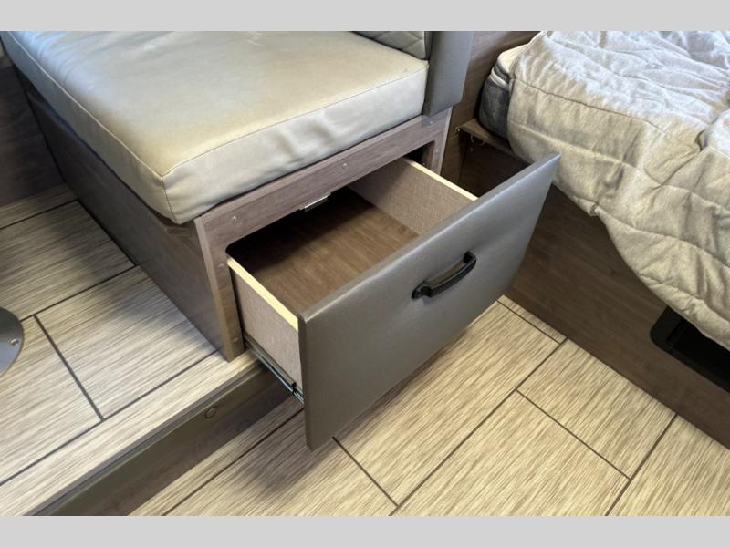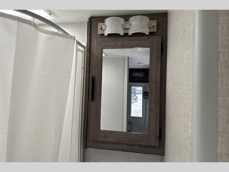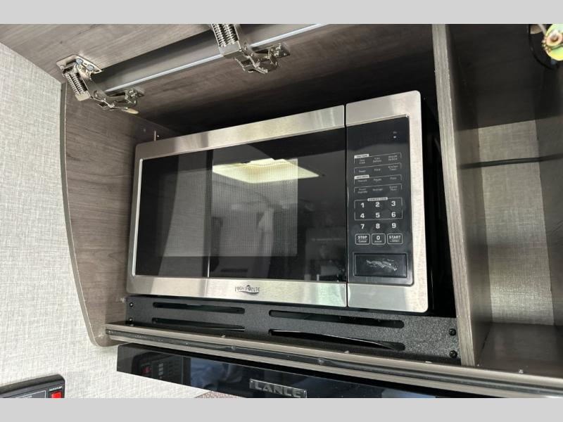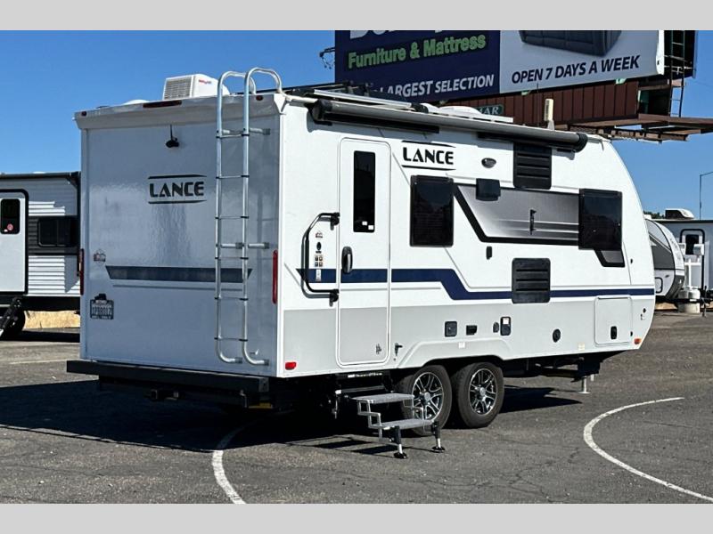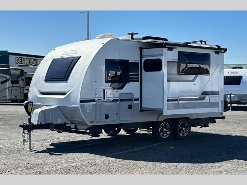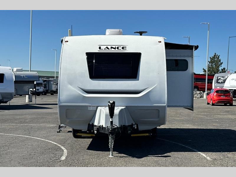 Gain your travel freedom with this Lance travel trailer! Trips will be more enjoyable and definitely more stylish with this trailer. You have solid-surface countertops in the kitchen, hardwood flat-panel cabinet doors, radius Euro overhead cabinet doors with decorative pulls and LED lighting, a wall clock, and a key hanger. The deluxe queen pillowtop innerspring mattress has two LED reading lights that you can use before you're ready to call it a night, and there is a privacy curtain that you can draw to section the bed off from the rest of the trailer. The pull-out storage drawers at the U-shaped dinette are another way you can store belongings.