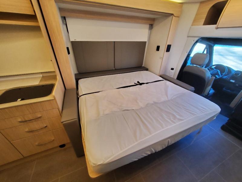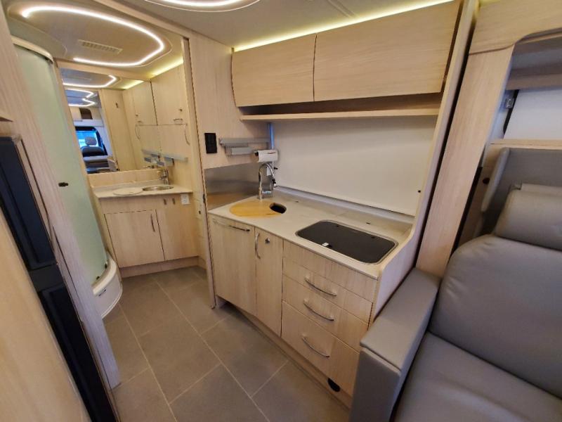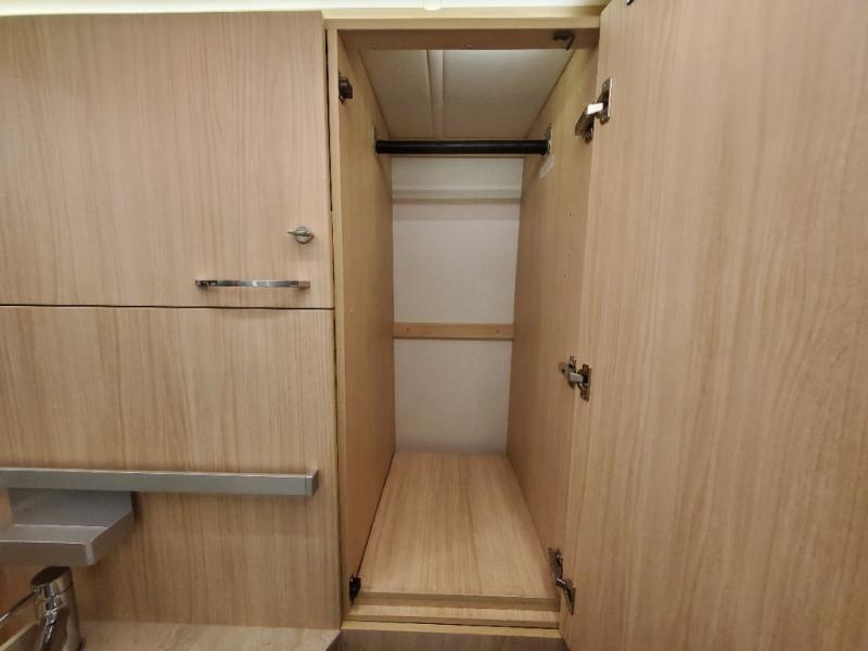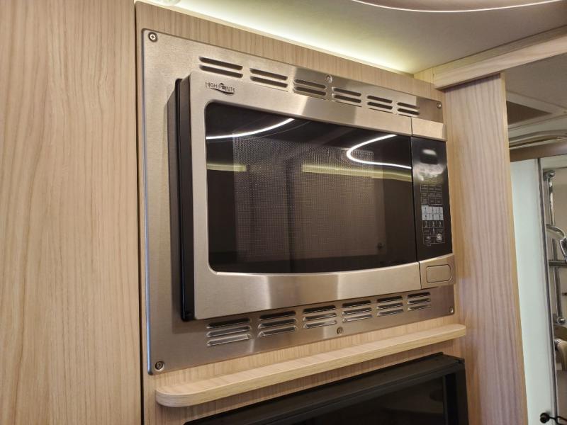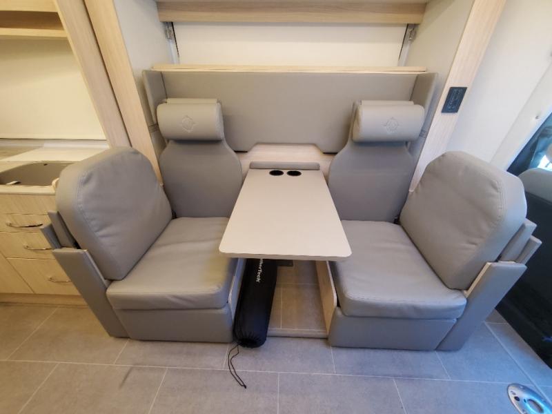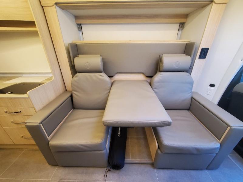 Traveling will be convenient and comfortable with this versatile Murphy bed/lounge slide unit at your fingertips. During the day once parked, you can easily seat four with the lounge chairs including a table between as well as having your driver and passenger seats swiveled around. This is a great place for hosting family or friends at your campsite or event. At night, the lounge seating is hidden as you flip-down the Murphy bed for a comfortable night's rest. In the morning, tuck it all away to bring back your living space. You will also enjoy the convenient kitchen amenities in place so you can easily whip up a meal or snack while you are stopped, and for overnight you can get refreshed for a new day in the rear bath featuring a radius shower with skylight, a sink, and closet space for your things.