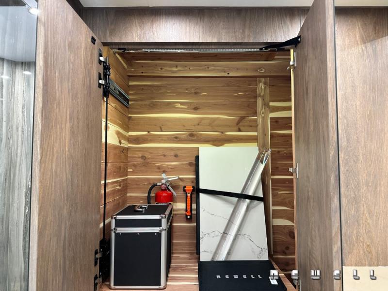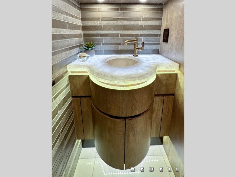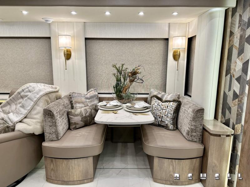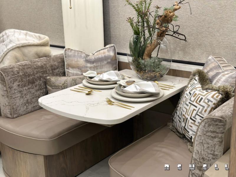 Expandable dinette with premium leather seating and porcelain topPremium quartz countertops at galley with waterfall edge